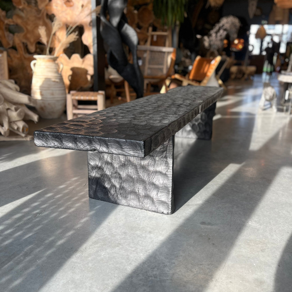 Le litchi, un bois exotique prisé, est méticuleusement martelé. Cette technique artisanale confère au banc une beauté rustique tout en conservant une touche de modernité grâce à sa finition noire élégante.