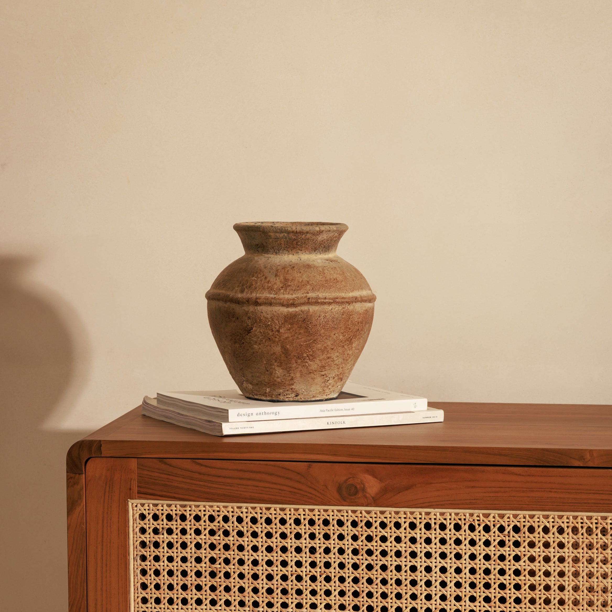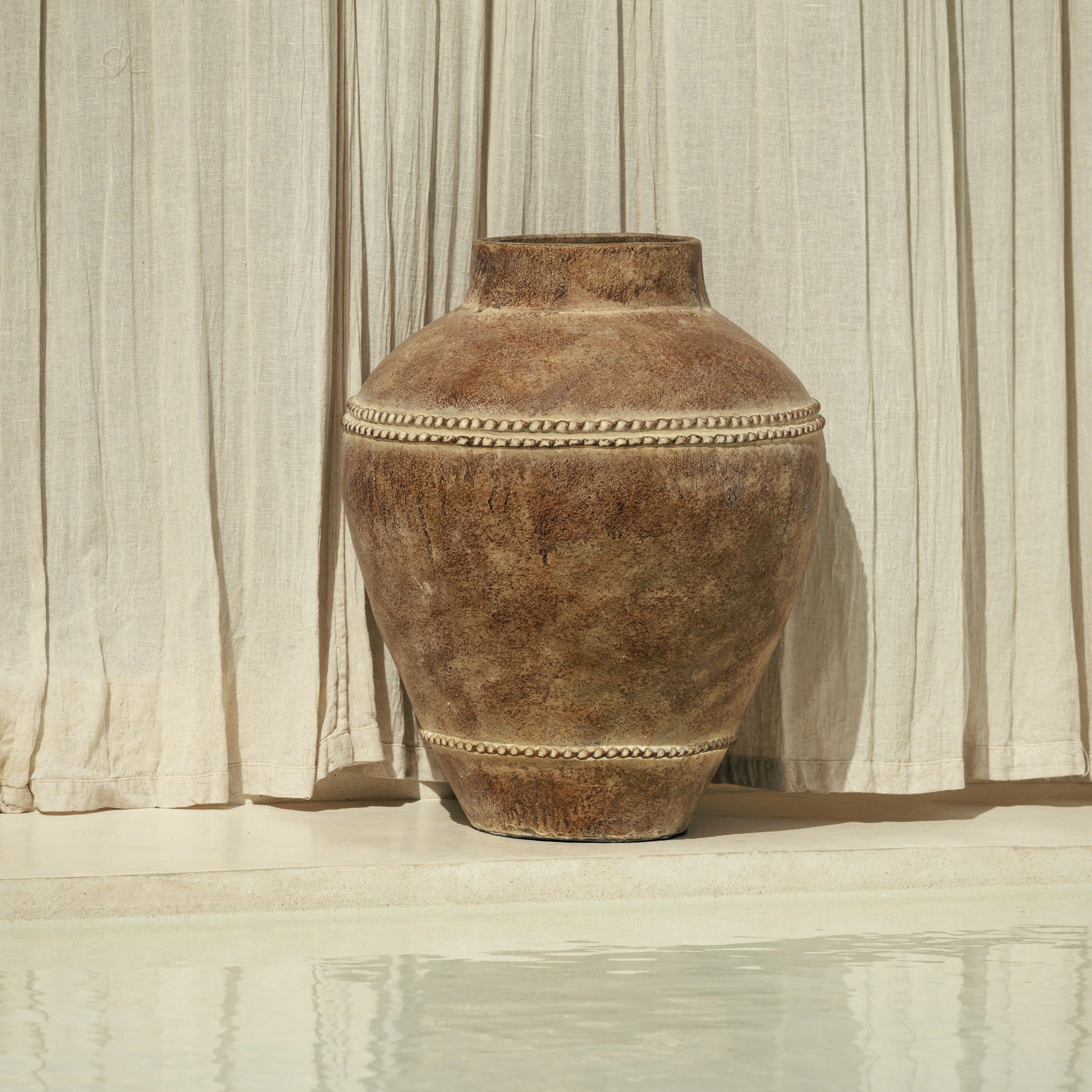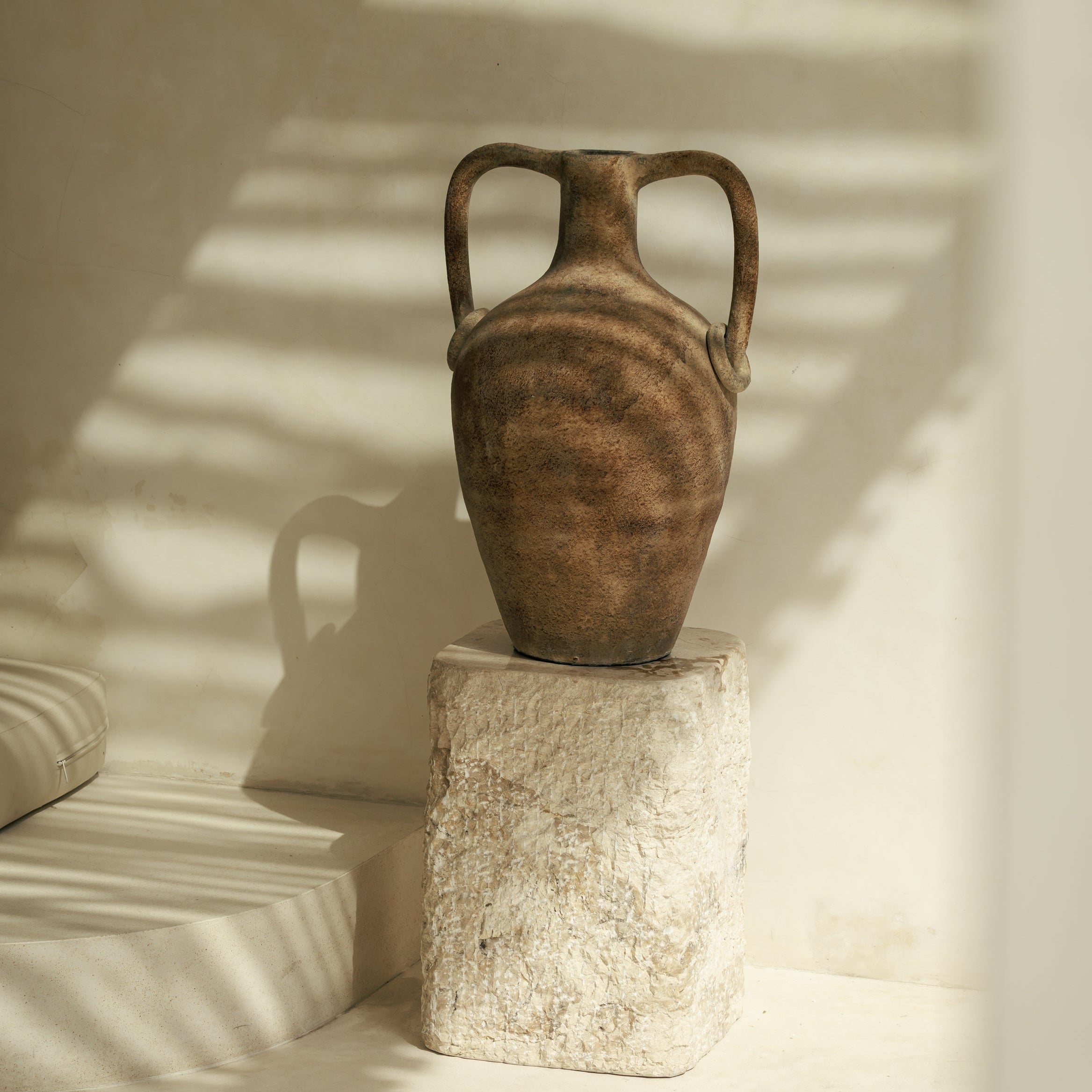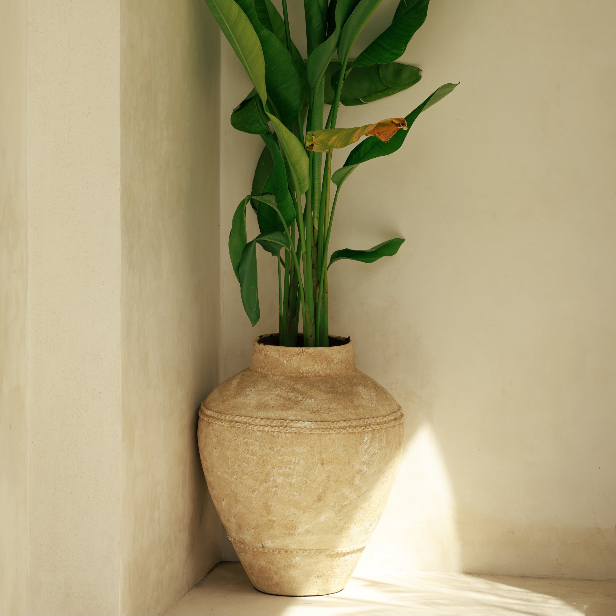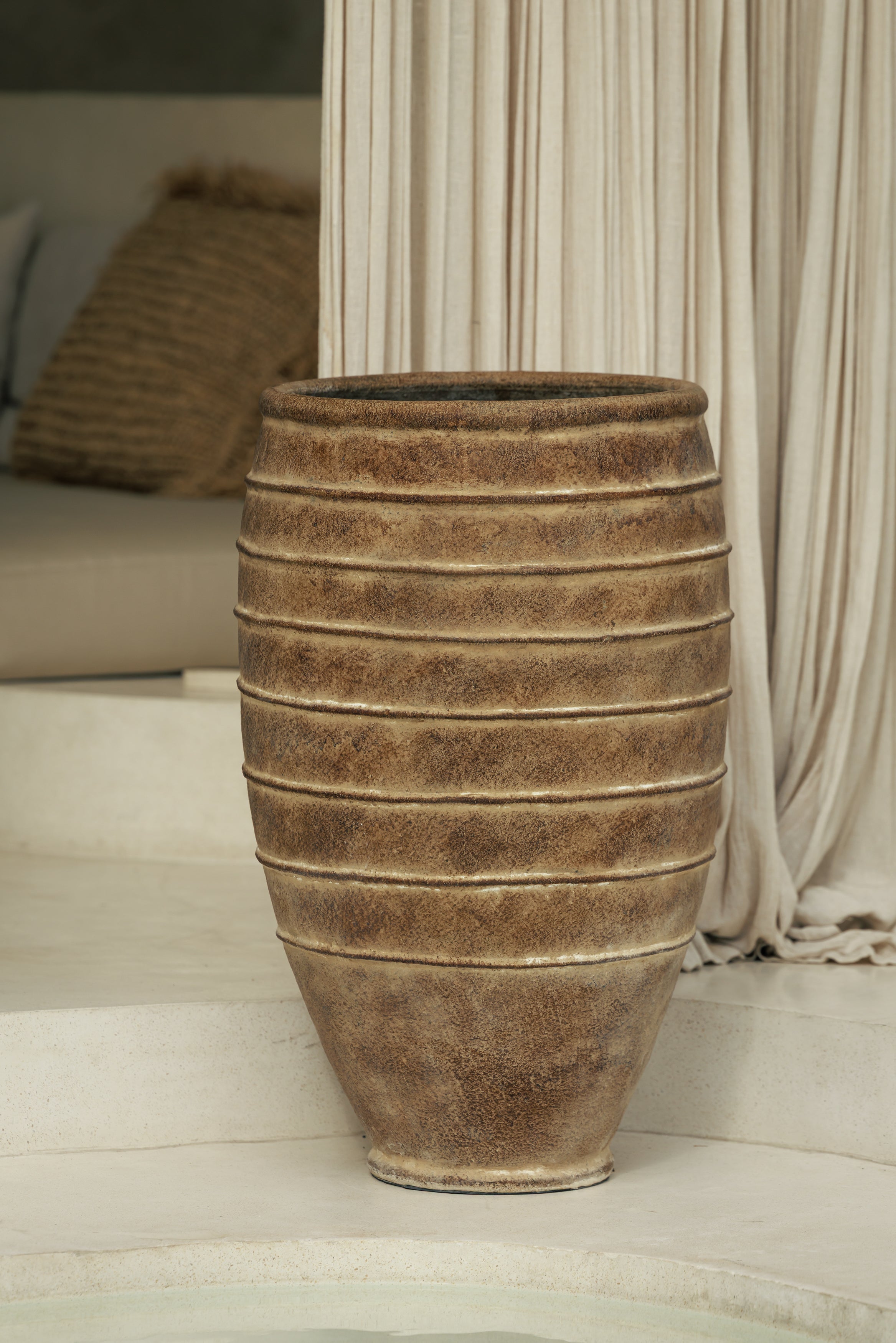 Le pot Noah en terracotta trouve naturellement sa place dans les intérieurs qui aiment les pièces fortes sans ostentation. Posé au sol, il installe une présence chaleureuse grâce à sa finition antique et à ses nuances minérales qui rappellent les terres patinées par le temps. Sa silhouette généreuse apporte du rythme à l’espace, que ce soit dans une entrée, un salon ou près d’une baie vitrée, là où la lumière vient révéler la matière. Pensé comme un objet décoratif à part entière, il accueille aussi bien quelques branches sèches que de grandes tiges naturelles, devenant un véritable point d’ancrage visuel entre esprit brut et élégance intemporelle.
