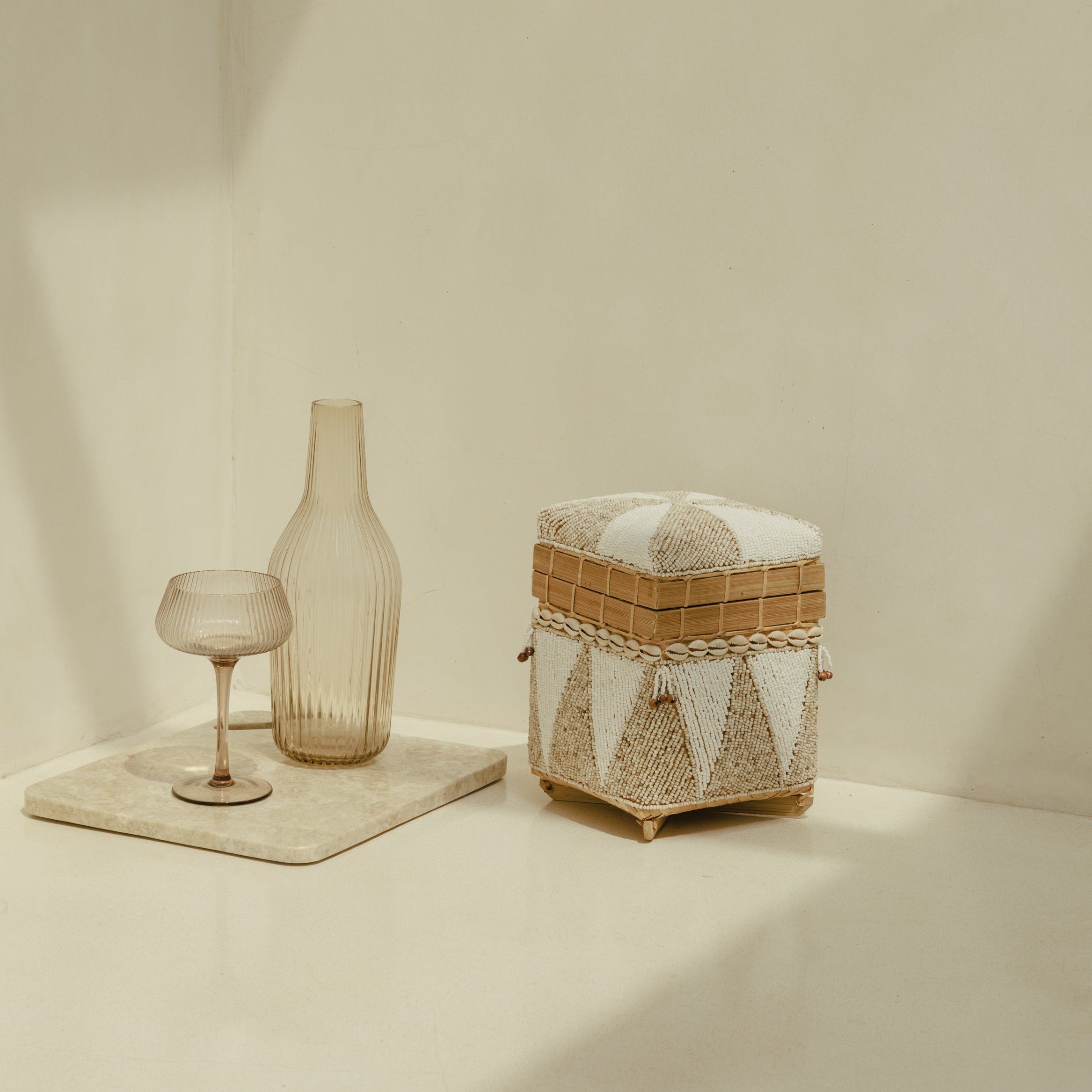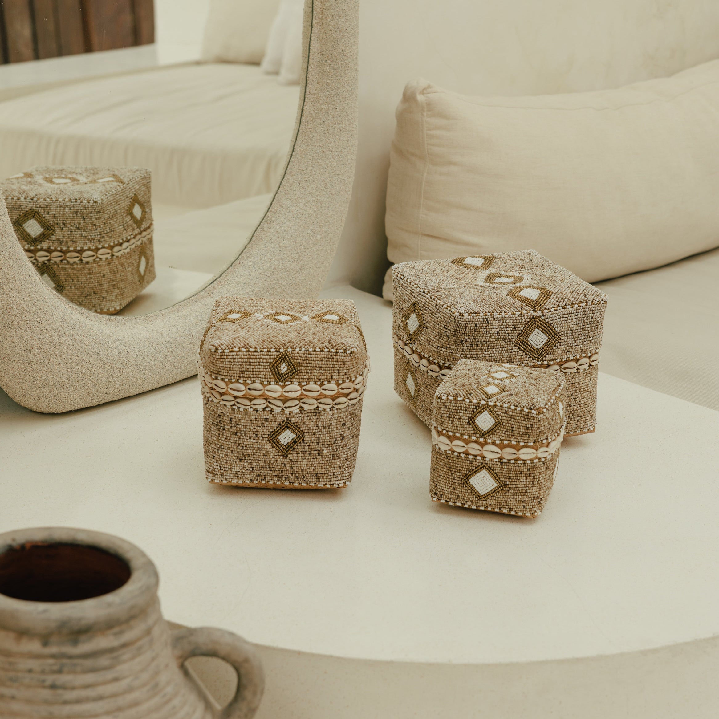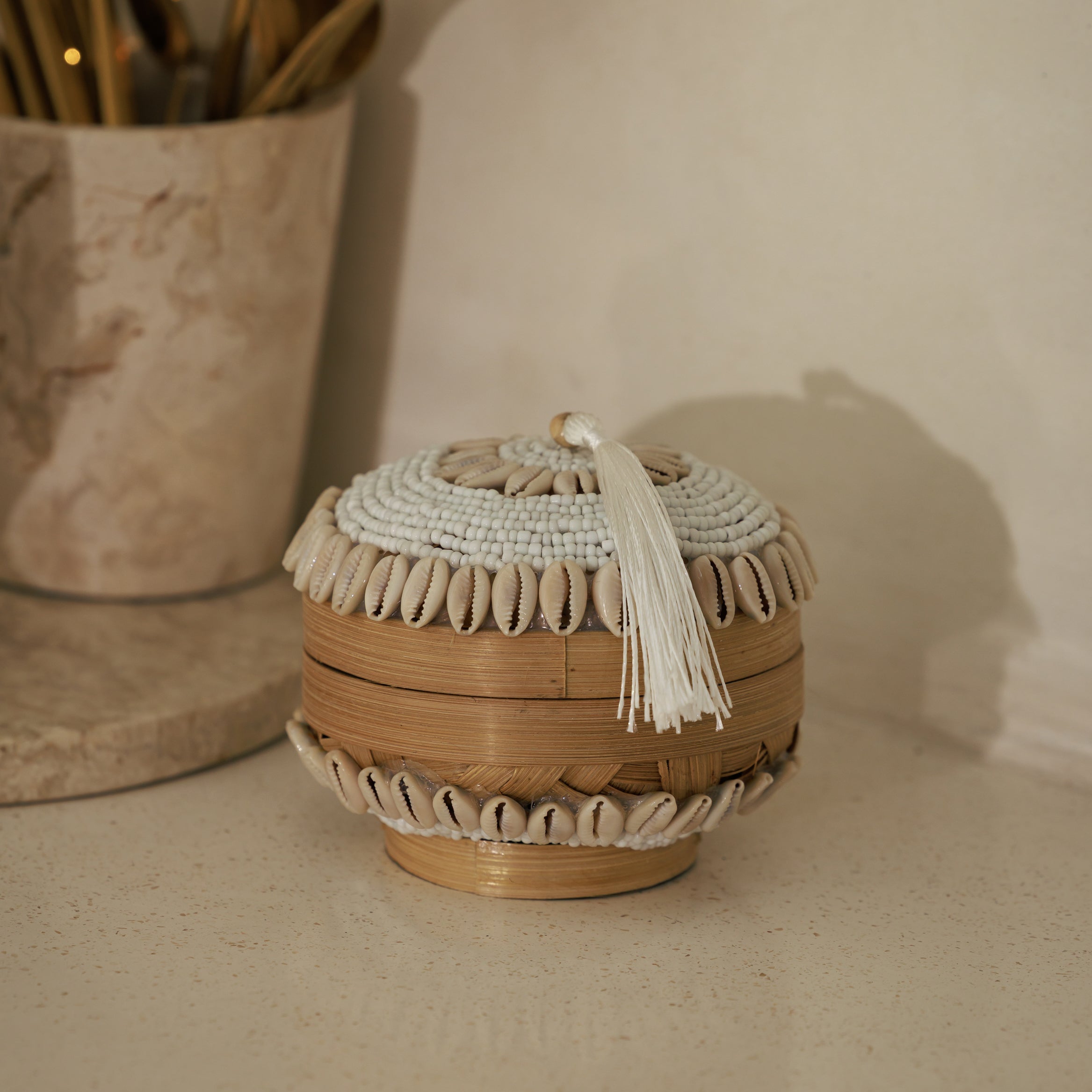 Née des traditions balinaises, la boîte à offrande Tuhan porte en elle l’élégance du geste et la beauté du temps accordé à la matière. Tressée à la main en bambou naturel et délicatement ornée de coquillages, elle capte la lumière avec douceur et installe une atmosphère paisible, presque cérémonielle. Posée sur une console, une étagère ou une table basse, elle devient un objet de contemplation, un accent décoratif chargé de sens, où l’artisanat dialogue avec la poésie des intérieurs inspirés par le voyage et la lenteur.