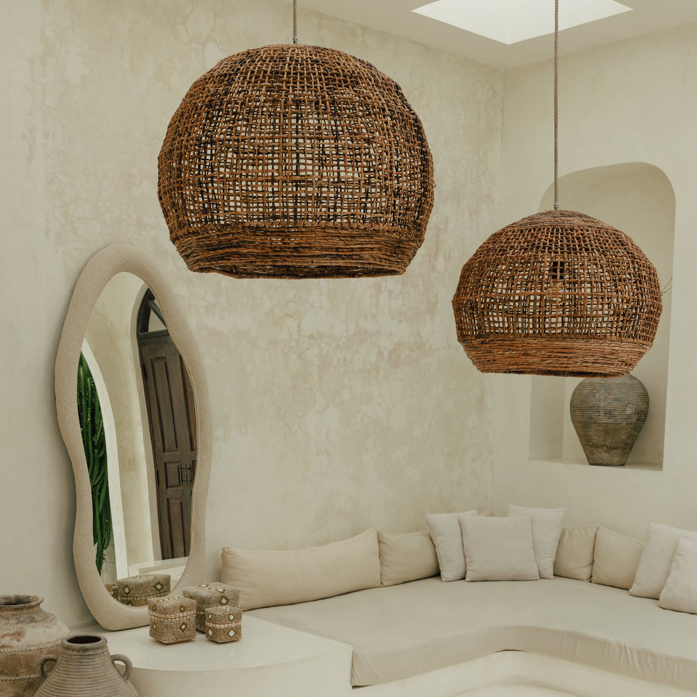 Née du savoir-faire balinais, la Suspension Kurang incarne l’alliance parfaite entre matière naturelle et design contemporain. Façonnée à la main en fibres de bananier, elle combine densité et transparence pour créer un jeu d’ombres subtil et chaleureux. Ses lignes verticales structurent l’espace sans l’alourdir. Sa présence naturelle apporte une touche organique et contemporaine à tout intérieur, du salon au hall d’hôtel. Chaque pièce est unique, façonnée avec précision par des artisans qui perpétuent un savoir-faire ancien. Aucun détail n’est laissé au hasard, tout repose sur l’équilibre des formes, la tension du tressage et la légèreté de la lumière.