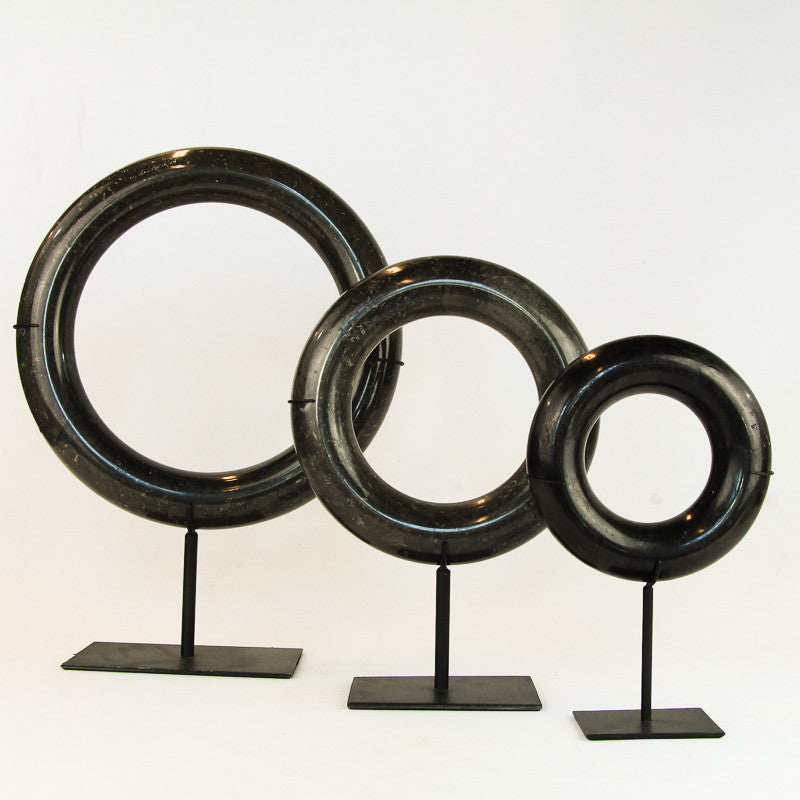 Découvrez l'élégance intemporelle des Anneaux en Marbre Noir sur Socle, façonnés à la main avec expertise à Bali, en Indonésie. Ces pièces d'artisanat exquises apportent une touche de sophistication et de raffinement à votre espace intérieur.