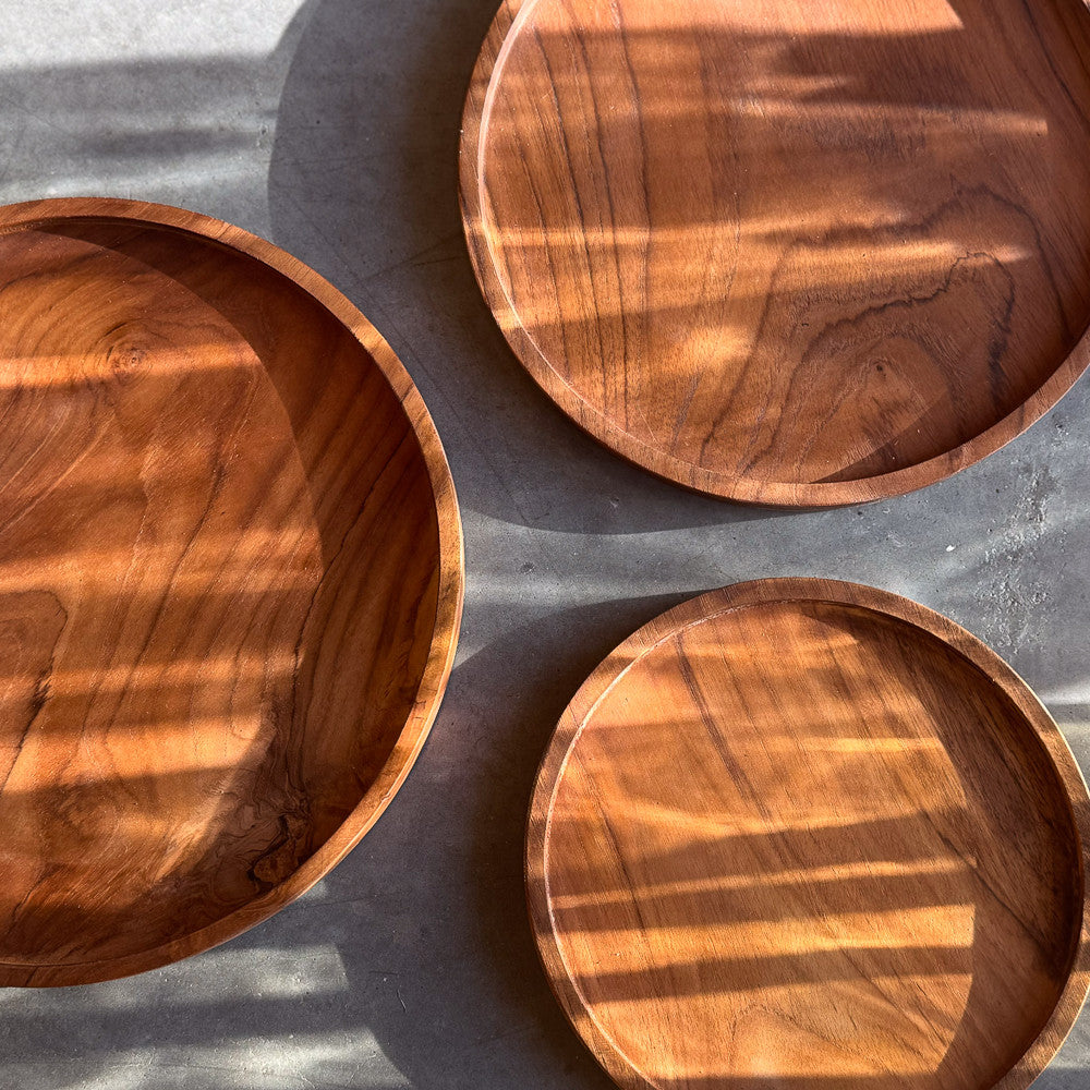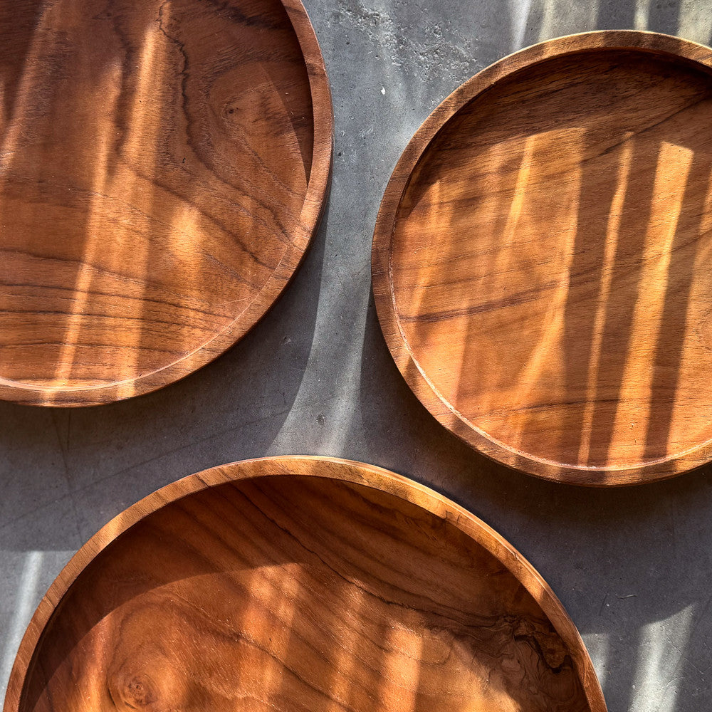 Assiettes rondes en bois de teck naturel, façonnées à la main, disponibles en trois tailles. Ces pièces uniques allient charme artisanal et praticité, car elles sont compatibles avec le lave-vaisselle.