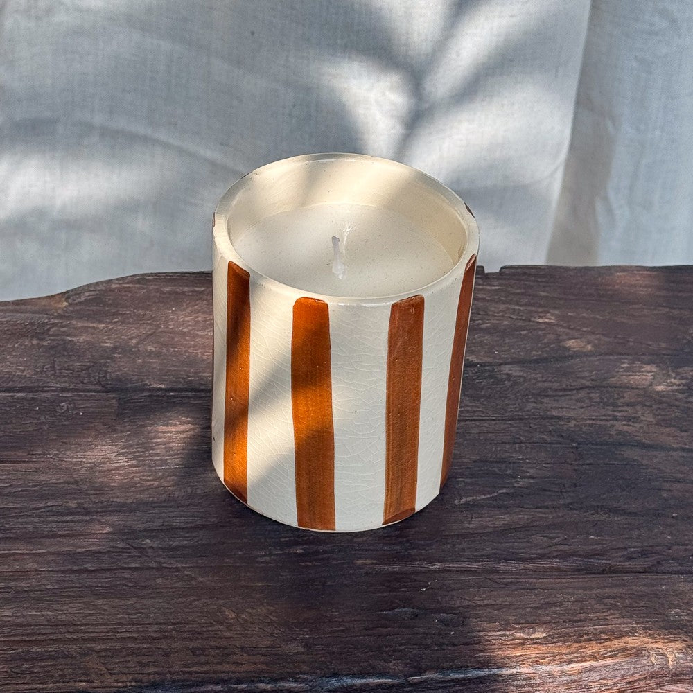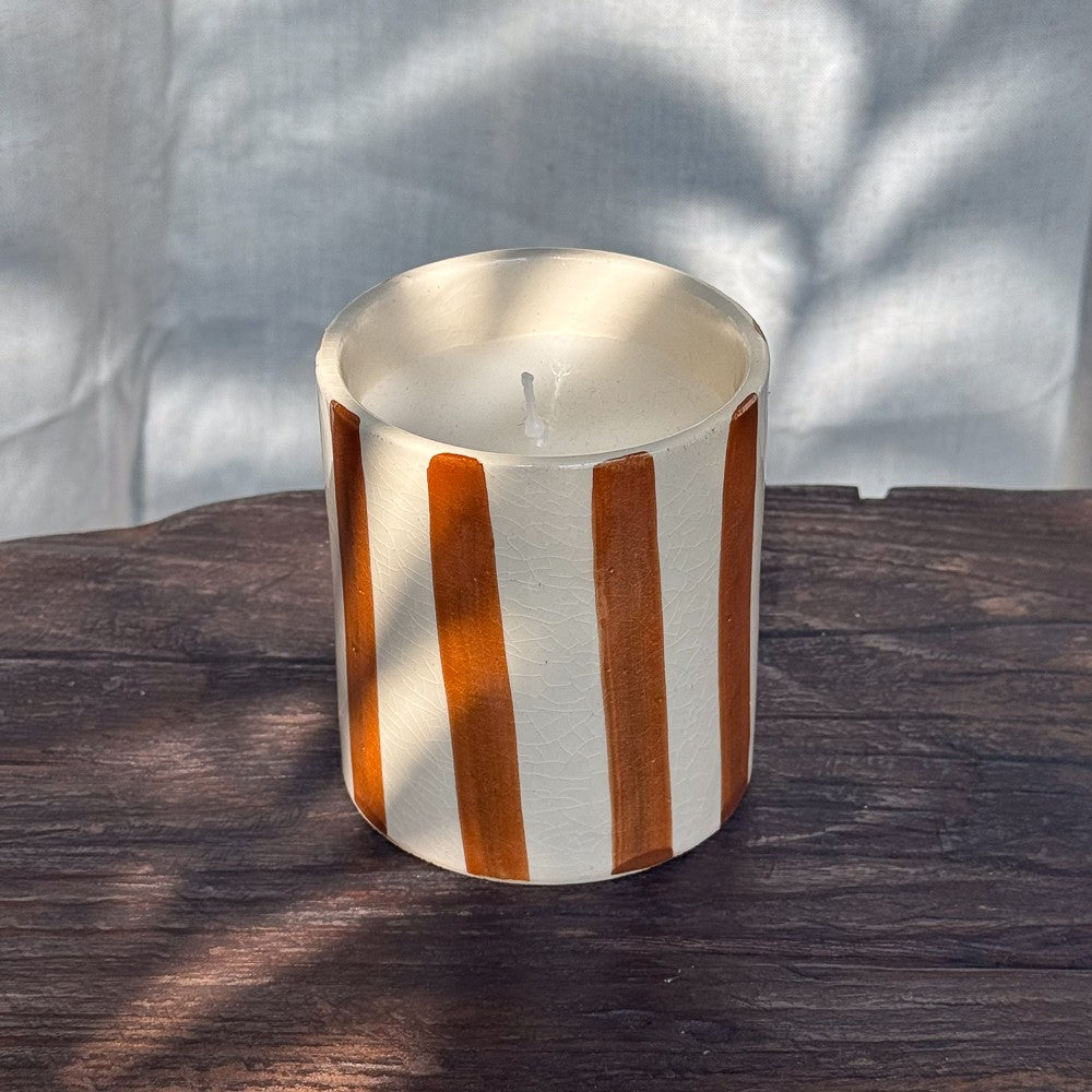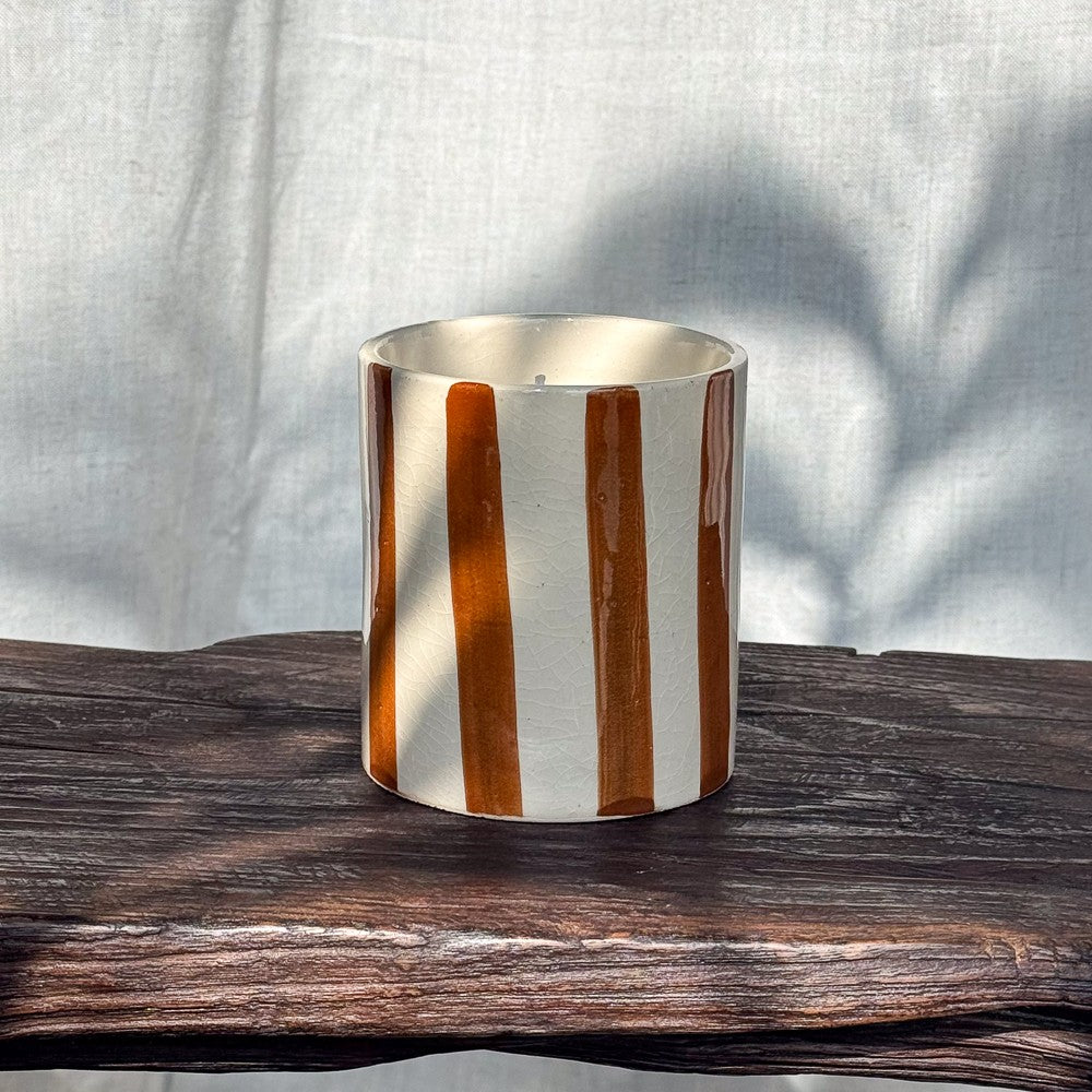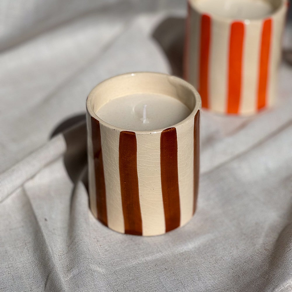 Une bougie artisanale en céramique, élégamment décorée de lignes marrons. Coulée à la main avec une cire naturelle parfumée à la fleur d’oranger, elle diffuse une atmosphère douce et chaleureuse. Une fois consumée, son contenant peut être réutilisé comme pot décoratif, tasse ou objet du quotidien.