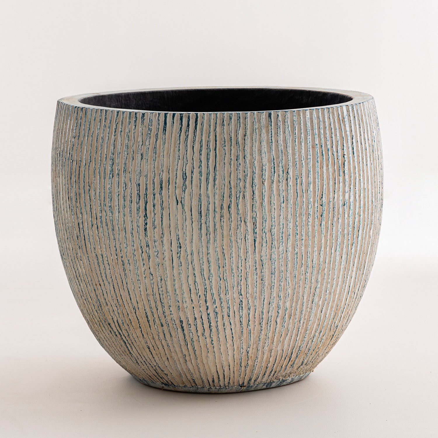 Cache-pot en bois de cocotier avec une finition striée et teintée de bleu. Un pot artisanale élégant pour sublimer vos plantes et apporter une touche naturelle et moderne à votre espace.