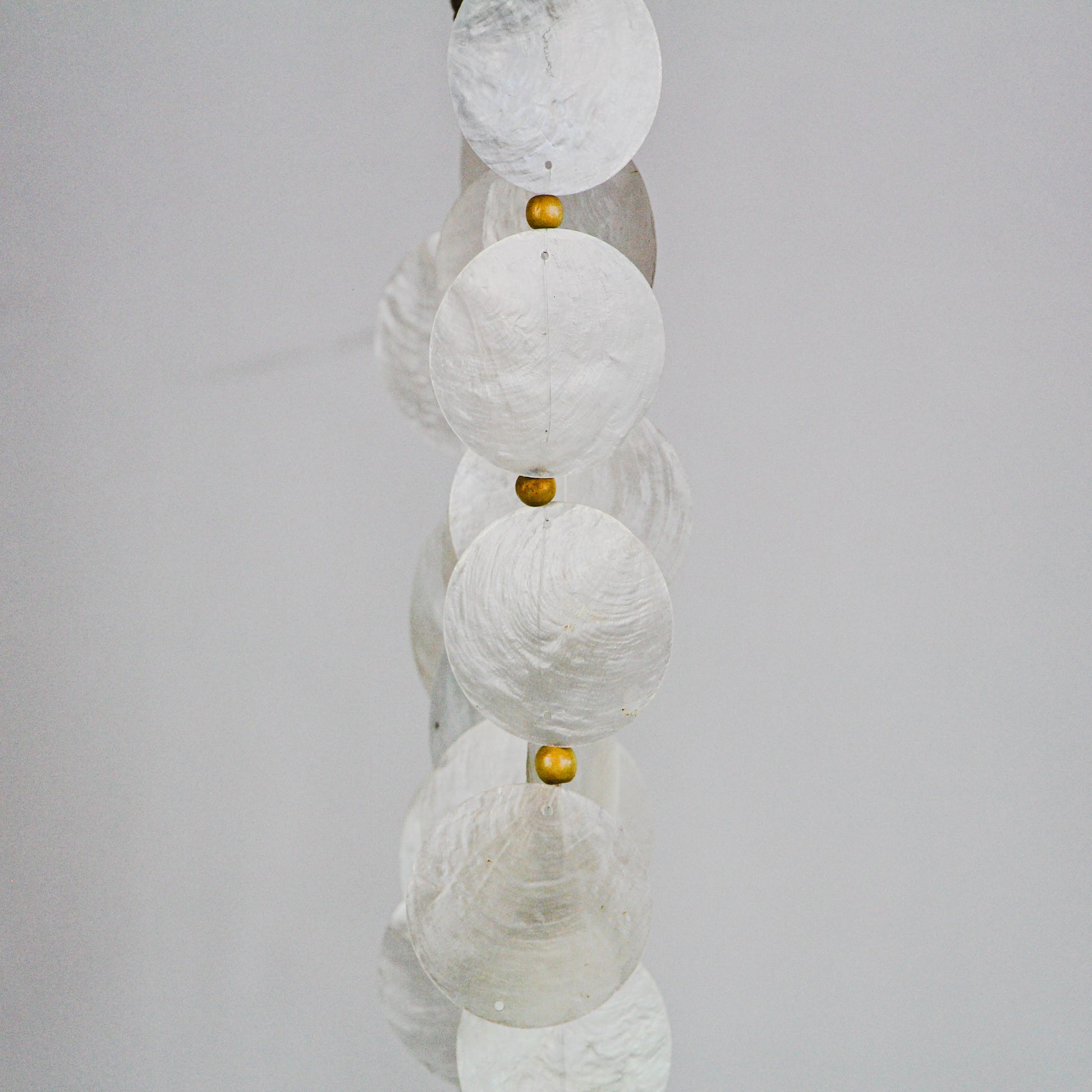 Le raphia, finement travaillé, offre une texture naturelle et une nuance terrestre qui contraste magnifiquement avec l'éclat irisé des coquillages de Capiz.