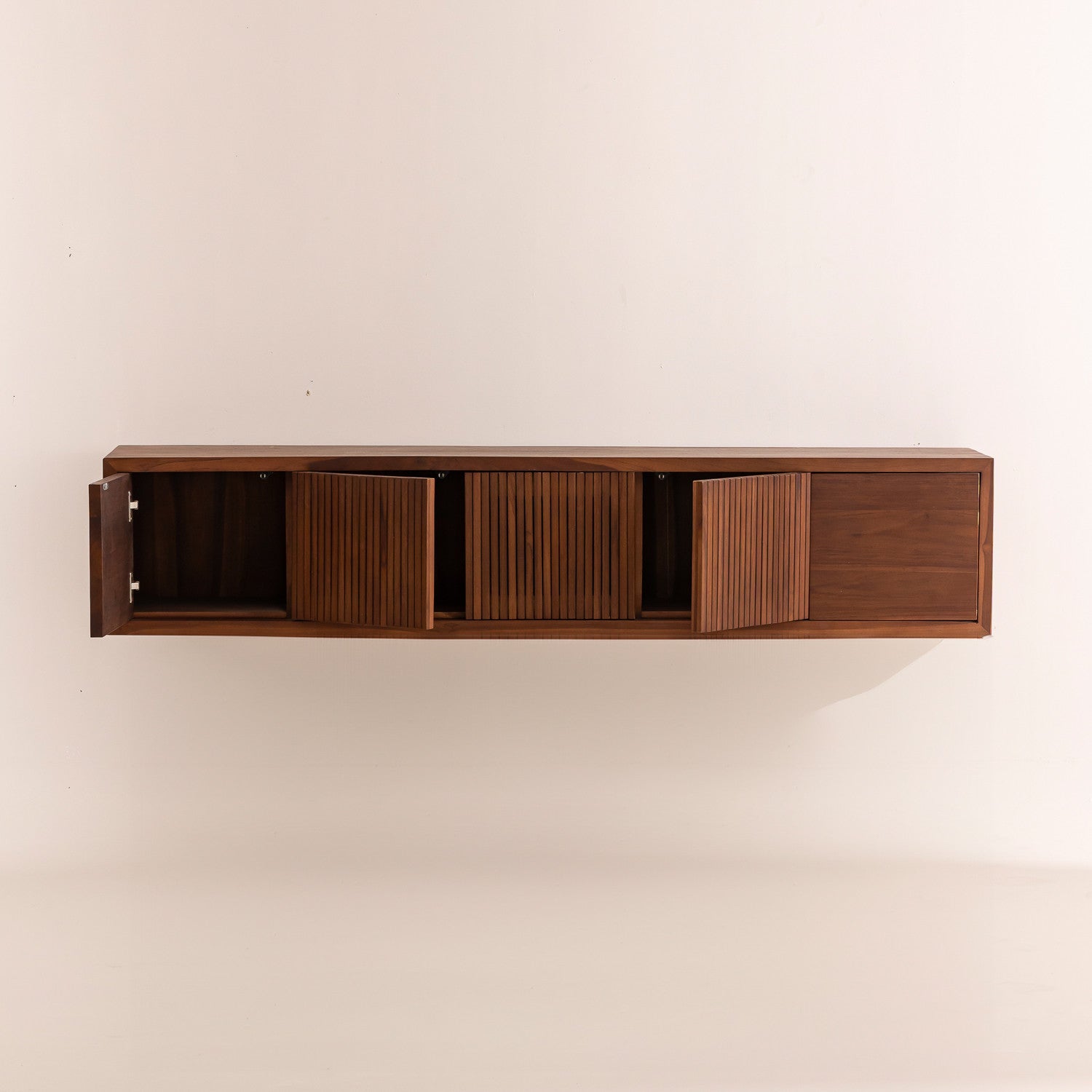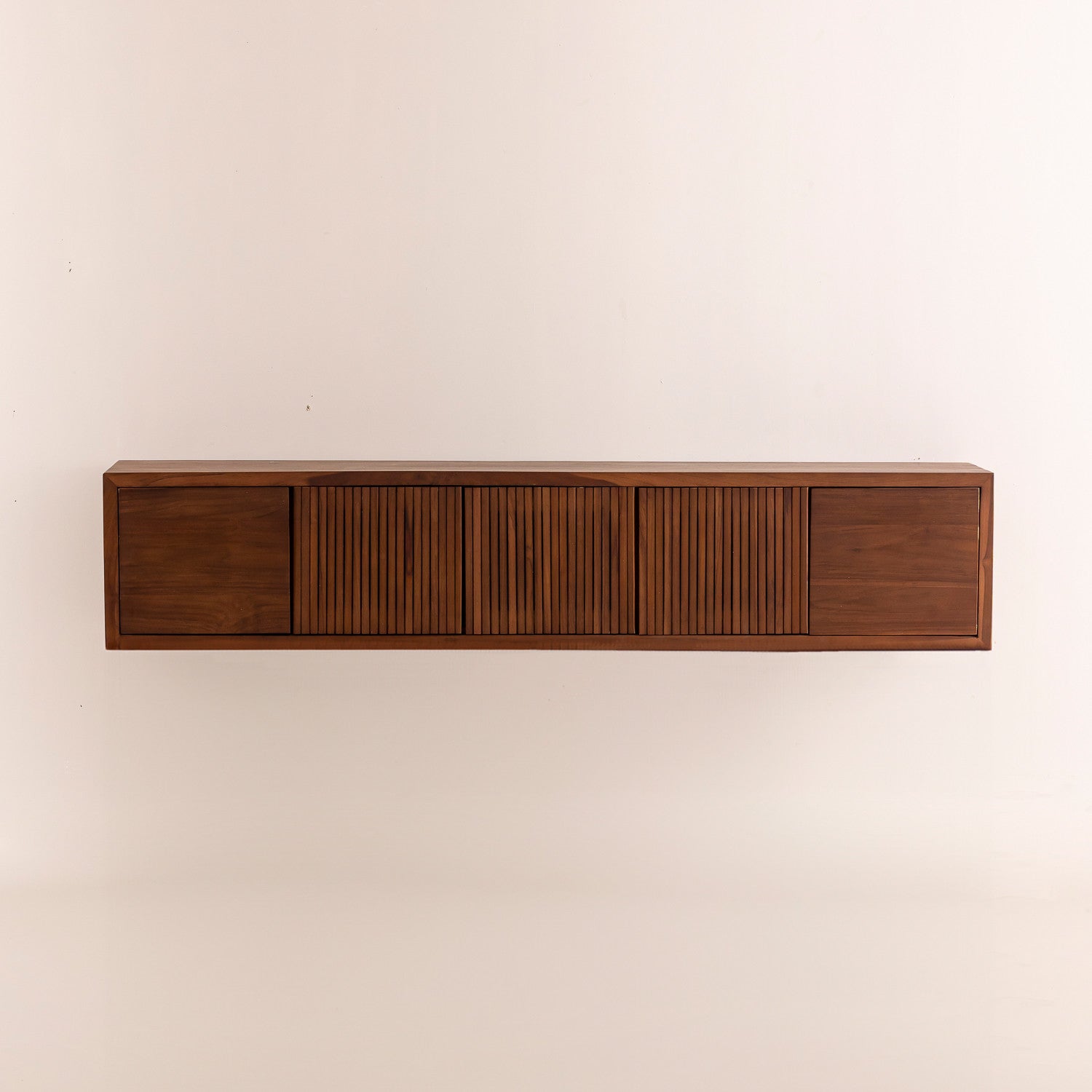 Le meuble TV suspendu en teck s’intègre parfaitement dans une décoration moderne et épurée. Grâce à sa suspension, il libère de l'espace au sol. Avec ses 5 portes, il offre un rangement pratique pour les objets du quotidien, tout en étant esthétiquement plaisant grâce à la beauté naturelle du teck. La finition de haute qualité du bois permet de mettre en valeur ses veines et sa texture, créant un effet de chaleur et d’authenticité. Ce meuble est idéal pour les salons ou les espaces de vie où l’espace et l’élégance sont essentiels.