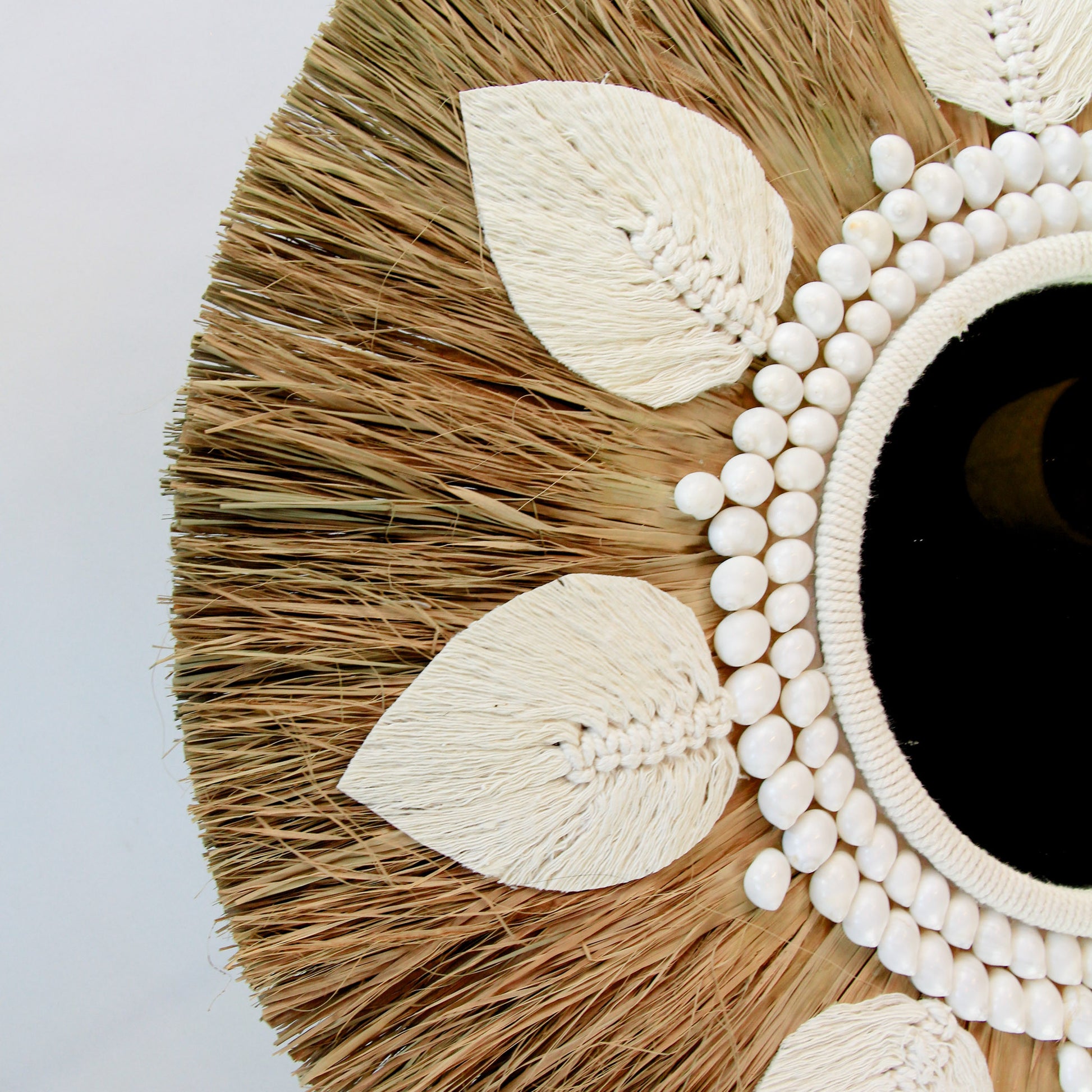 Découvrez la beauté naturelle de notre miroir rond, délicatement orné de coquillages et herbier marin, une création artisanale venue directement d'Indonésie.