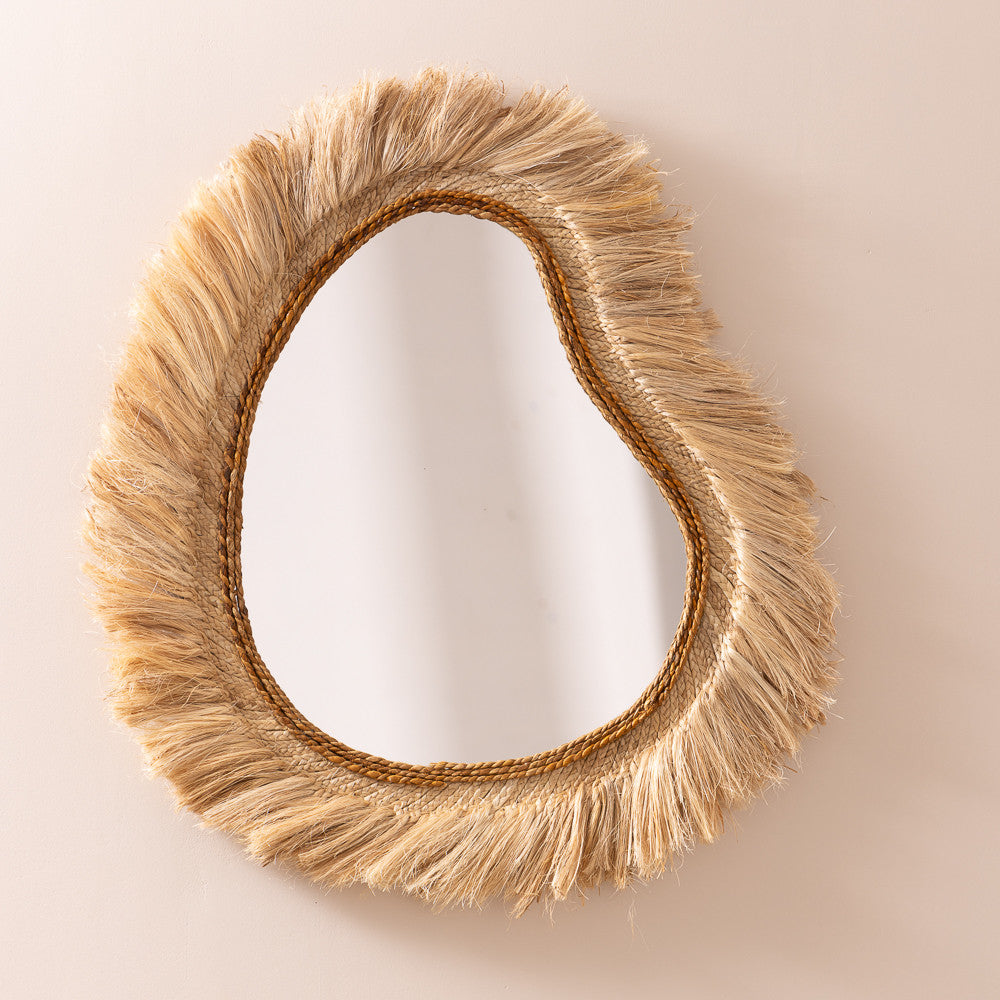 Le miroir organique Wesi, fabriqué en fibre naturelle d'abaca idéal pour une déco bohème et chaleureuse.