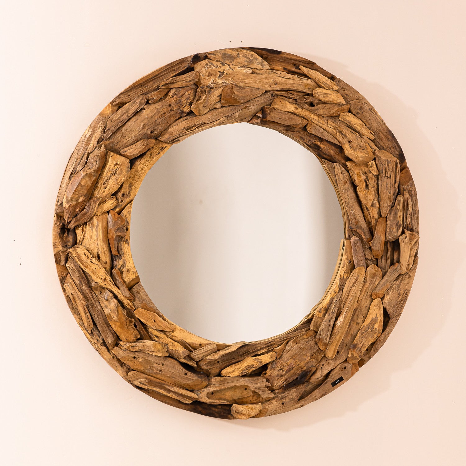 Ce miroir rond en bois recyclé est une véritable œuvre artisanale. Son cadre est constitué de morceaux de bois soigneusement sélectionnés et assemblés pour offrir un design unique, où chaque pièce de bois raconte une histoire.