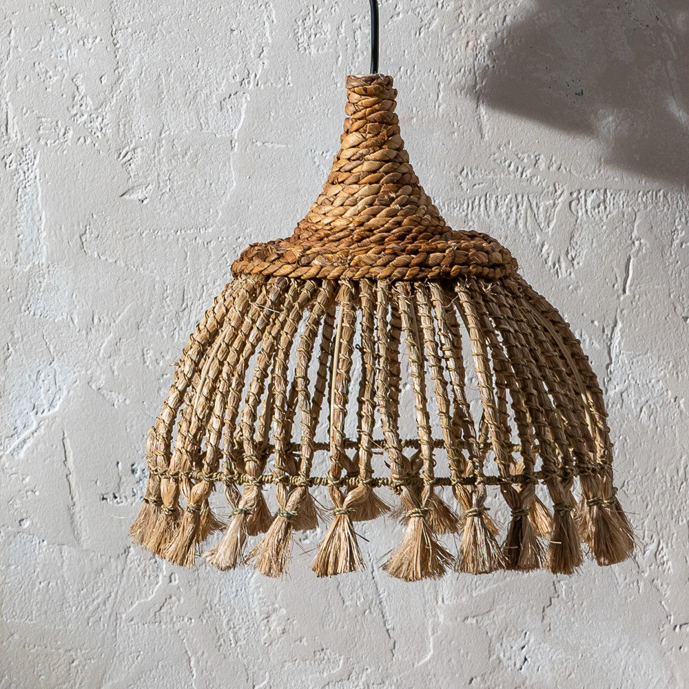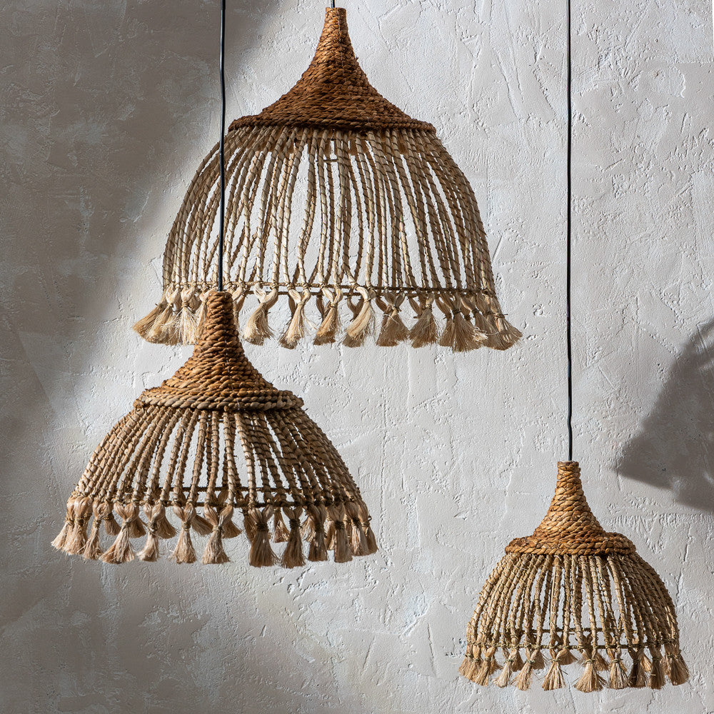 Suspension Andaru en fibre naturelle tressée avec pompons décoratifs, disponible en trois tailles. Idéale pour un intérieur chaleureux et bohème.