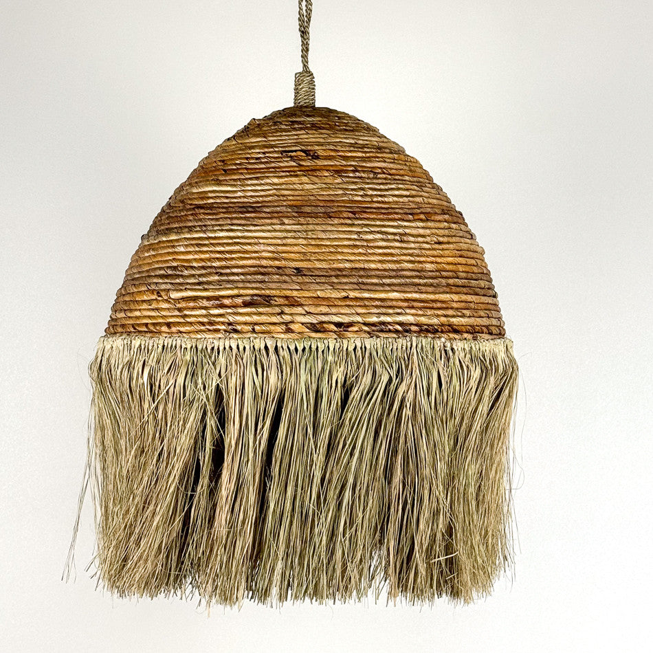 La Suspension luminaire "Aurora" est une pièce artisanale qui ajoutera une touche exotique et naturelle à votre espace de vie. Fabriquée à la main à partir de feuilles de bananier, cette suspension se distingue par son design unique et sa texture organique.
