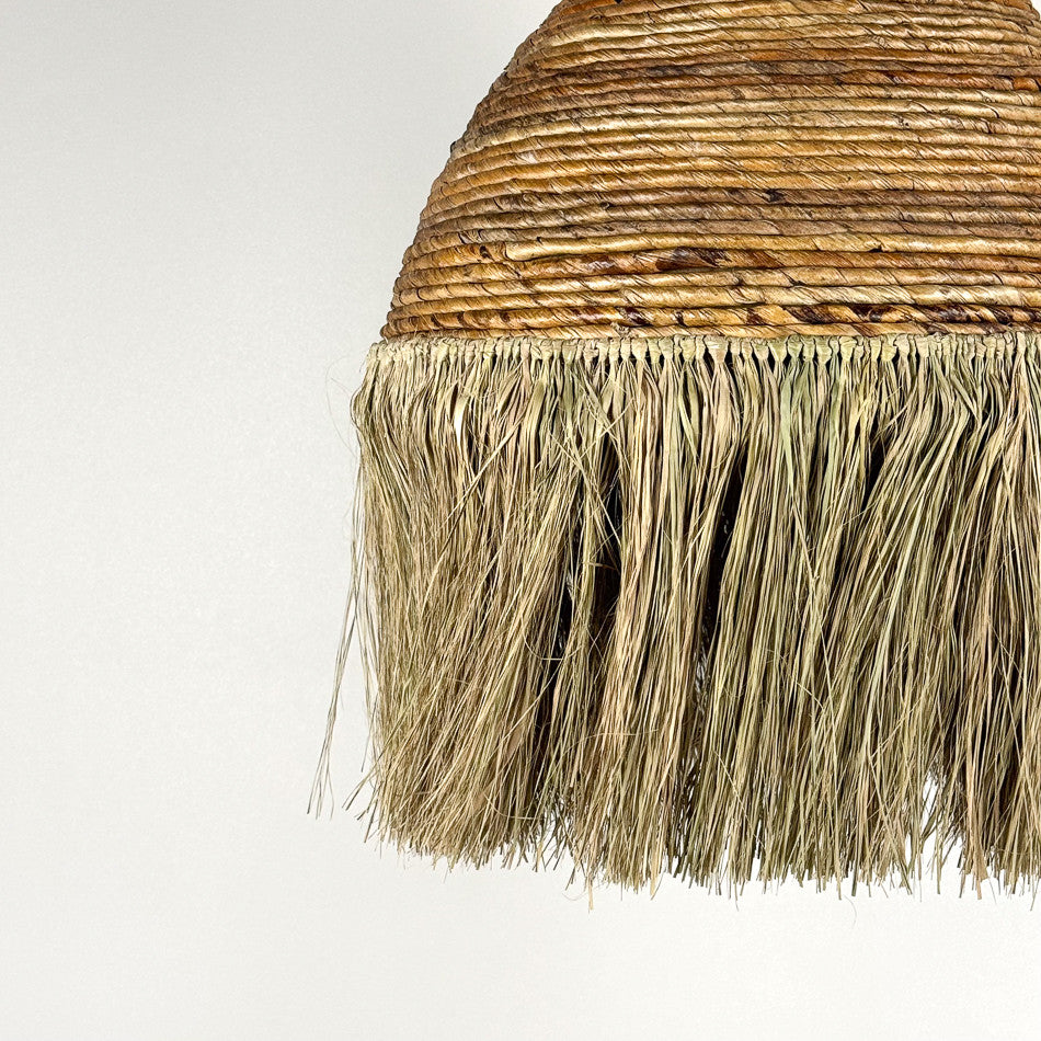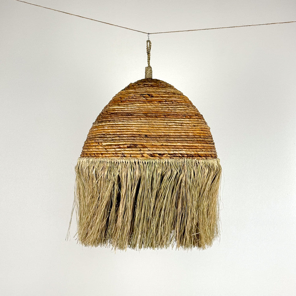 Cette suspension est caractérisée par ses franges délicates et son allure rustique, offrant une esthétique qui complète parfaitement une décoration bohème ou naturelle.