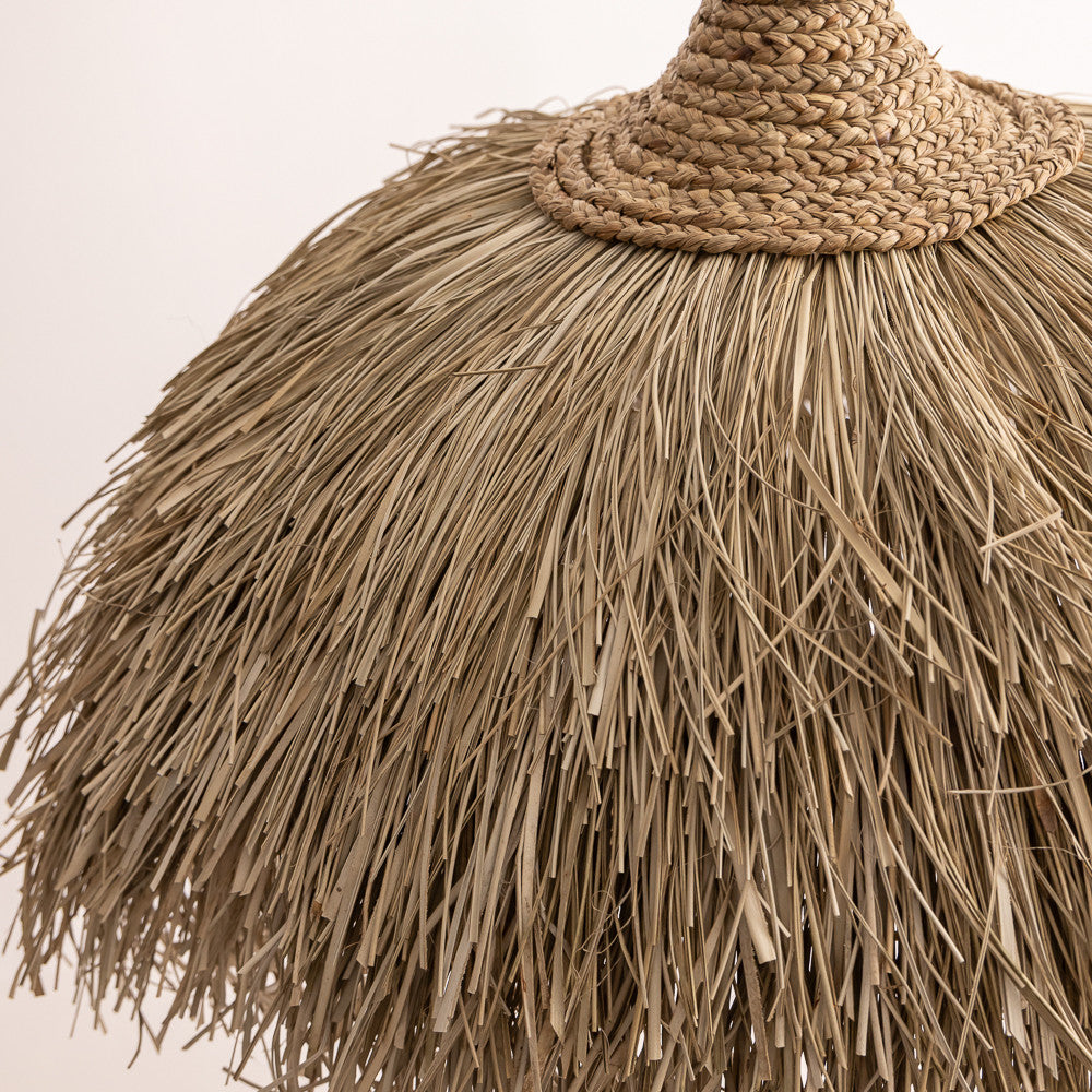 Suspension artisanale Sasak en herbier marin, idéale pour une décoration naturelle et chaleureuse. Cette pièce unique diffuse une lumière douce pour créer une ambiance apaisante dans n'importe quel intérieur.