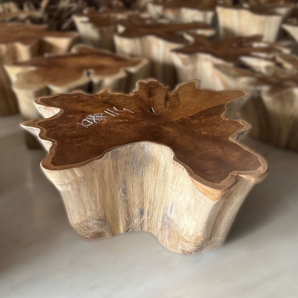 Chaque table basse en bois de teck est une oeuvre organique façonnée par la nature : vous recevez un meuble unique aux formes brutes et irrégulières.