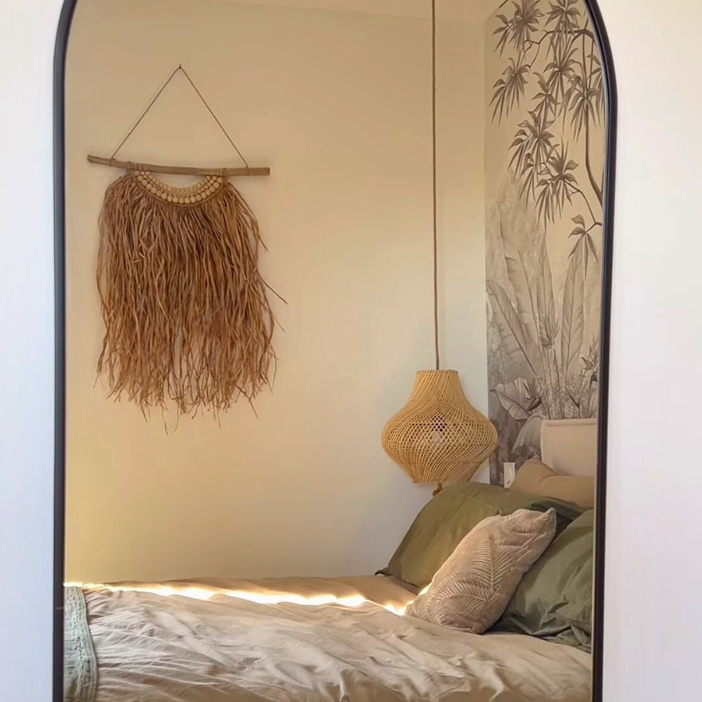 Ornée de bois et de raphia, elle apportera une touche naturelle à votre pièce. Parfaite pour les ambiances bohème chic et wabi-sabi.
