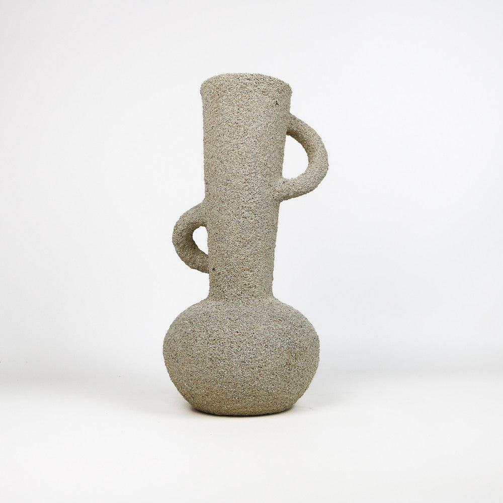 Fabriqué à la main, ce vase est une pièce de décoration remarquable grâce à ses formes organiques et ses poignées sculpturales. Idéal pour mettre en valeur vos fleurs préférées ou simplement comme objet décoratif, ce vase saura attirer l'attention et ajouter une touche artisanale à n'importe quelle pièce.