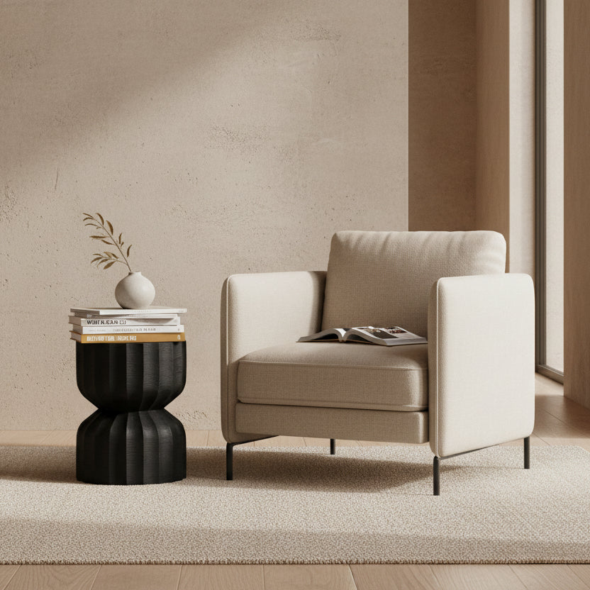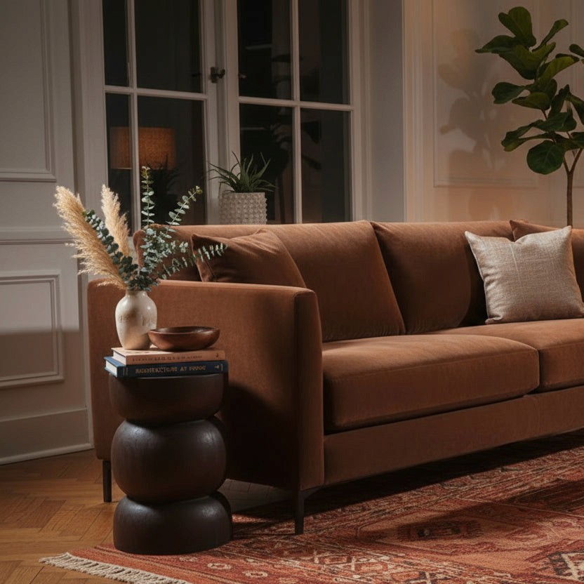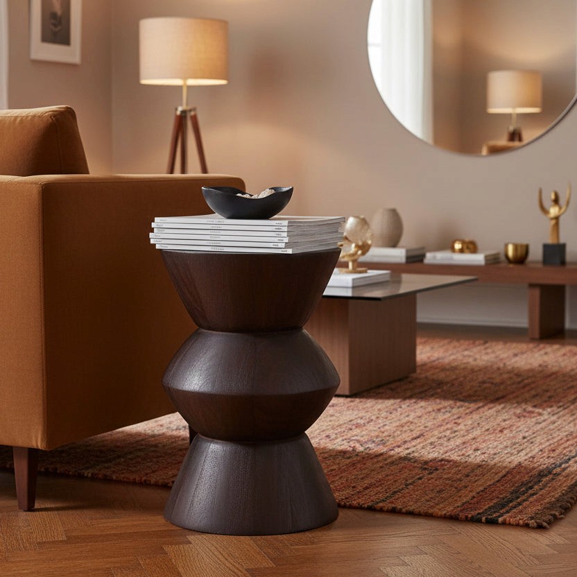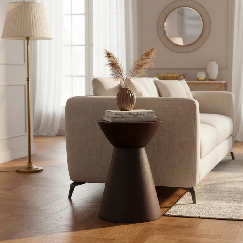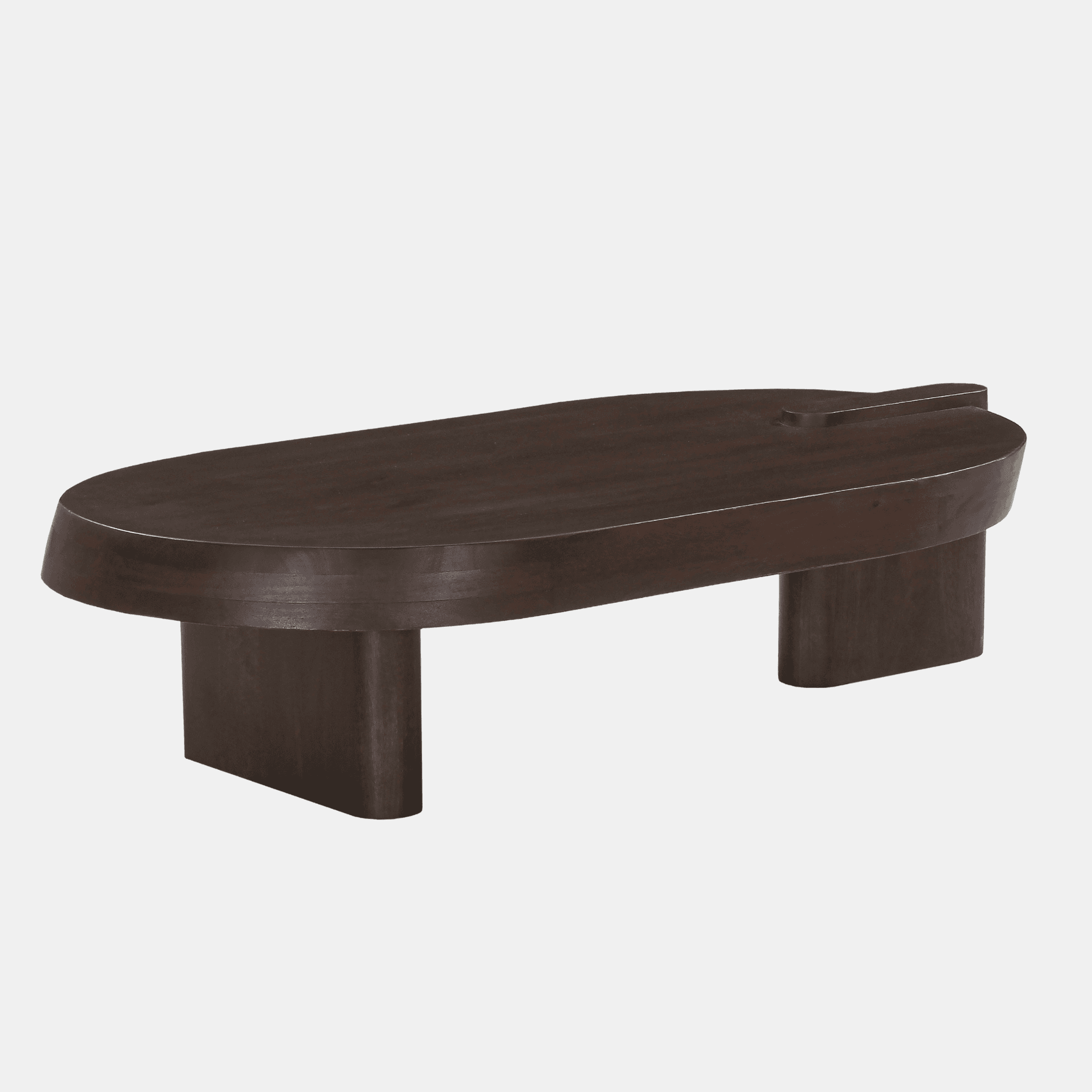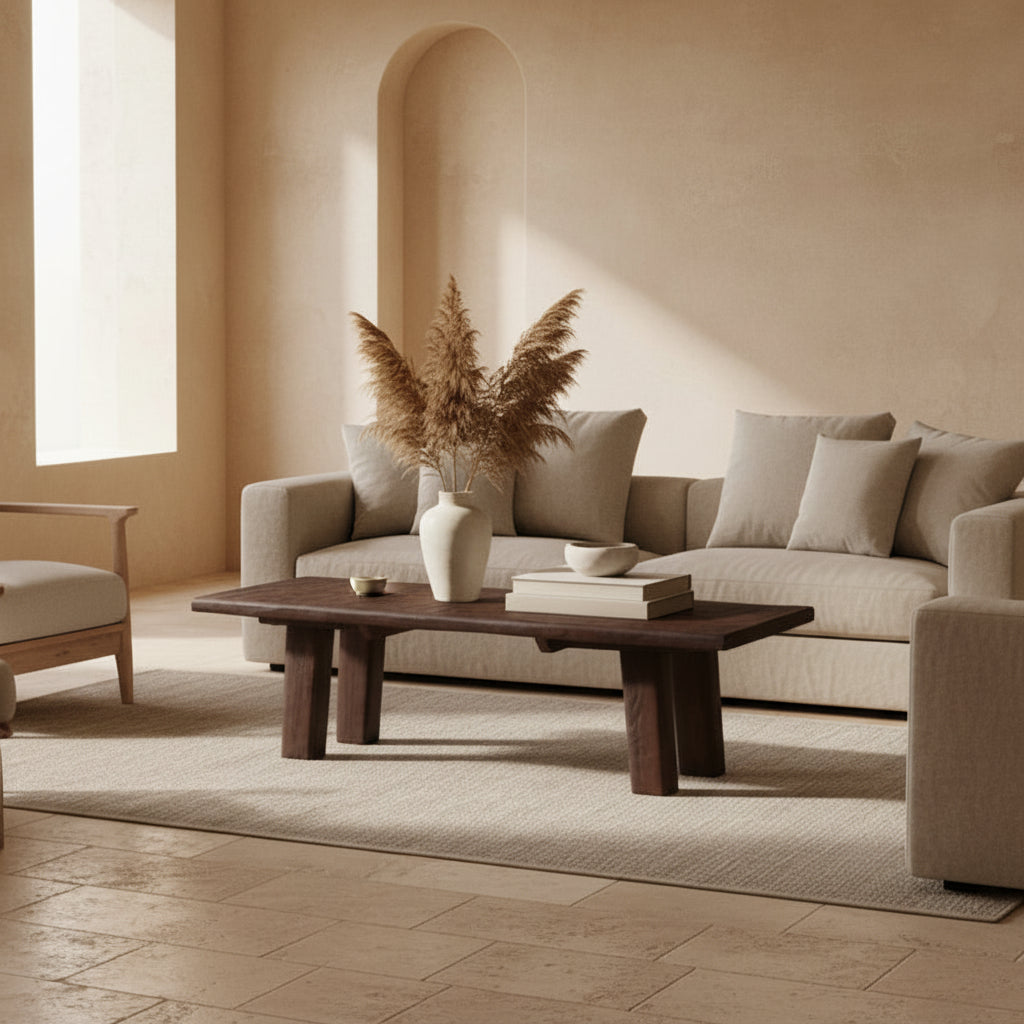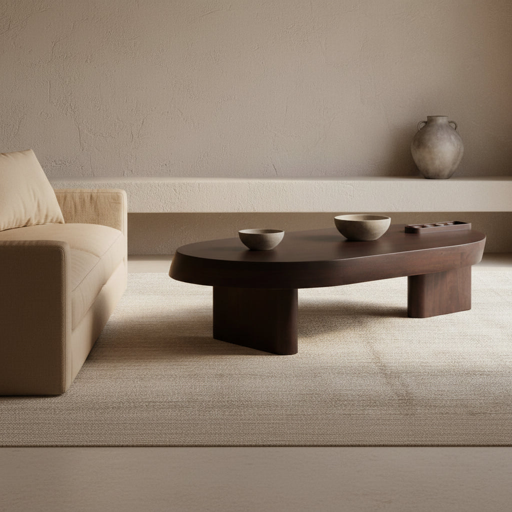 La table basse Mona trouve son équilibre dans une silhouette douce et organique, façonnée dans un bois de manguier au brun profond et délicatement satiné. Sa forme arrondie, presque fluide, évoque les intérieurs Japandi où chaque objet semble respirer naturellement dans l’espace. Au centre du salon, elle devient un véritable point d’ancrage, une pièce qui rassemble et apaise, où les conversations prennent leur temps. Sous la main, le plateau révèle une texture subtile, marquée par la présence de l’artisan, tandis que les pieds pleins inscrivent la table dans une esthétique chaleureuse et contemporaine. Mona s’intègre avec une évidence rare dans les décors minimalistes, bohèmes ou épurés, offrant cette douceur visuelle qui transforme instantanément l’atmosphère d’une pièce. Une table qui structure, réchauffe et inspire.