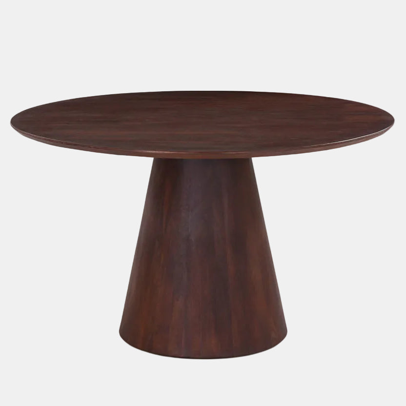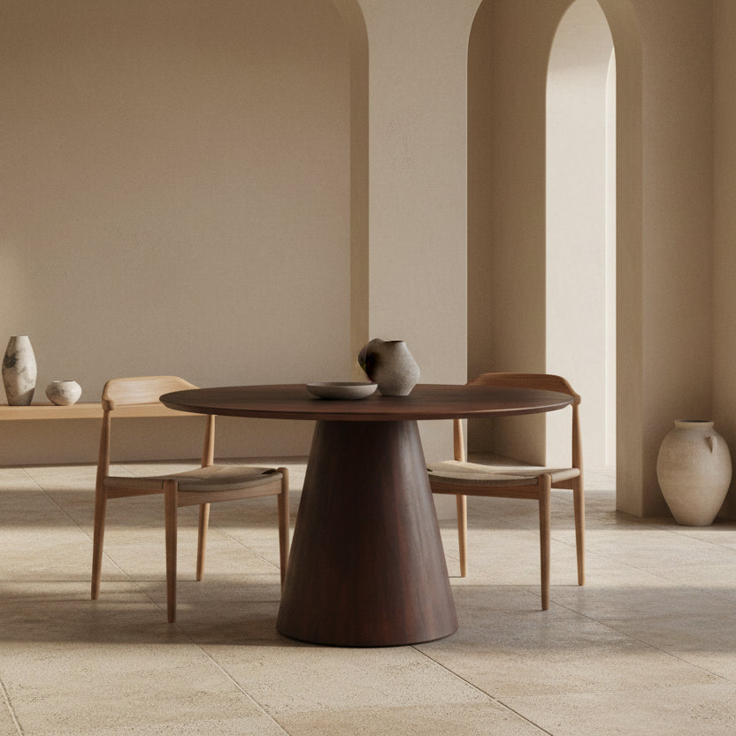 La table ronde Ganga invite à ralentir et à savourer la beauté des moments partagés. Son plateau circulaire, d’un seul geste fluide, repose sur un pied conique sculptural qui lui offre une présence élégante et sereine. Le manguier massif révèle des nuances profondes et un grain vivant qui accroche la lumière comme une matière en mouvement. Sa silhouette douce adoucit l’espace, crée un centre naturel autour duquel les repas se prolongent et les conversations s’installent. Réalisée artisanalement en Inde, chaque table porte ses propres variations, ces subtilités qui rendent chaque pièce unique et authentiquement vivante.