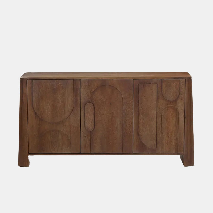 Le buffet Rupa impose d’emblée sa présence, comme une pièce architecturale qui structure l’espace avec élégance. Ses portes sculptées de motifs arrondis dessinent un relief graphique inspiré des codes vintage réinterprétés avec modernité. Sous la lumière, les courbes créent un jeu d’ombres subtil qui fait vibrer la matière. Le manguier massif, teinté d’un brun profond, révèle un grain naturel riche et vivant, empreint du geste de l’artisan. Dans un salon ou une salle à manger, Rupa devient une pièce centrale à la fois esthétique et fonctionnelle, offrant un rangement généreux derrière ses trois portes. Chaque buffet est unique, avec des nuances et détails qui varient légèrement et signent la beauté authentique du travail fait main.