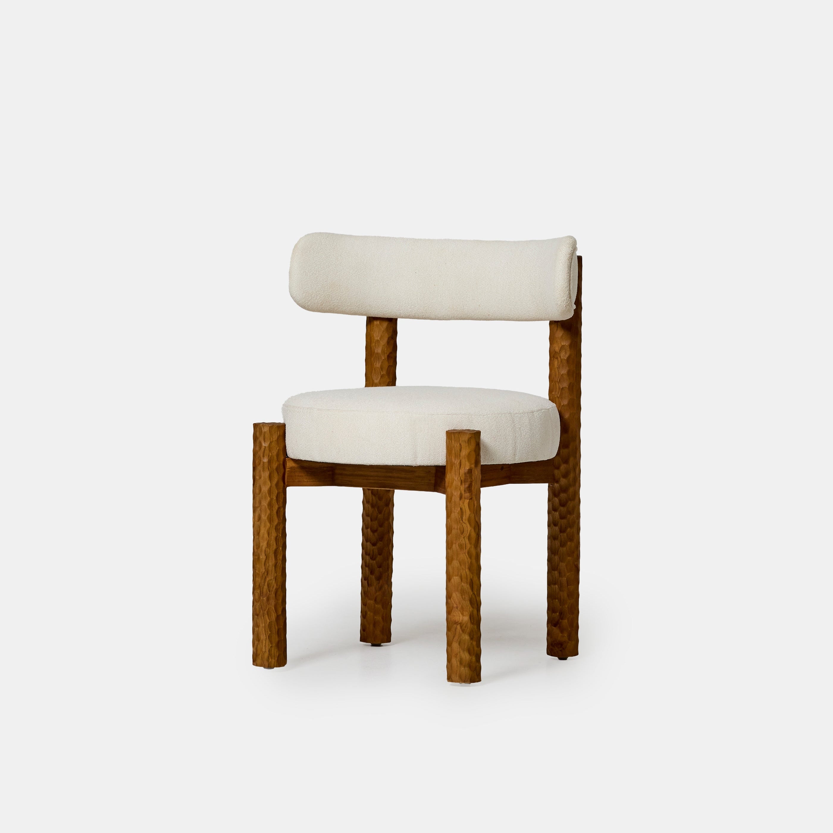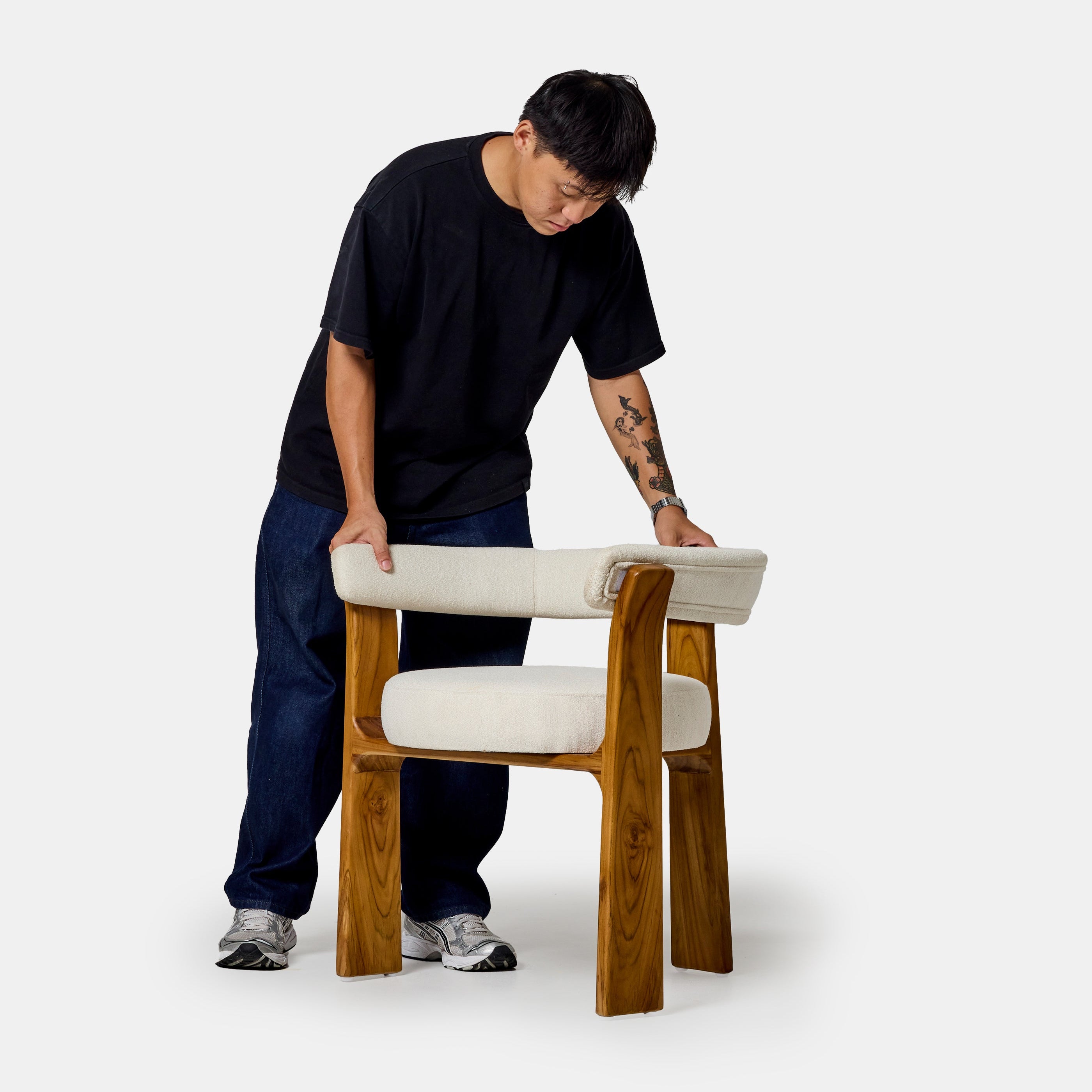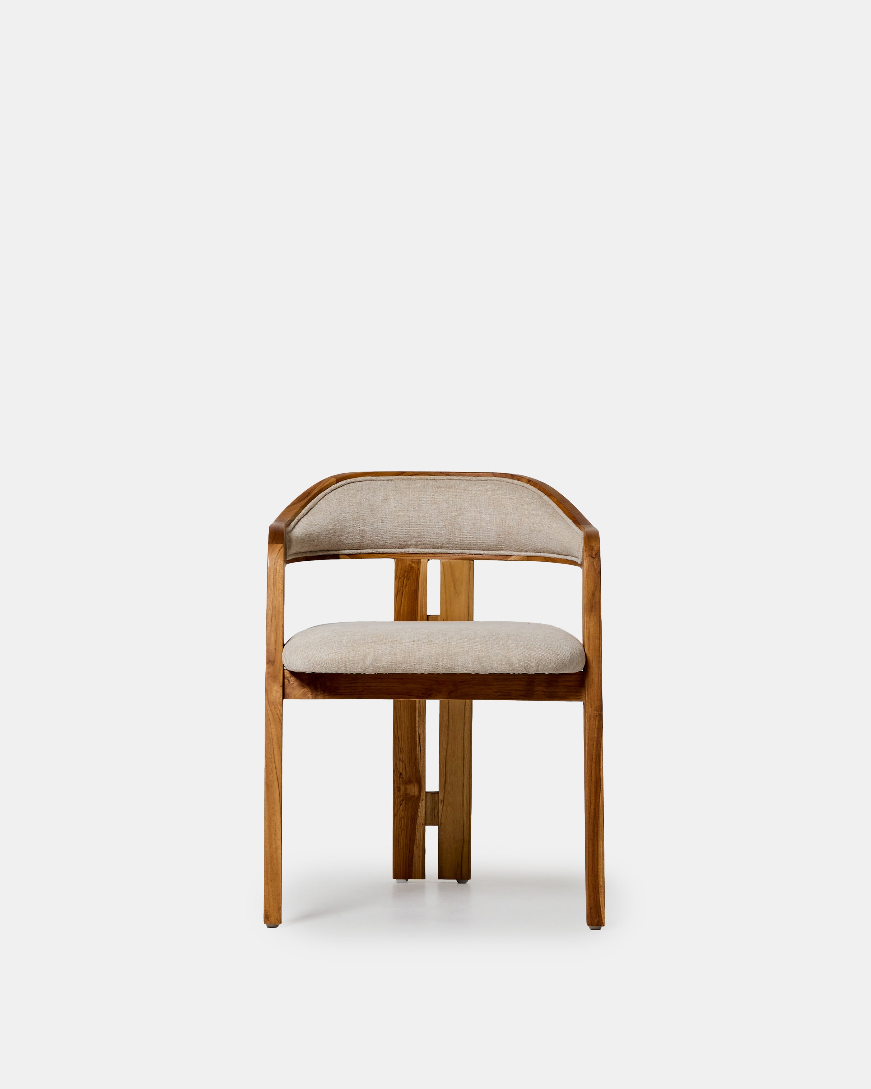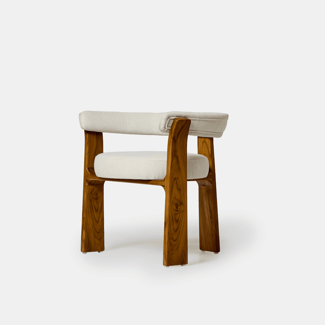 La chaise Subur blanche crée dans l’espace une impression de douceur sculpturale, portée par le contraste entre la rigueur presque architecturale de son piètement taillé et la générosité de son assise tapissée d’un textile clair au toucher feutré, une pièce où le bois révèle ses reliefs comme une matière vivante et où la lumière vient se poser avec délicatesse, composant une atmosphère à la fois graphique, chaleureuse et subtilement enveloppante, pensée pour accompagner aussi bien une table de repas qu’un espace plus intime avec la même élégance silencieuse.
