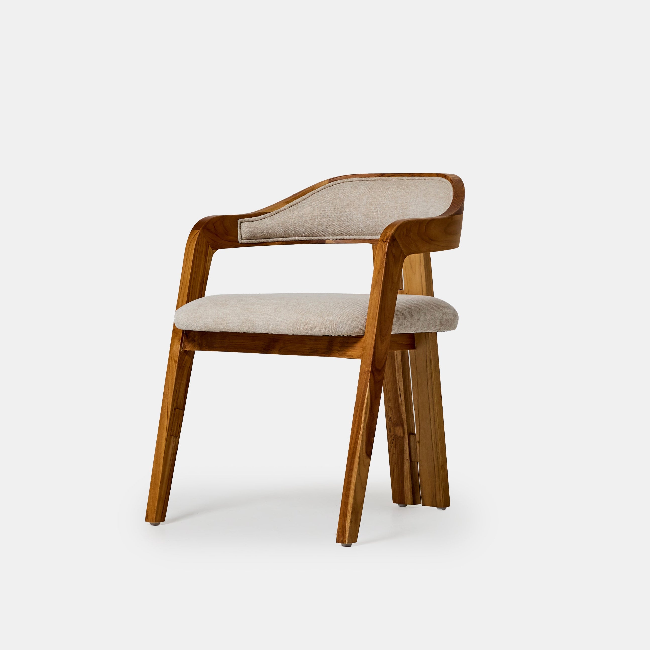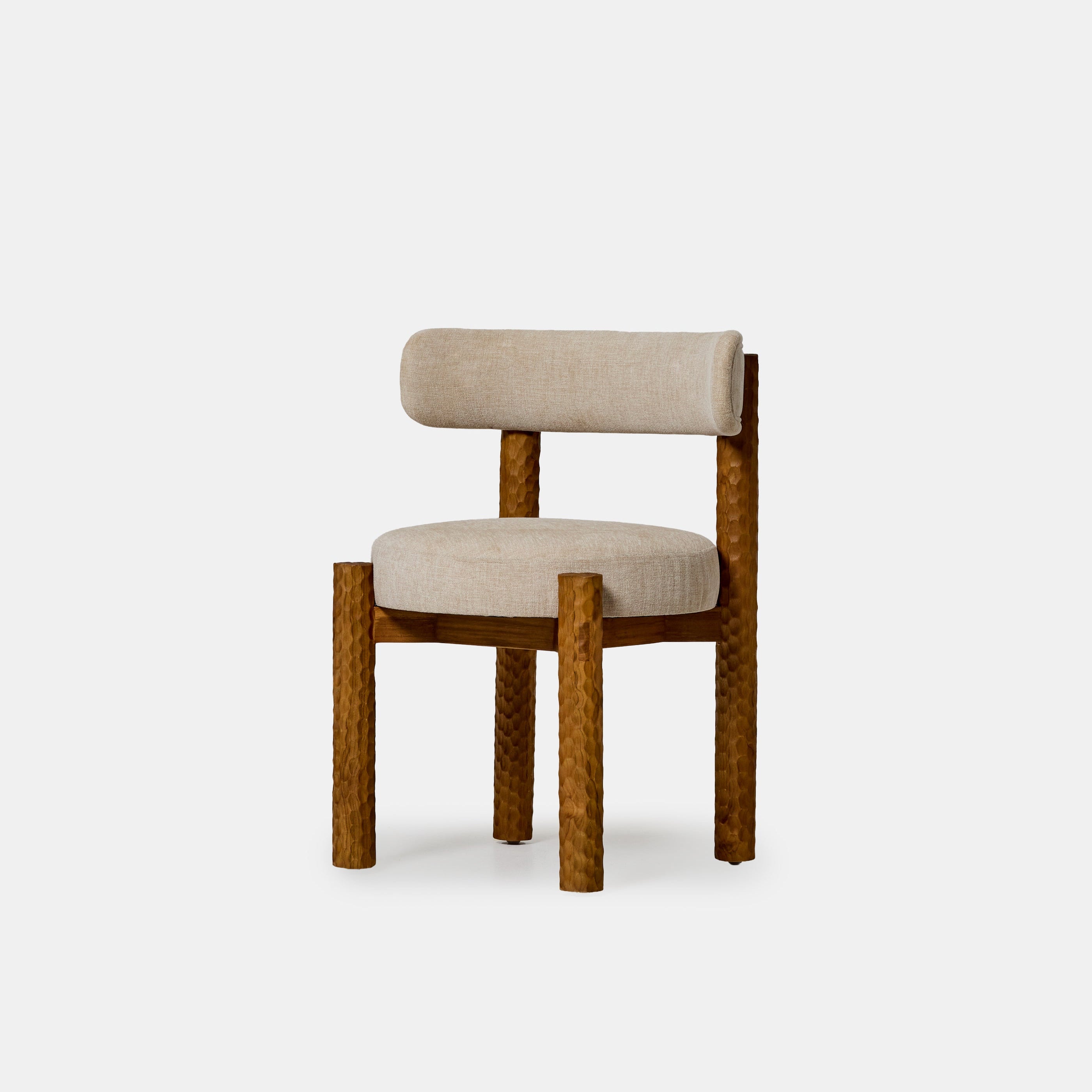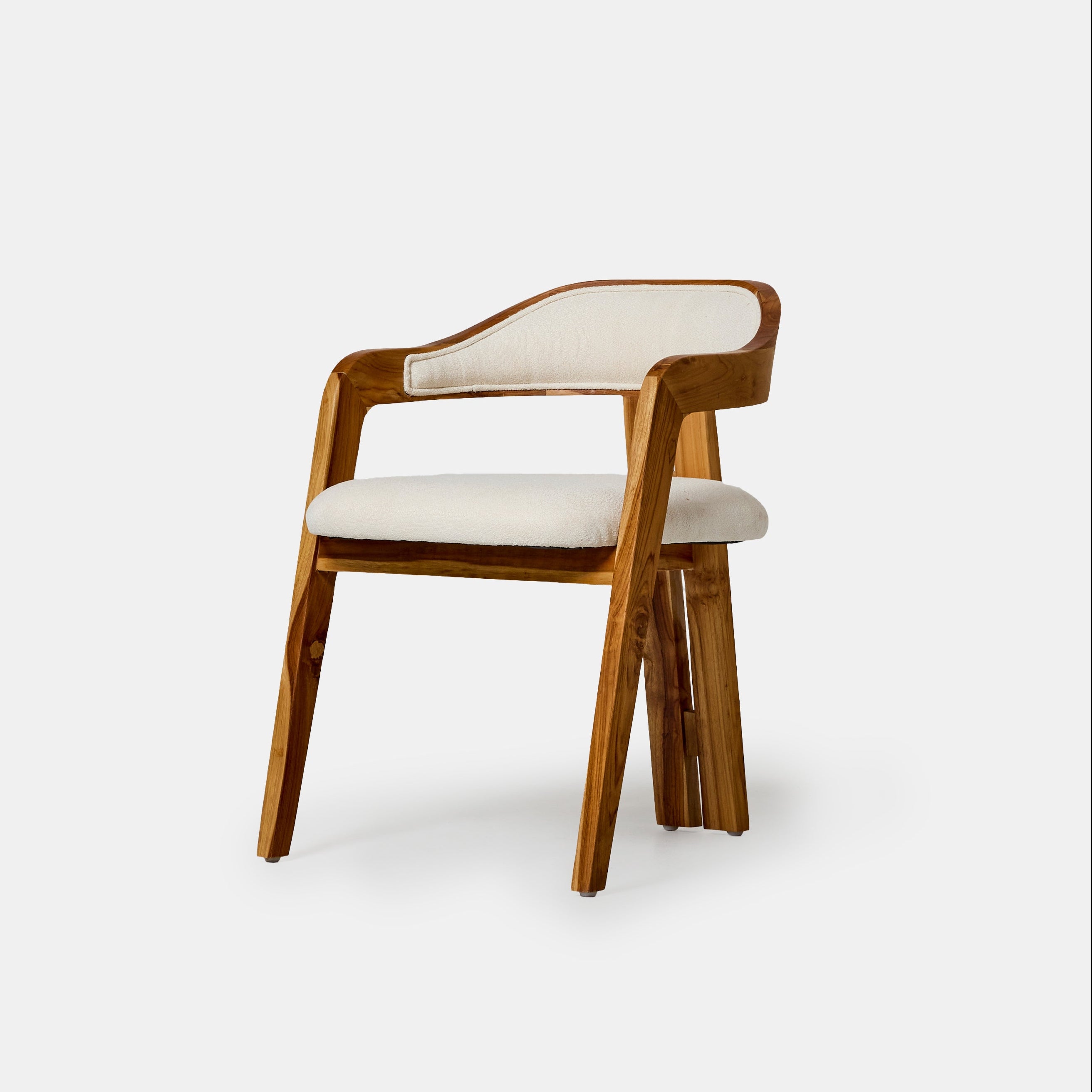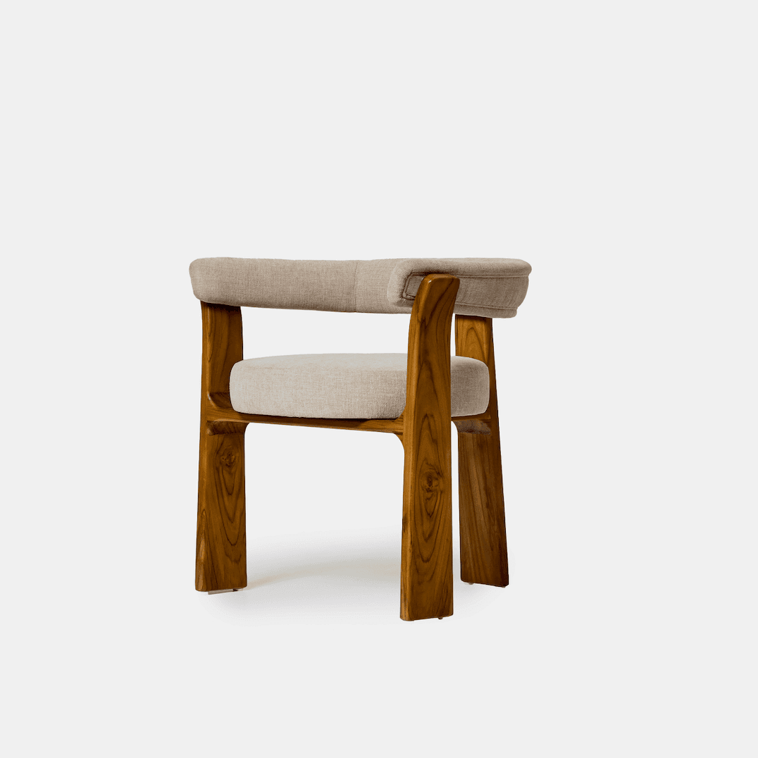 La chaise Subur blanche crée dans l’espace une impression de douceur sculpturale, portée par le contraste entre la rigueur presque architecturale de son piètement taillé et la générosité de son assise tapissée d’un textile clair au toucher feutré, une pièce où le bois révèle ses reliefs comme une matière vivante et où la lumière vient se poser avec délicatesse, composant une atmosphère à la fois graphique, chaleureuse et subtilement enveloppante, pensée pour accompagner aussi bien une table de repas qu’un espace plus intime avec la même élégance silencieuse.