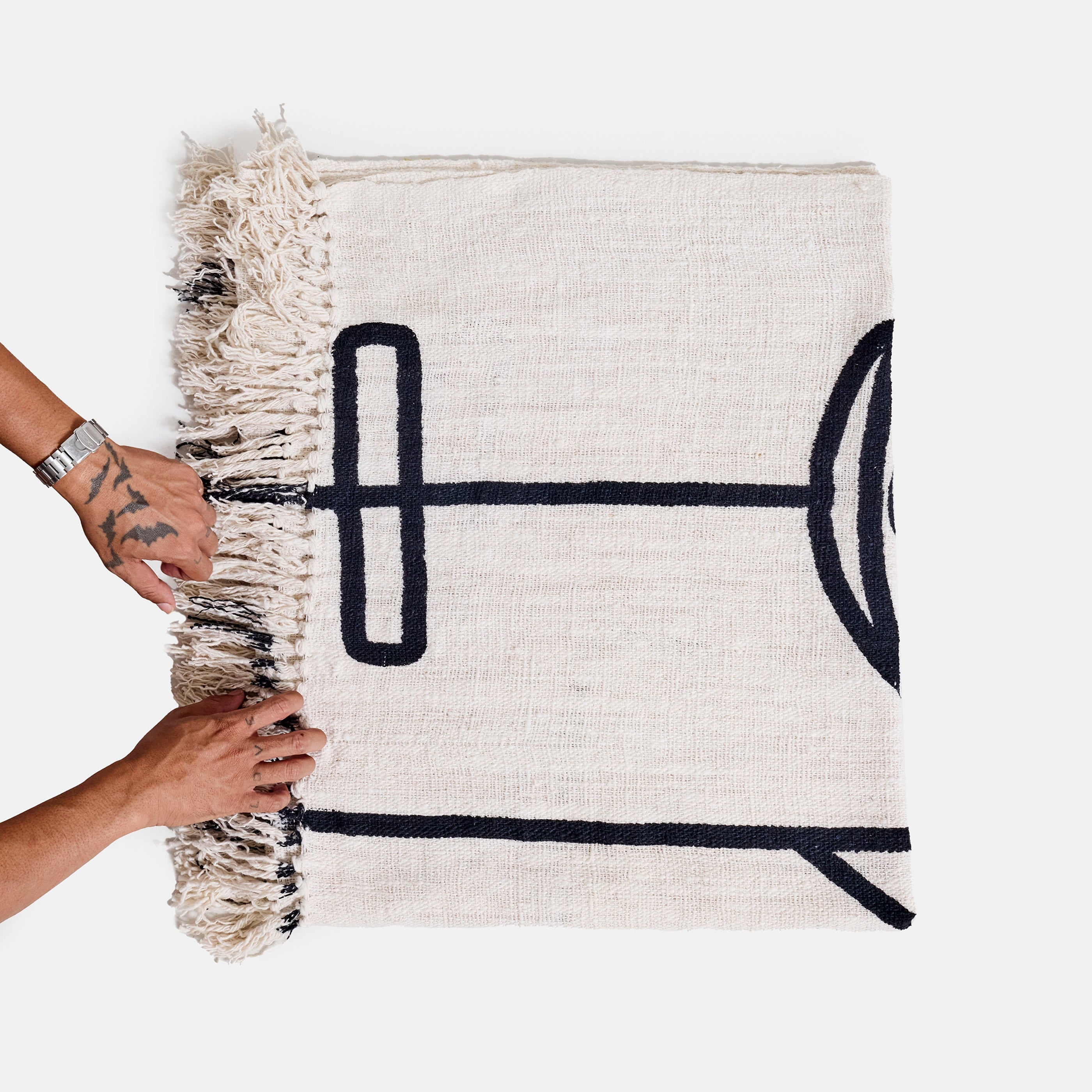 Alma se révèle par l’équilibre de ses formes graphiques profondes et la douceur mate de sa surface. Sa matière dense et souple invite naturellement à s’y blottir, à le garder contre soi comme un refuge intime. Les motifs noirs dialoguent avec le fond écru dans une composition calme et puissante, où lignes et courbes accompagnent le corps avec évidence. Enveloppant sans être lourd, chaleureux sans excès, Alma devient un plaid que l’on adopte instinctivement, un objet personnel et réconfortant, pensé pour les moments où l’on cherche un contact simple, doux et sincère.