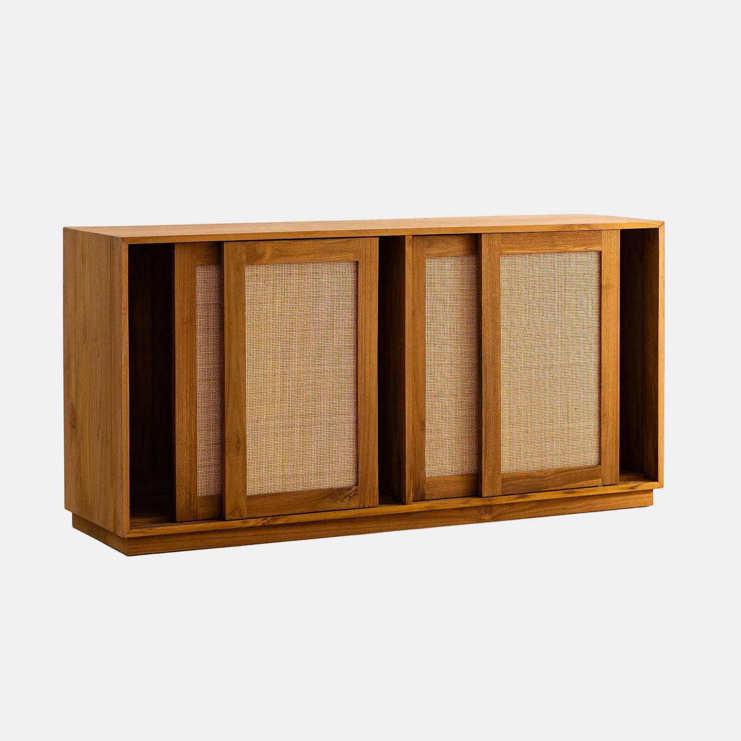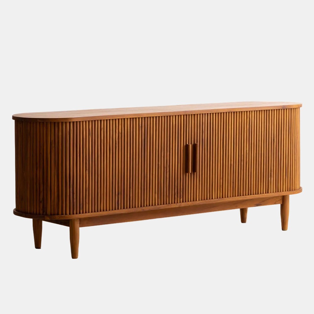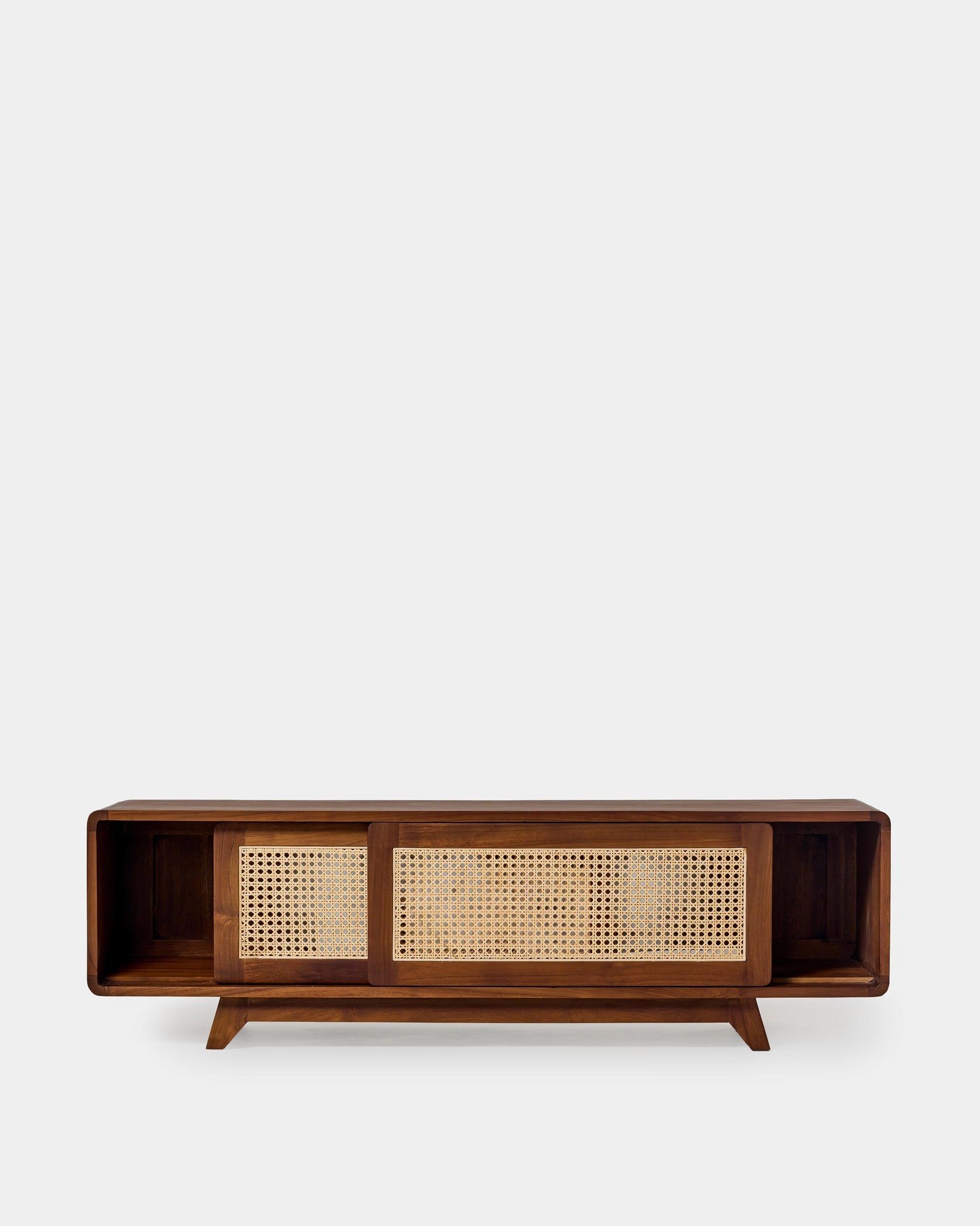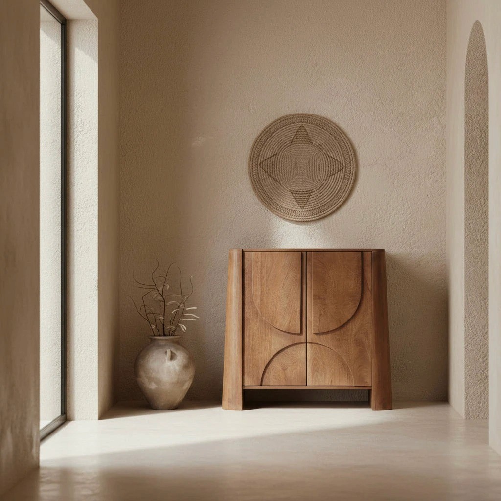 Le petit buffet Rupa apporte instantanément du caractère à l’espace grâce à sa silhouette compacte et à ses portes sculptées de motifs arrondis qui captent la lumière comme un relief architectural. Sa teinte tabac nuancée de miel diffuse une chaleur naturelle, parfaite pour une entrée, un salon ou une chambre. Ce format maîtrisé en fait une pièce forte qui structure l’intérieur sans l’alourdir, offrant un plateau idéal pour accueillir un vase, une lampe ou quelques objets décoratifs. Façonné artisanalement, chaque buffet présente des variations subtiles dans le motif et la matière, rendant chaque modèle unique, avec sa propre personnalité.