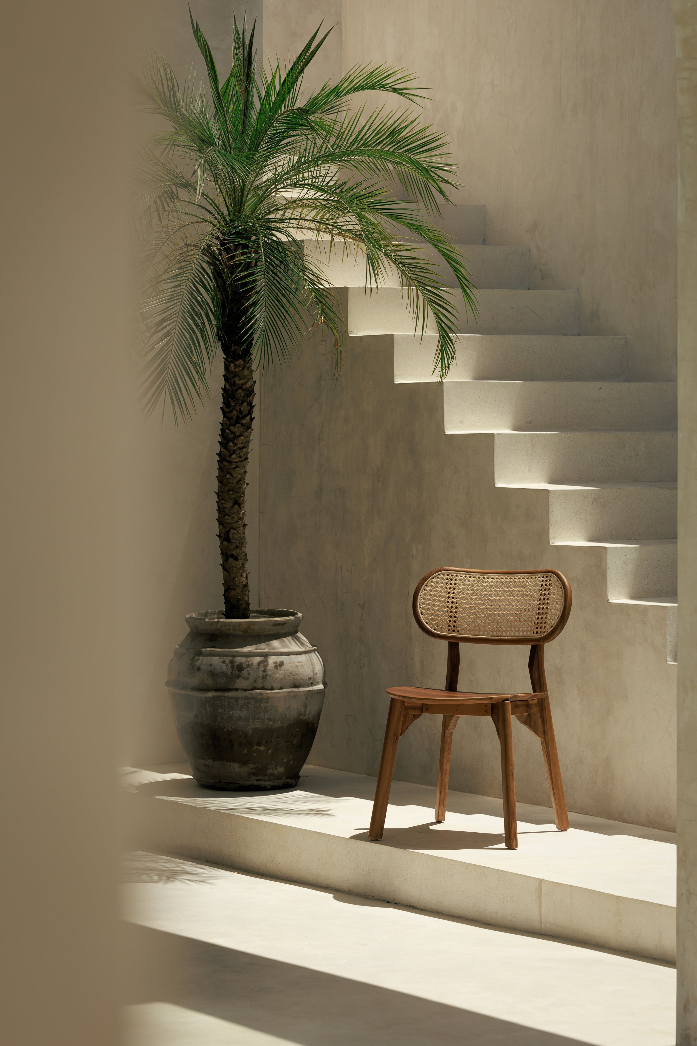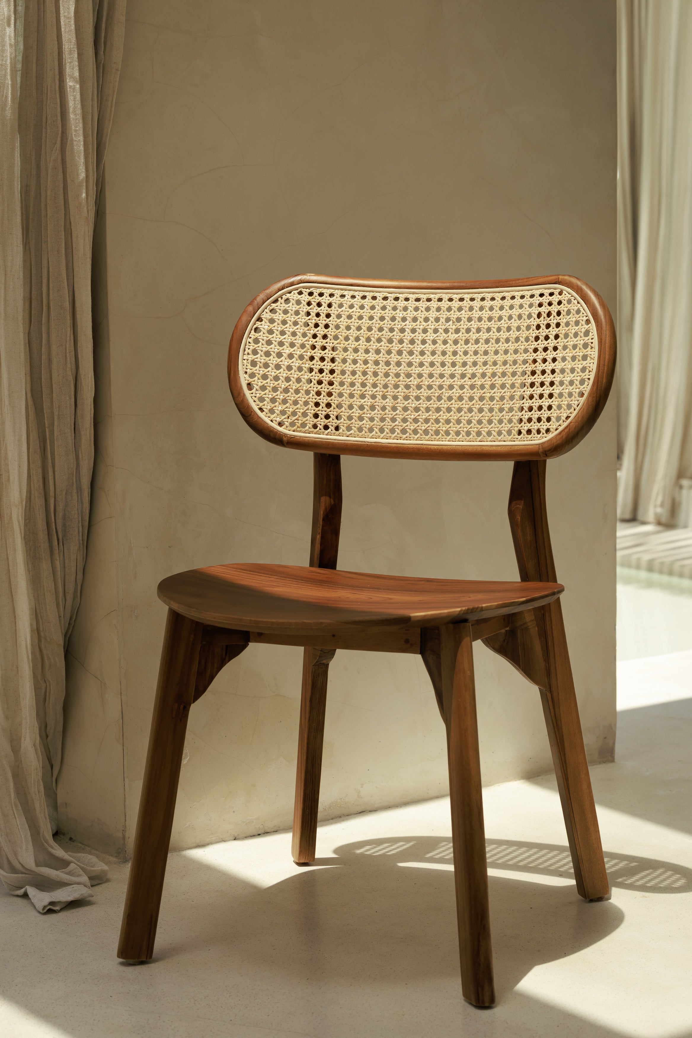 La chaise Anda associe la chaleur du teck massif à la finesse d’un cannage tissé à la main, créant un équilibre naturel entre solidité et légèreté. L’assise en teck et cannage offre un contact à la fois ferme et souple, tandis que le dossier ajouré laisse passer l’air et la lumière pour une sensation visuelle plus légère. Le bois révèle une finition lisse et des veines naturelles qui donnent à la chaise toute sa présence. Une pièce pensée pour mettre la matière au centre, avec un confort juste et une élégance organique.