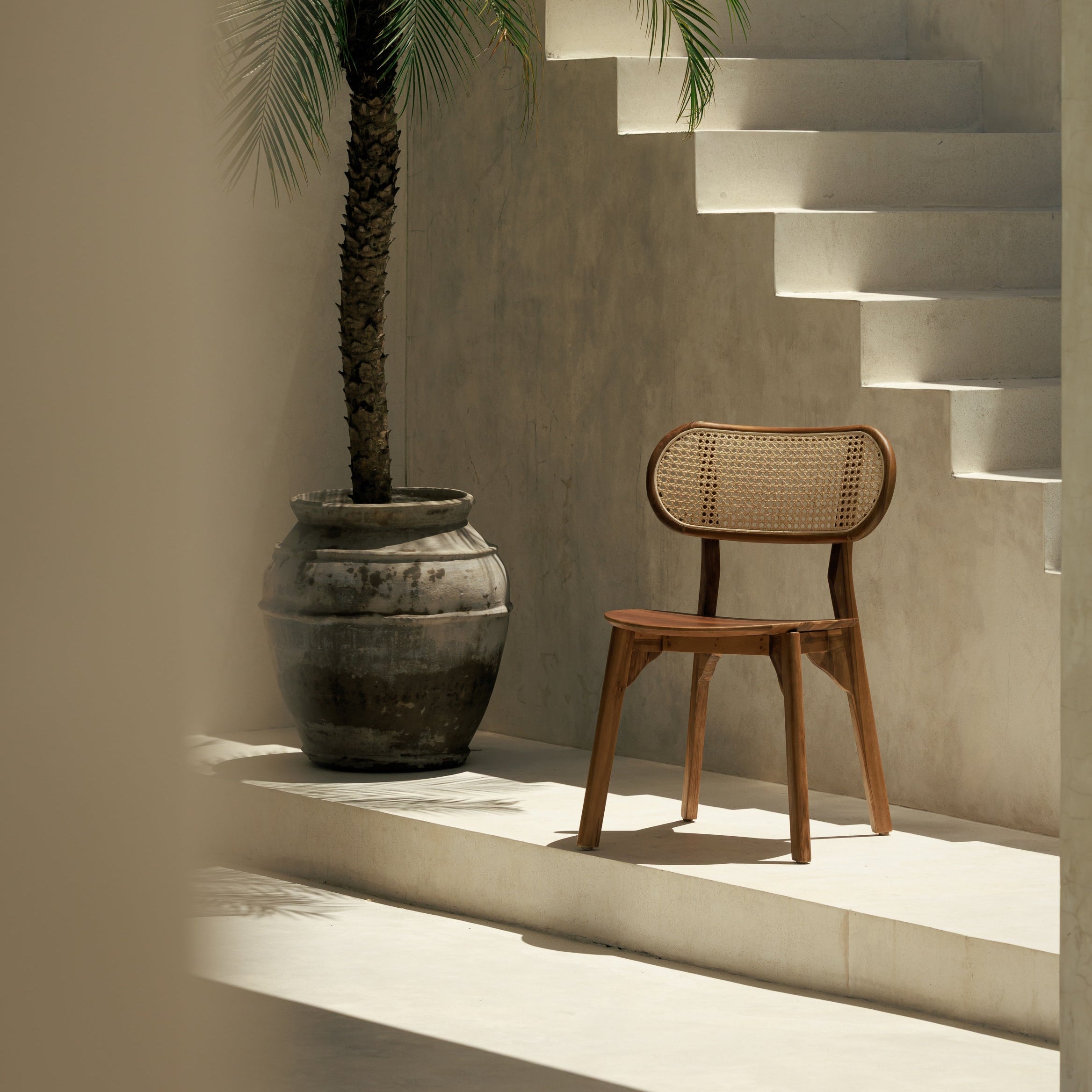La chaise Anda en teck de classe A et cannage tissé à la main révèle une élégance naturelle où la matière s'exprime avec clarté. Son bois aux nuances chaudes dessine une structure douce et équilibrée, tandis que son dossier ajouré laisse circuler la lumière pour une sensation de légèreté visuelle absolue.