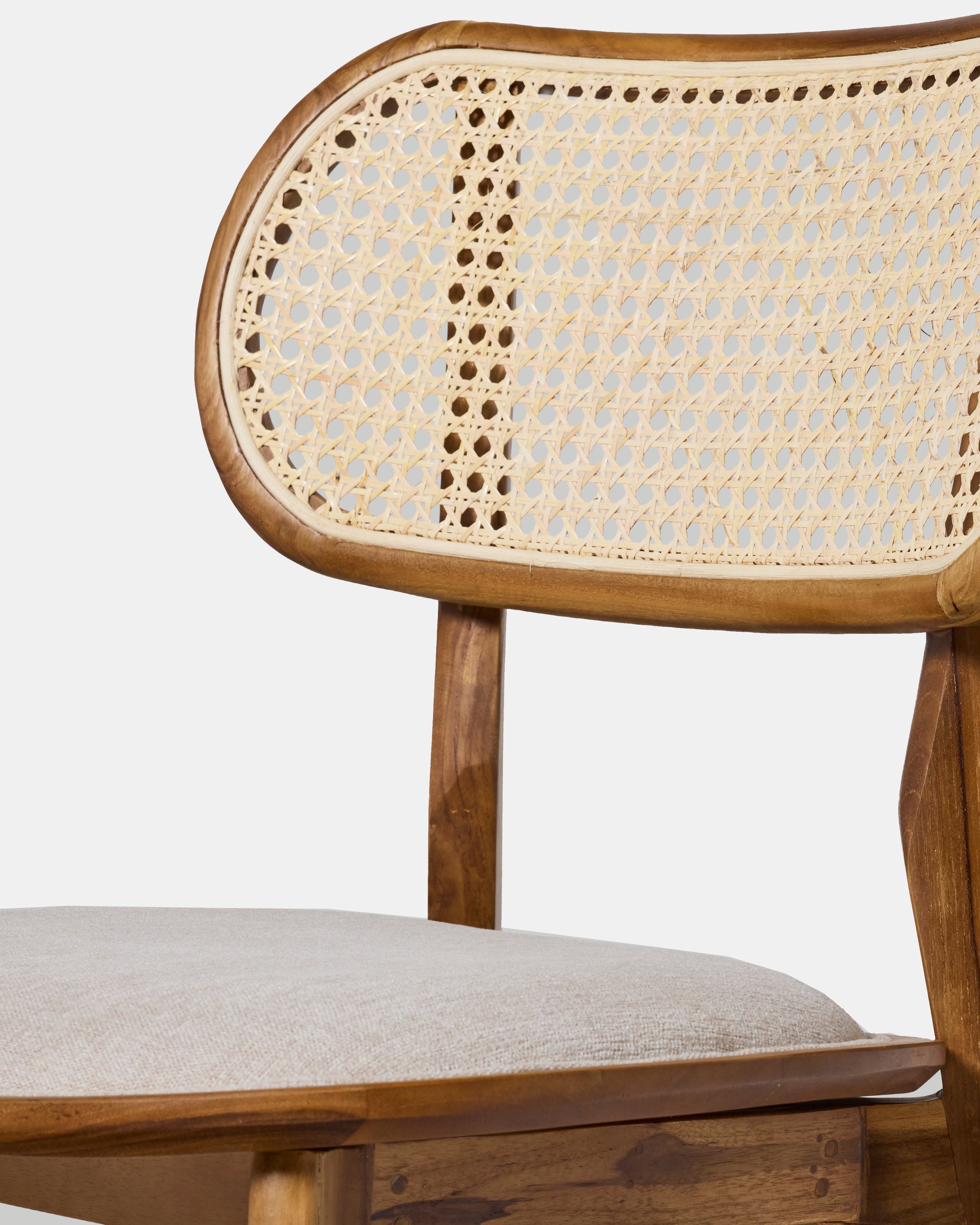 La chaise Anda Cush en teck et cannage tissé à la main avec coussin en tissu, fabriquée à Bali.