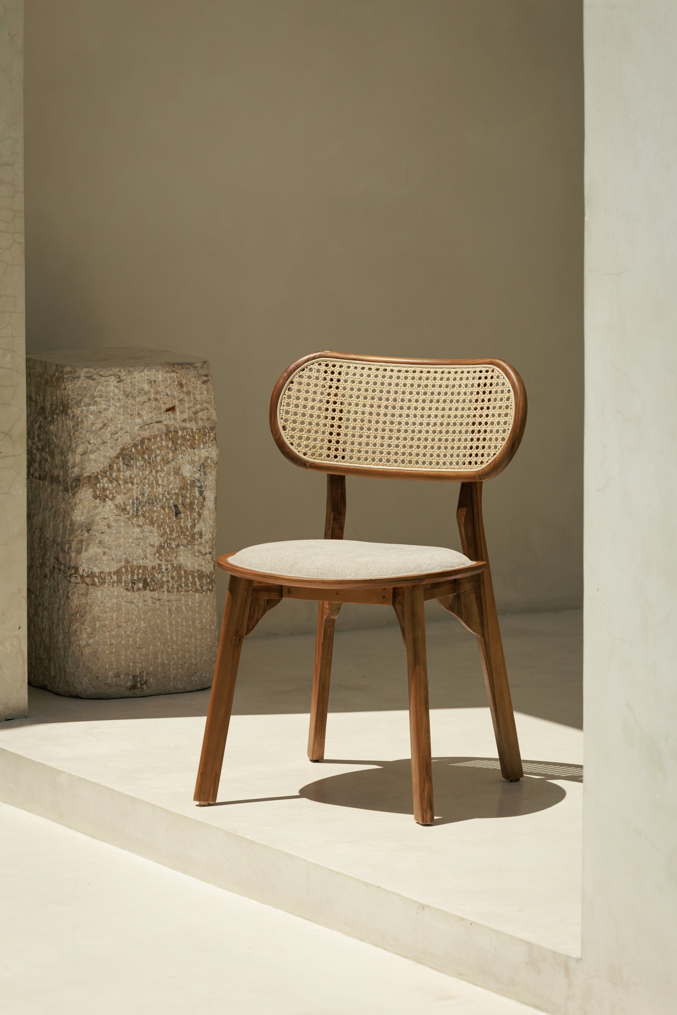 La chaise Anda Cush révèle une silhouette douce et équilibrée où le teck de classe A dialogue avec la délicatesse du cannage tissé à la main. Son dossier ajouré laisse passer la lumière et l’air, créant une sensation de légèreté visuelle, tandis que le coussin en tissu apporte un confort feutré qui invite à s’attarder. Façonnée à Bali, elle installe autour de la table une atmosphère naturelle et élégante, entre artisanat et design intemporel.