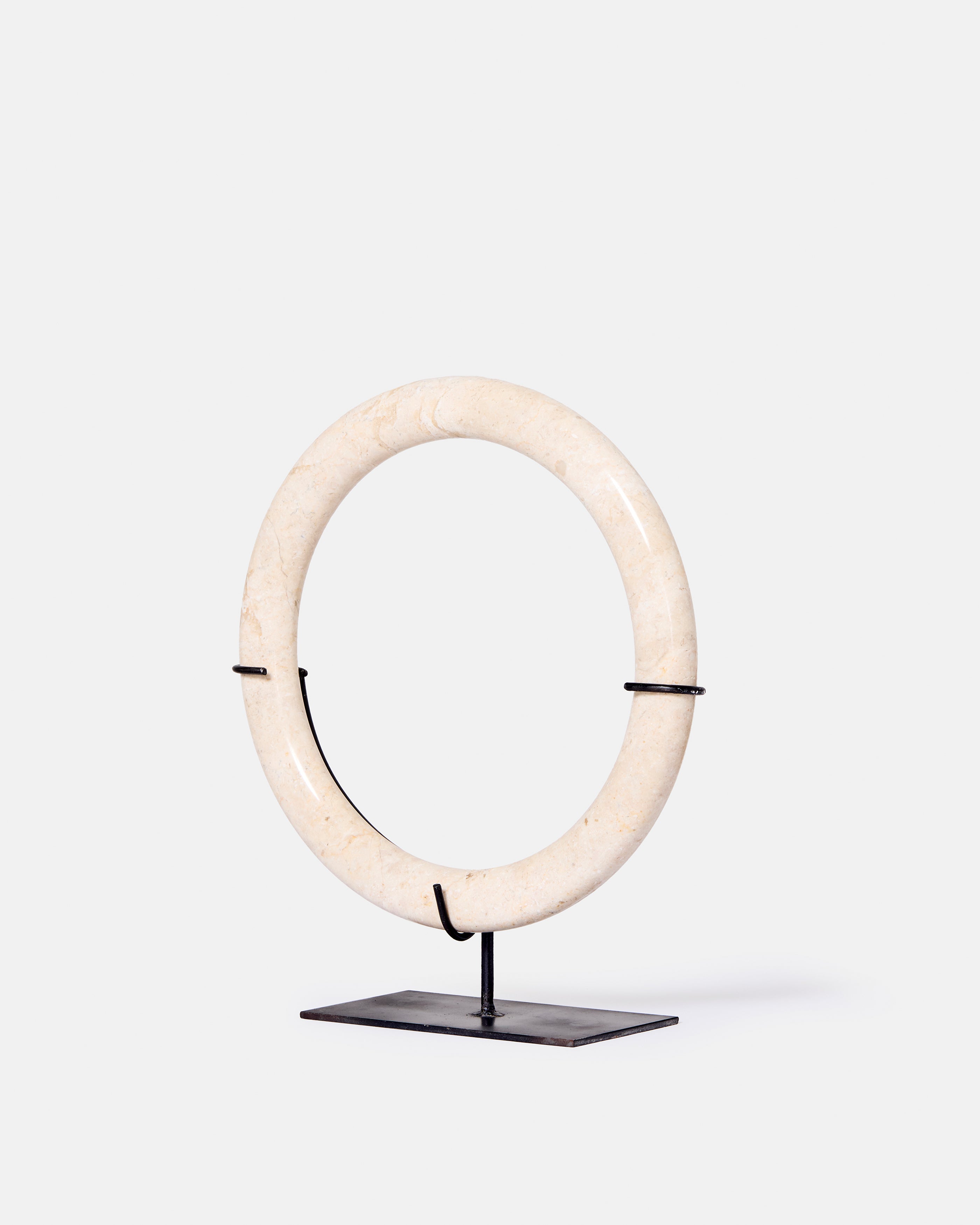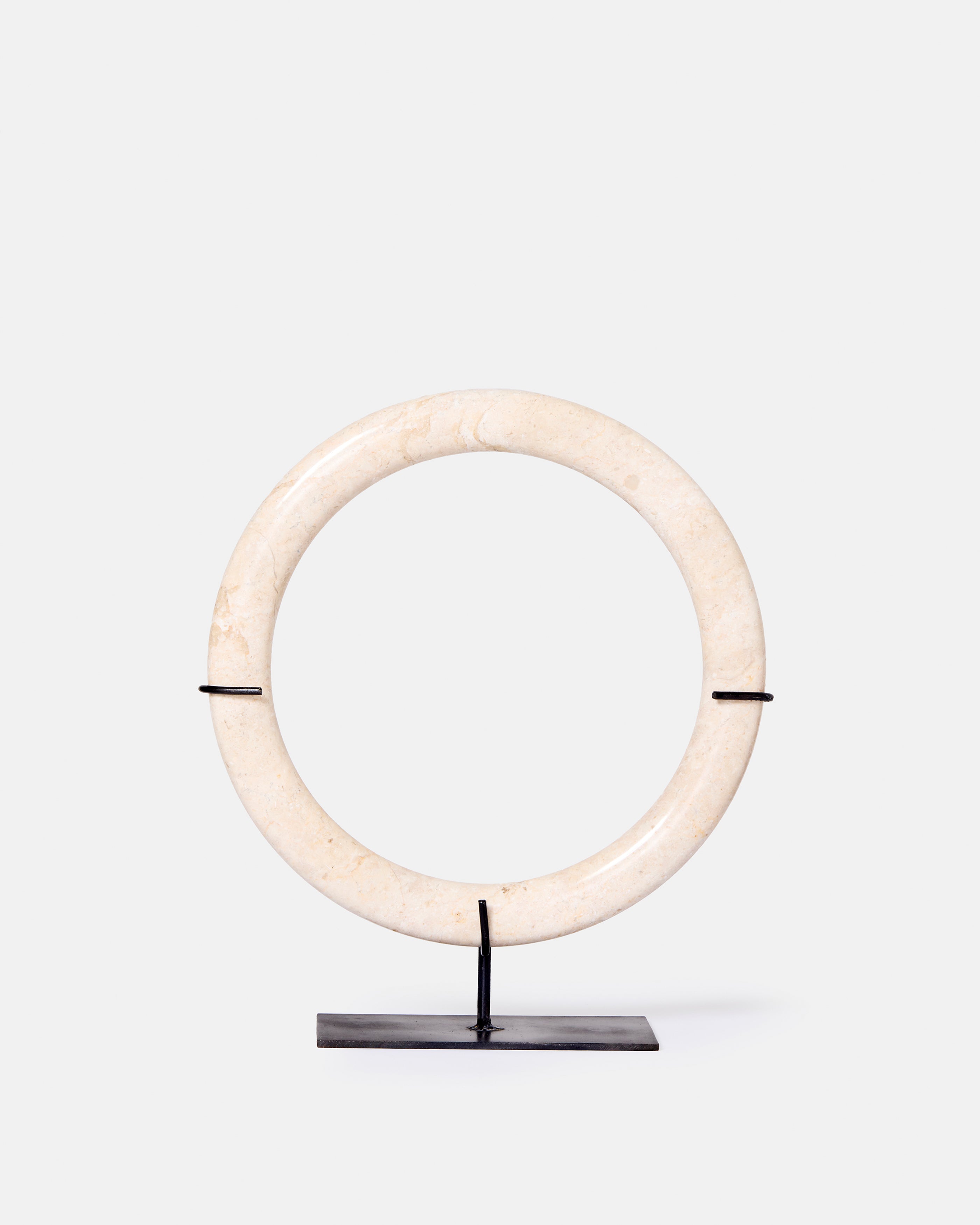 Ajoutez une touche d'élégance à votre intérieur avec cet ensemble de trois anneaux décoratifs en marbre blanc sur socle en métal noir venant de l'île de Java.
