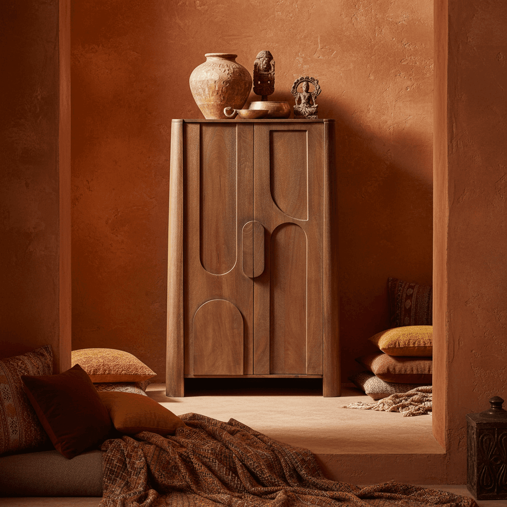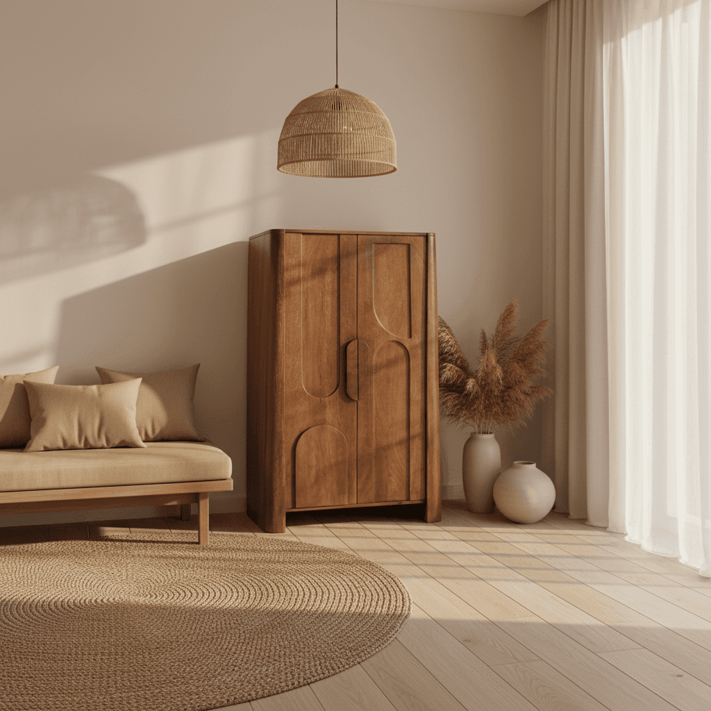 Le Cabinet Rupa affirme son caractère dès le premier regard, avec une présence sculpturale qui redessine l’espace et apporte une profondeur nouvelle à votre décor. Ses portes aux reliefs arrondis dessinent un rythme graphique hypnotique qui rappelle l’élégance des intérieurs vintage réinterprétés avec modernité. La lumière accroche délicatement ses courbes et révèle un jeu d’ombres subtil, donnant l’impression que les formes bougent doucement au fil de la journée. Le bois de manguier diffuse une chaleur naturelle qui enveloppe l’espace d’une présence rassurante et contemporaine. À l’intérieur, des étagères généreuses accueillent livres, vaisselle, objets précieux ou essentiels du quotidien avec la même élégance discrète. Ce cabinet devient rapidement un point d’ancrage dans une pièce, un meuble qui structure l’espace autant qu’il le sublime. Dans une entrée, un salon ou une chambre, le Cabinet Rupa crée une atmosphère raffinée sans jamais en faire trop. Il se marie avec des matières naturelles, des couleurs douces, des intérieurs minimalistes comme des ambiances plus éclectiques. Chaque détail est pensé pour durer, et certaines variations naturelles font de chaque pièce un exemplaire unique.