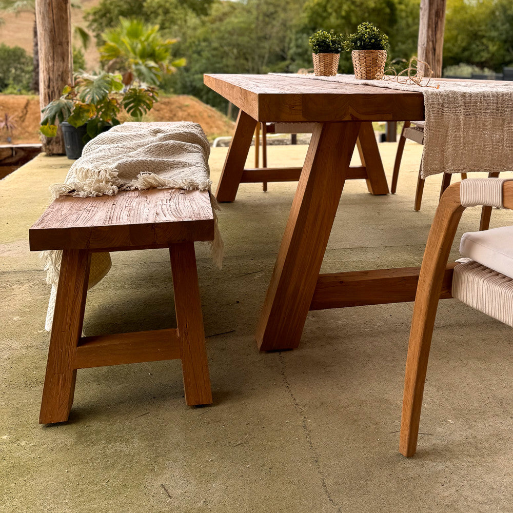 Ce banc extérieur en teck recyclé est disponible en 4 tailles. Parfait pour aménager votre salon de jardin ou votre table à manger extérieur. Optez pour la durabilité avec ce banc extérieur en teck recyclé. Fabriqué à partir de bois de teck, chaque banc conserve les marques uniques du bois, apportant une touche naturelle et chaleureuse à vos espaces extérieurs. Ce banc robuste est parfait pour votre salon de jardin, table à manger ou patios. Convient également pour une installation intérieure. Il s'adapte à tous vos besoins, que ce soit pour des repas en extérieur ou simplement pour décorer un coin détente. Le teck recyclé est non seulement durable, mais il résiste aussi parfaitement aux conditions extérieures, ce qui en fait un choix idéal pour une utilisation à long terme en plein air. Guide des dimensions : Pour un côté esthétique, nous recommandons de sélectionner un banc d'une dimension de 20cm inférieur à votre table. Besoin d'une dimension personnalisée ? Vous pouvez directement nous contacter sur designtripfrance@gmail.com Photos non contractuelles, chaque produit est unique, certains détails peuvent varier. crédit photos : @deborah_hbr et @paulbarnier