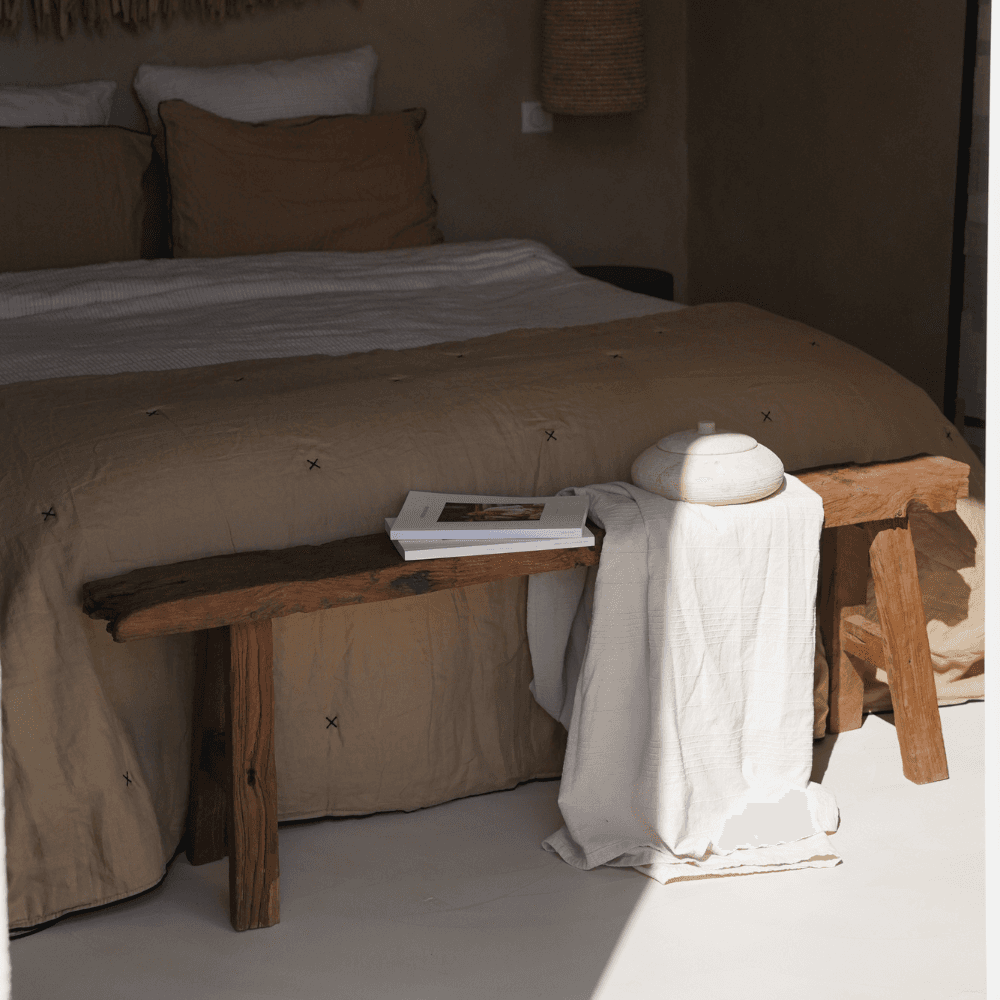 Le banc Bulma en teck recyclé est une assise artisanale au dessin brut, idéale dans une entrée, en bout de lit ou près d'une table. Son bois patiné et ses lignes sobres s'accordent aux intérieurs wabi sabi, japandi ou contemporains.