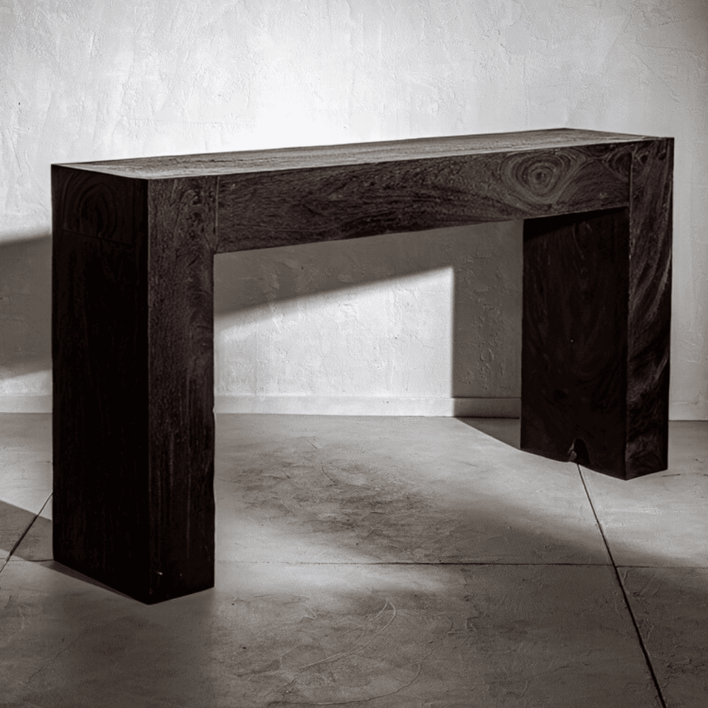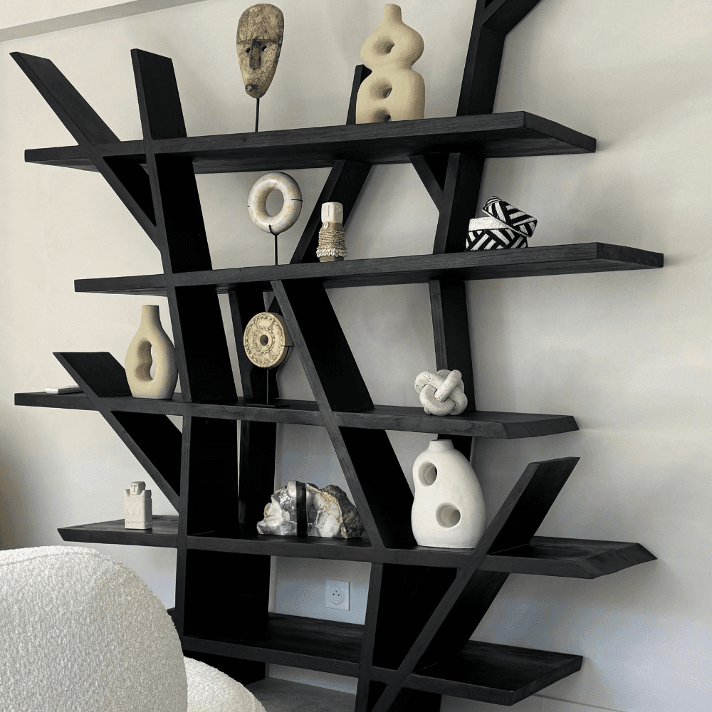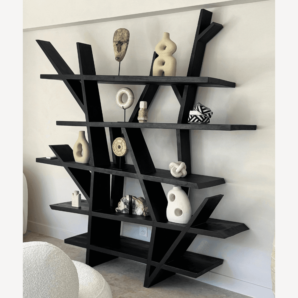 Dans un salon, un bureau ou une entrée généreuse, cette bibliothèque en teck massif brûlé structure l'espace autant qu'elle organise le rangement. Façonnée à la main en Indonésie, elle se distingue par un dessin organique qui évoque le tracé libre de branches, loin des lignes strictement rectilignes. Le bois noirci renforce cette écriture singulière et souligne la force visuelle de la pièce, tout en conservant les variations naturelles propres au teck massif. Chaque exemplaire présente ainsi ses nuances, avec des différences de teinte et de veinage qui participent à son caractère artisanal. Cette bibliothèque accueille aussi bien des livres que des céramiques, des paniers ou quelques objets choisis, en créant un équilibre entre rangement fonctionnel et mise en scène décorative. Son allure affirmée convient aux intérieurs contemporains comme aux décors plus minéraux ou plus naturels, où elle apporte un point d'ancrage net sans alourdir l'ensemble. Entre force brute et raffinement, elle compose un meuble de rangement à part entière, autant apprécié pour son usage quotidien que pour son dessin travaillé.