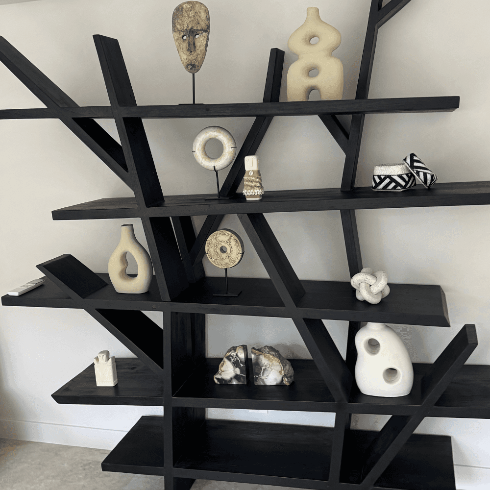 La Bibliothéque en bois brûlé est une bibliothèque sculpturale en teck massif brûlé, pensée pour exposer livres et objets avec caractère. Sa fabrication artisanale en Indonésie et son dessin organique lui donnent une allure forte, entre pièce de rangement et accent décoratif.