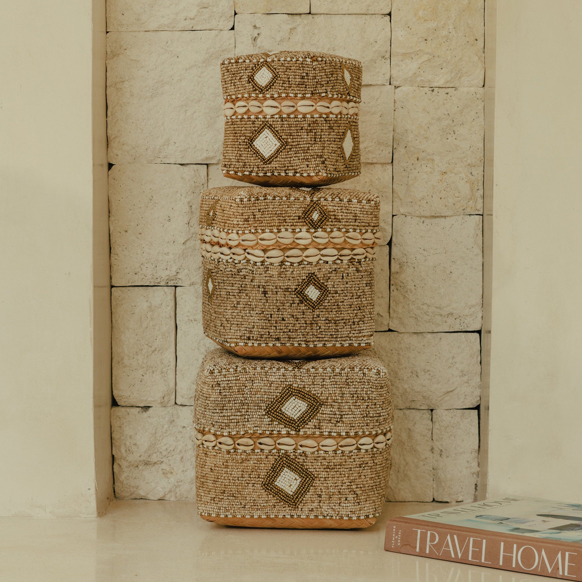 Boîtes décoratives en bambou naturel tressé et coquillages, fabriquées artisanalement à Bali, idéales pour un intérieur bohème, ethnique chic ou wabi-sabi. Utilisées seules ou empilées, les boîtes Beras apportent rangement léger et accent décoratif naturel à une console, une table basse ou une chambre.