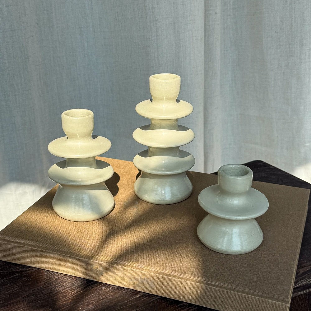 Façonné à la main au Maroc, ce bougeoir en céramique écru apporte une lumière chaleureuse et raffinée à votre décoration. Disponible en trois tailles, il crée des compositions lumineuses délicates et sophistiquées. Sa teinte douce et naturelle s’harmonise parfaitement avec un intérieur apaisant, qu’il soit posé sur une table basse, une console ou dans une salle de bain.