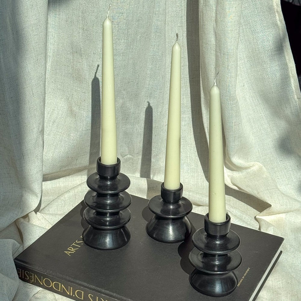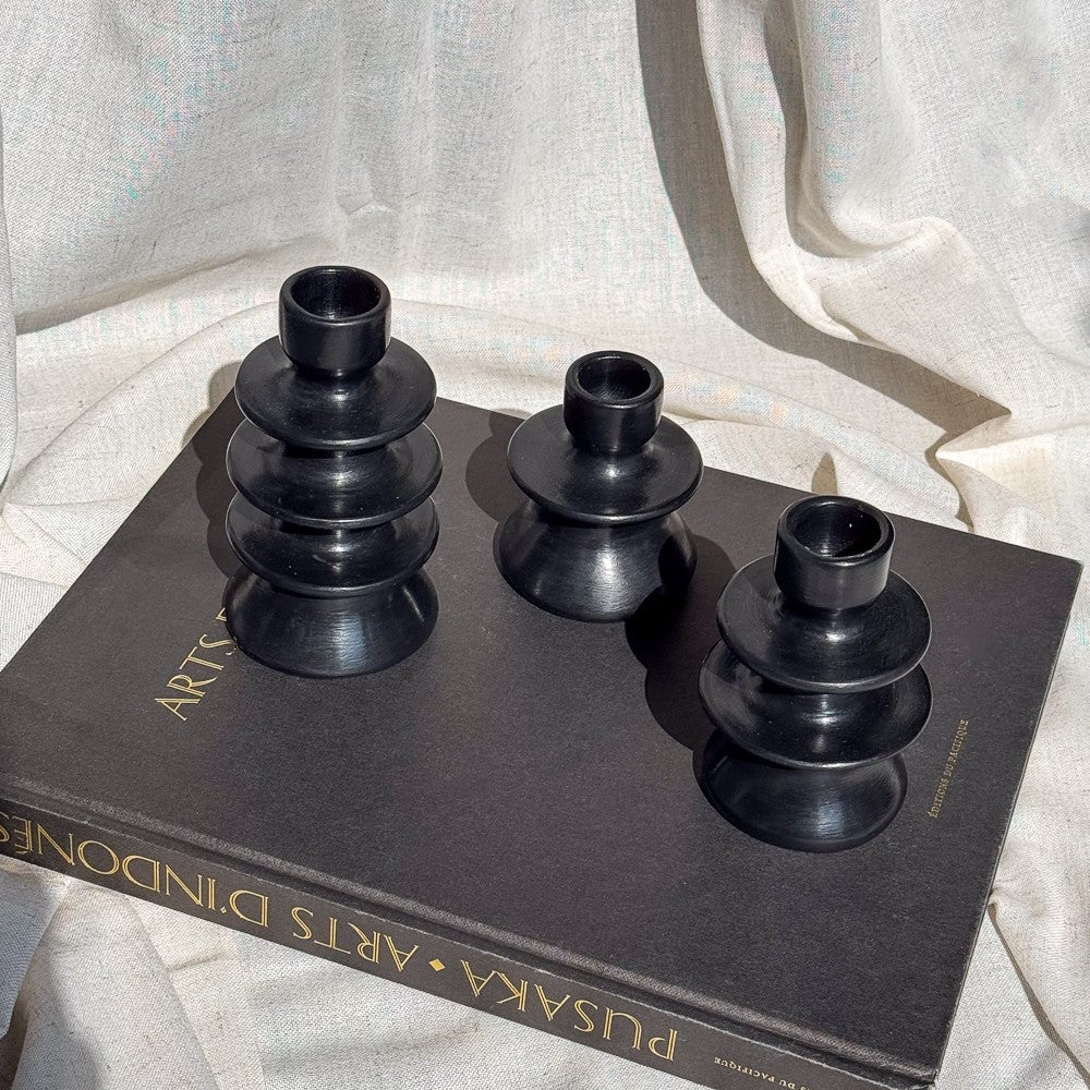 Façonné à la main au Maroc, ce bougeoir en céramique noire apporte une touche chaleureuse et sophistiquée à votre décoration. Proposé en trois tailles, il se prête autant à un duo harmonieux qu’à un trio graphique. Avec sa silhouette arrondie et sa finition mate, il crée une ambiance douce et contrastée sur une table, une étagère ou une cheminée.