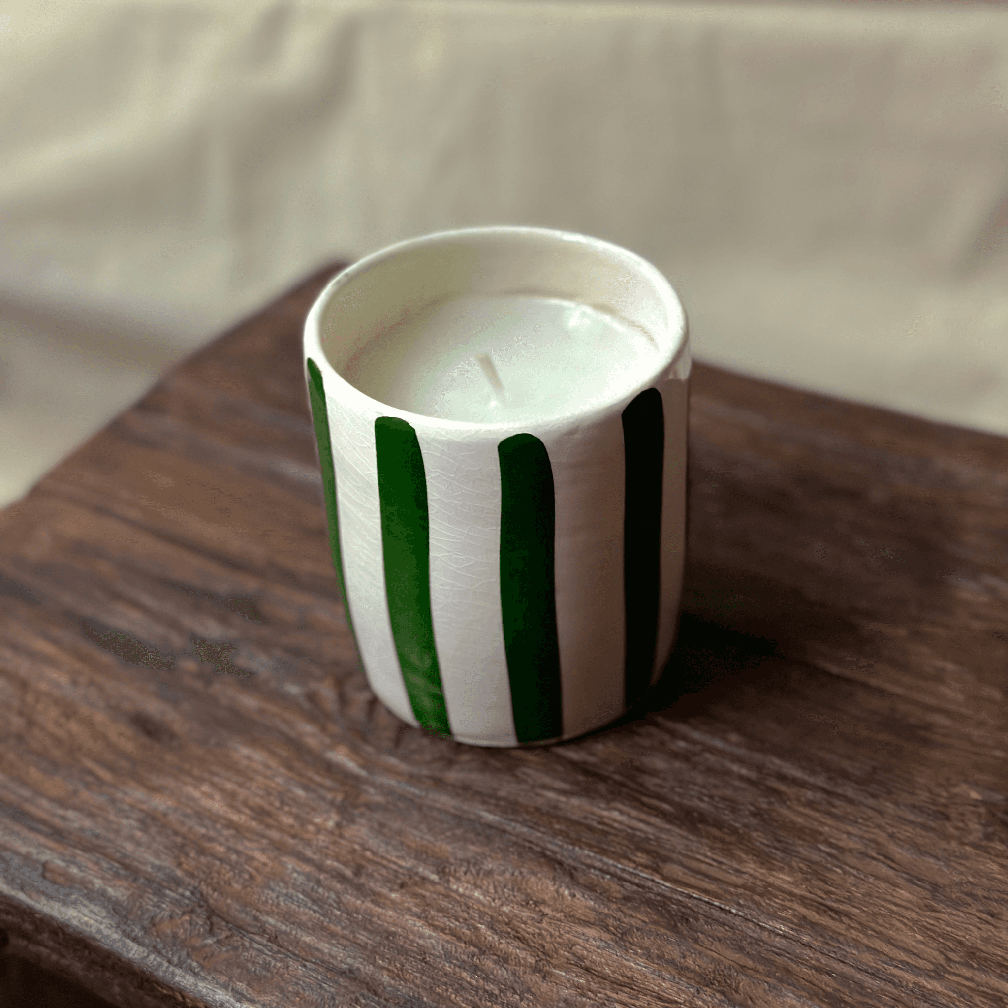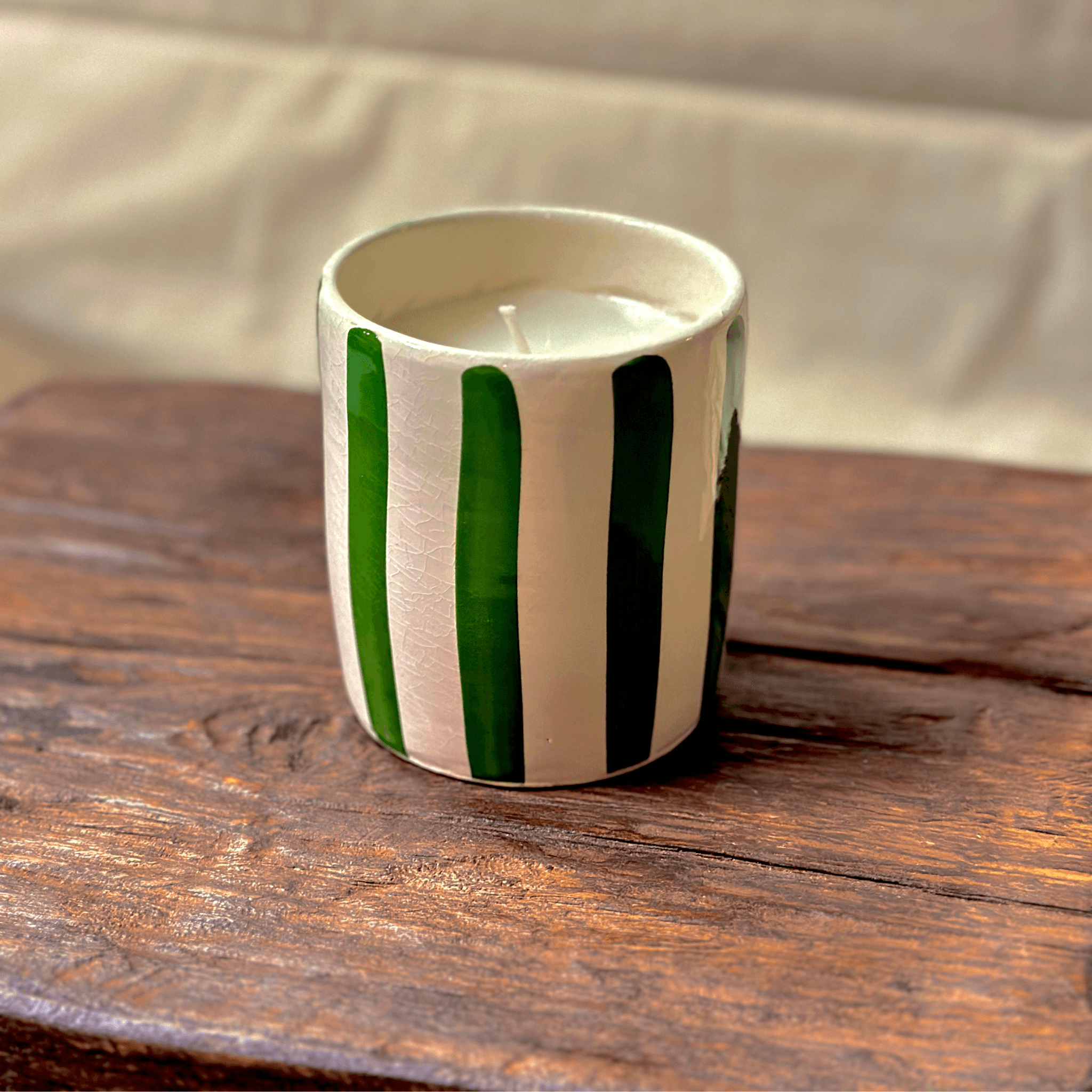 La bougie céramique lignes vertes, objet déco parfumé, apporte une note accueillante sur une table basse, une console ou une étagère. Façonnée à la main en céramique artisanale et parfumée à la fleur d’oranger, elle réunit usage quotidien et finition décorative.