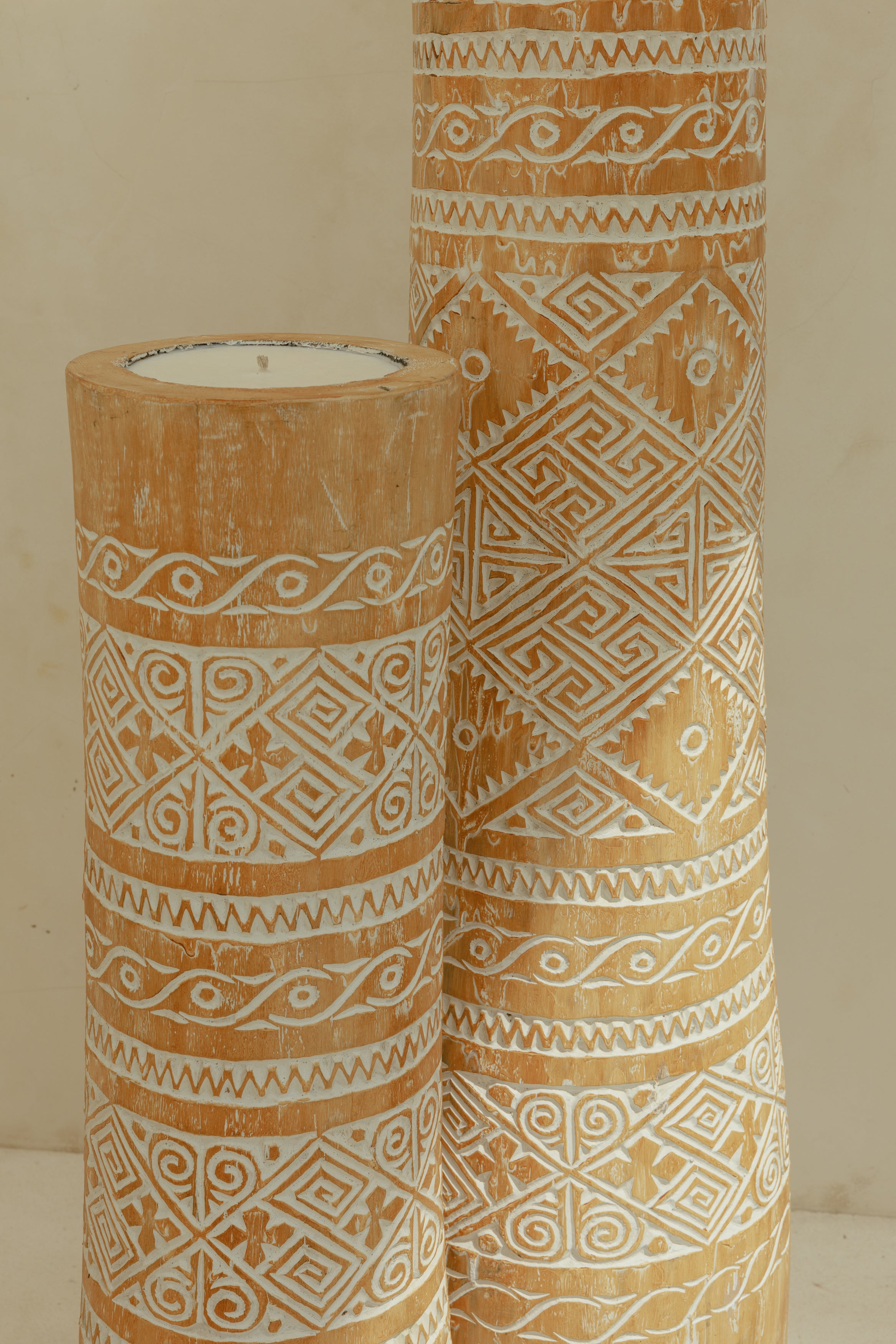 Sculptée à la main, la Bougie primitive en objet déco de bois de cocotier apporte un accent artisanal à l’intérieur. Ses motifs gravés et sa finition blanchie soulignent son allure élancée, idéale sur une console, dans une entrée ou au cœur d’un salon.
