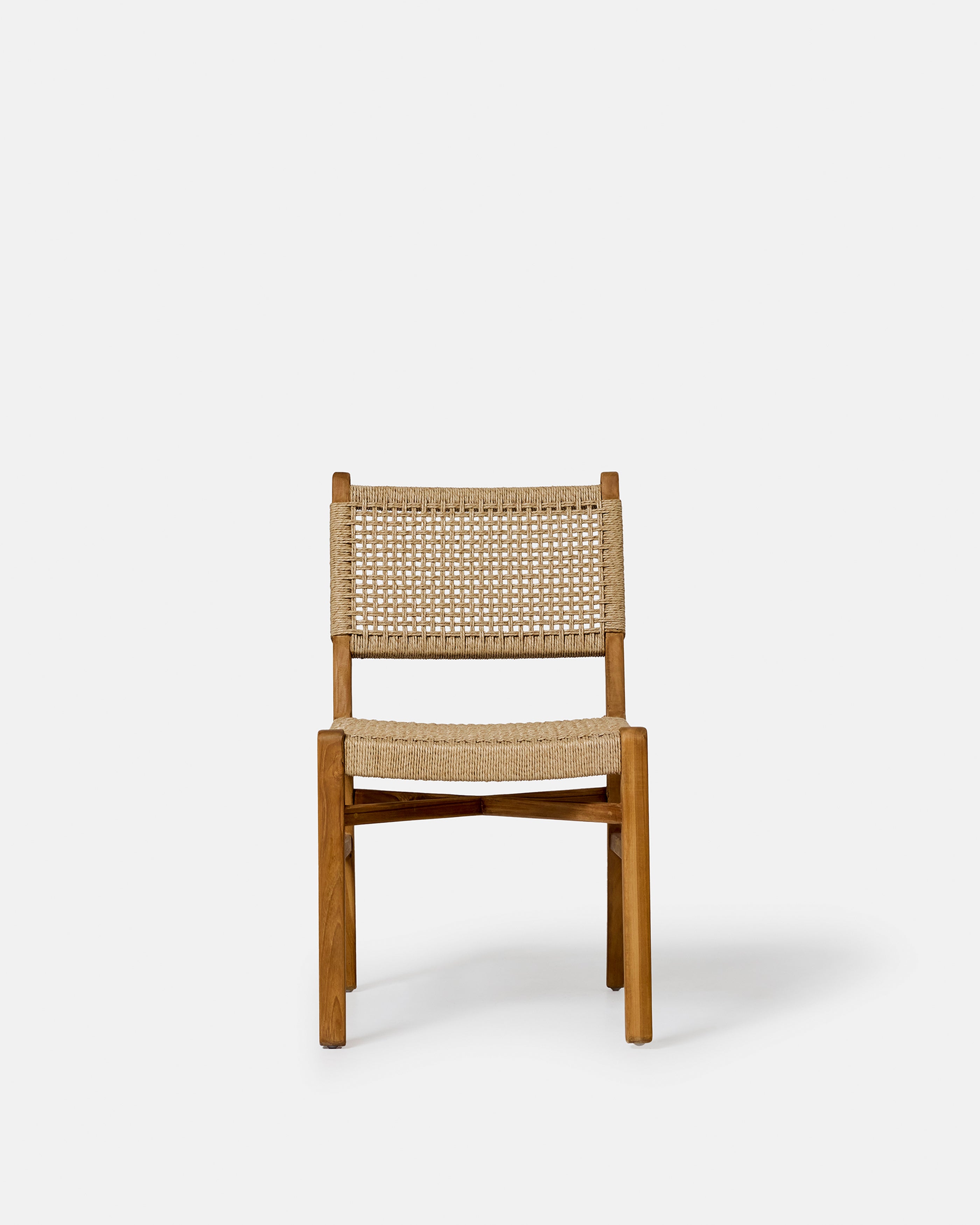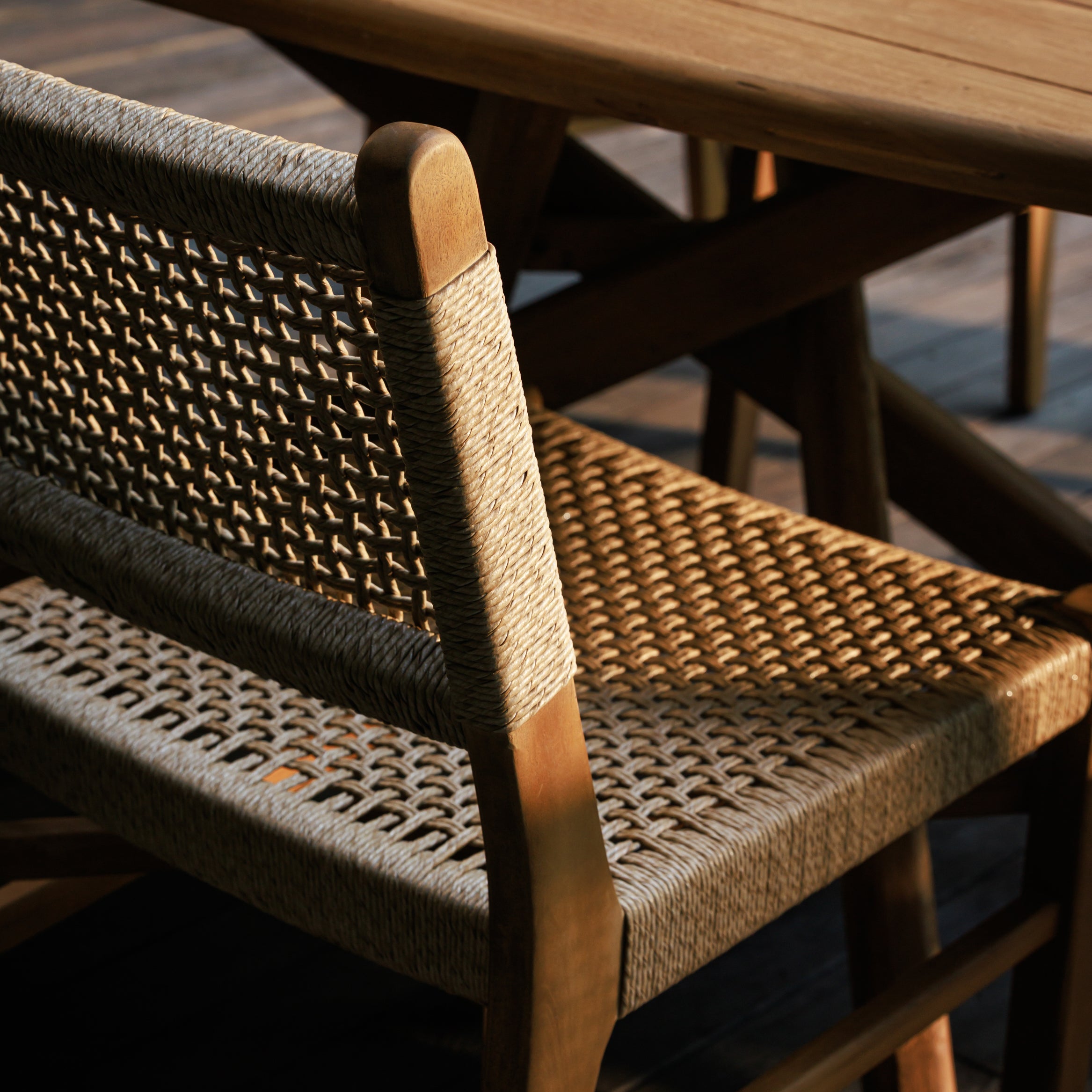 Chaise extérieure en teck massif recyclé et corde synthétique tressée, Brone associe robustesse du bois et légèreté du tressage. Pensée pour accompagner les repas en plein air, elle offre une assise confortable, durable et résistante aux conditions extérieures.