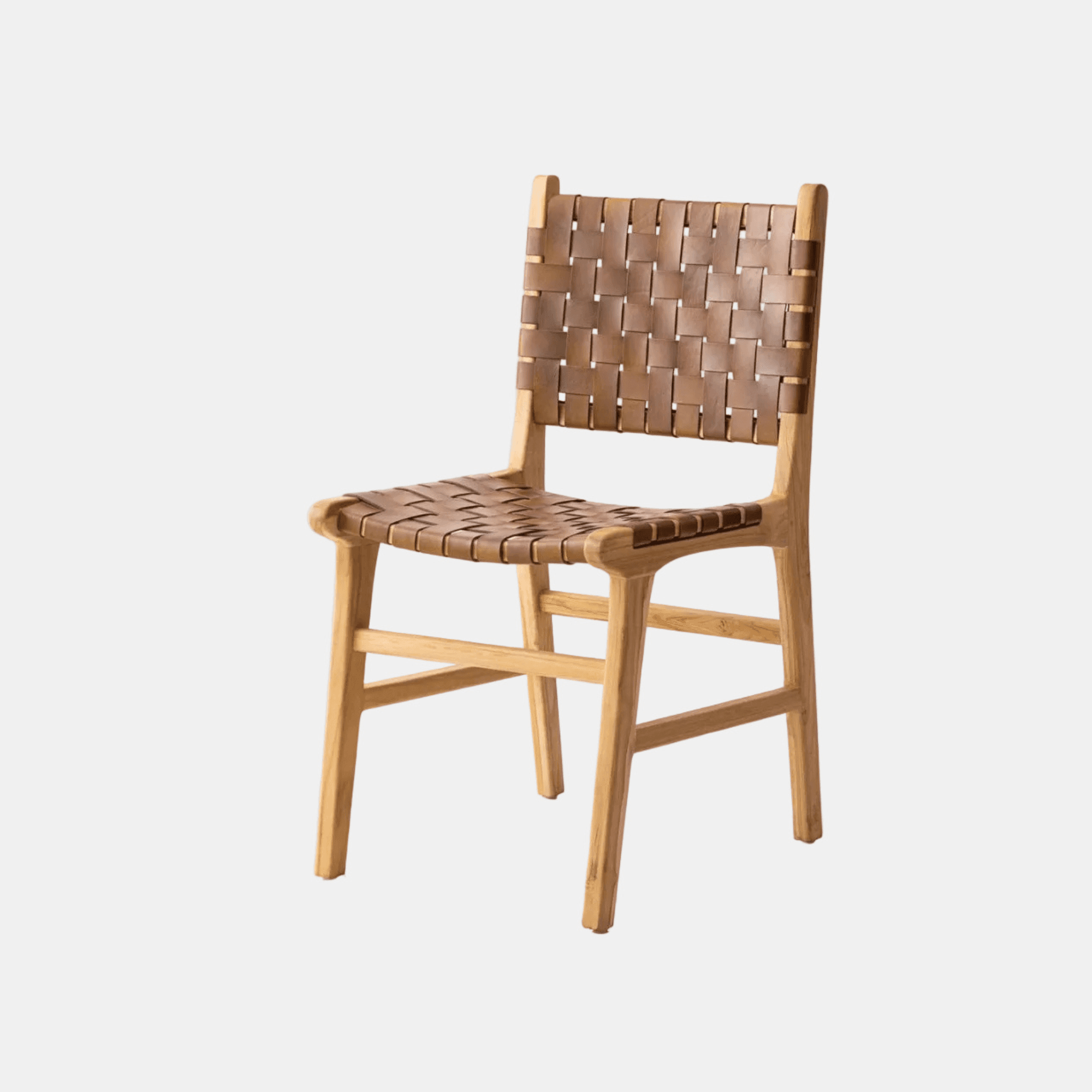 Bois de teck blanchi et cuir marron antique composent la chaise Karna, une assise artisanale au dessin net. Sa structure en teck massif de classe A et son tressage manuel trouvent naturellement leur place dans une salle à manger, un bureau ou autour d'une table de repas soignée.