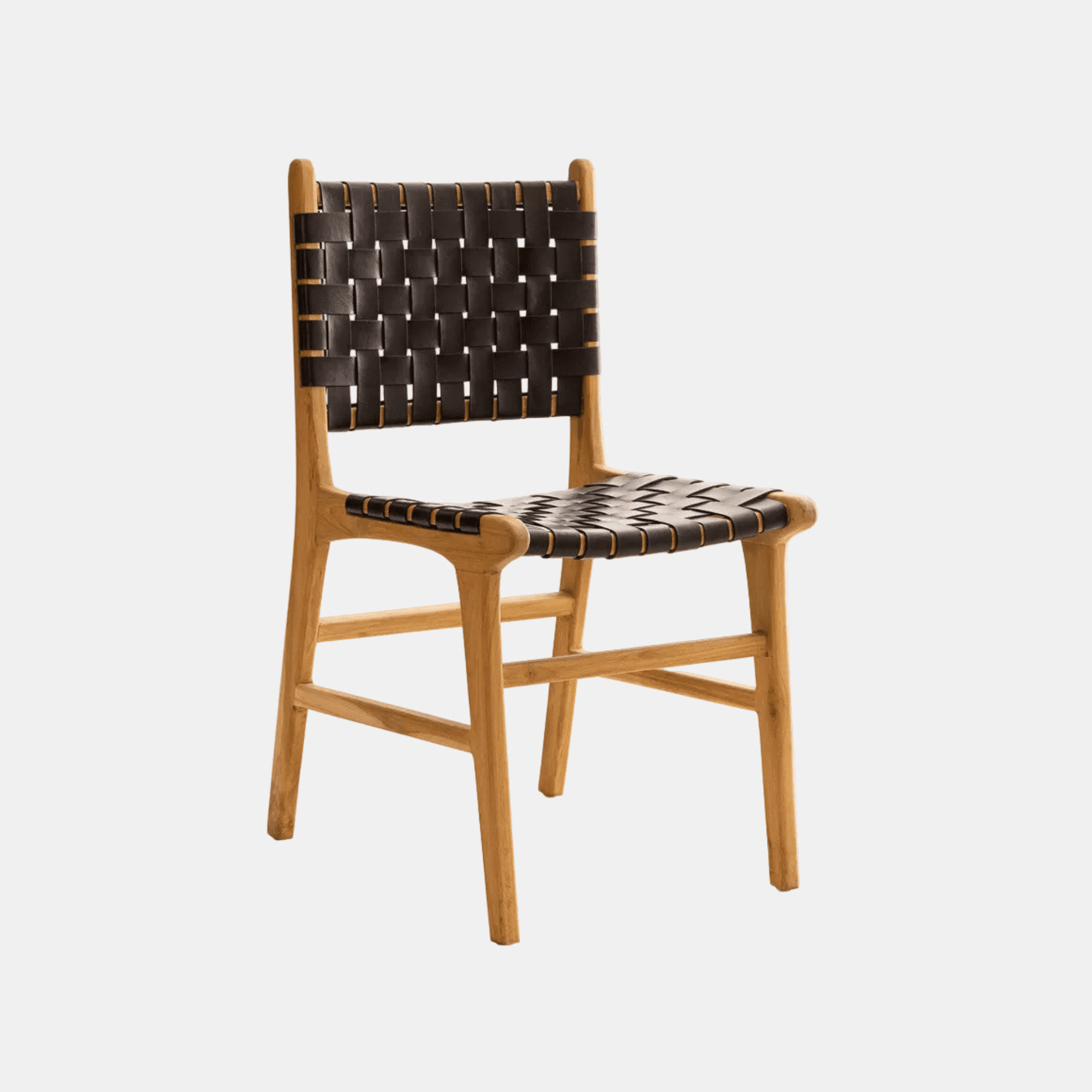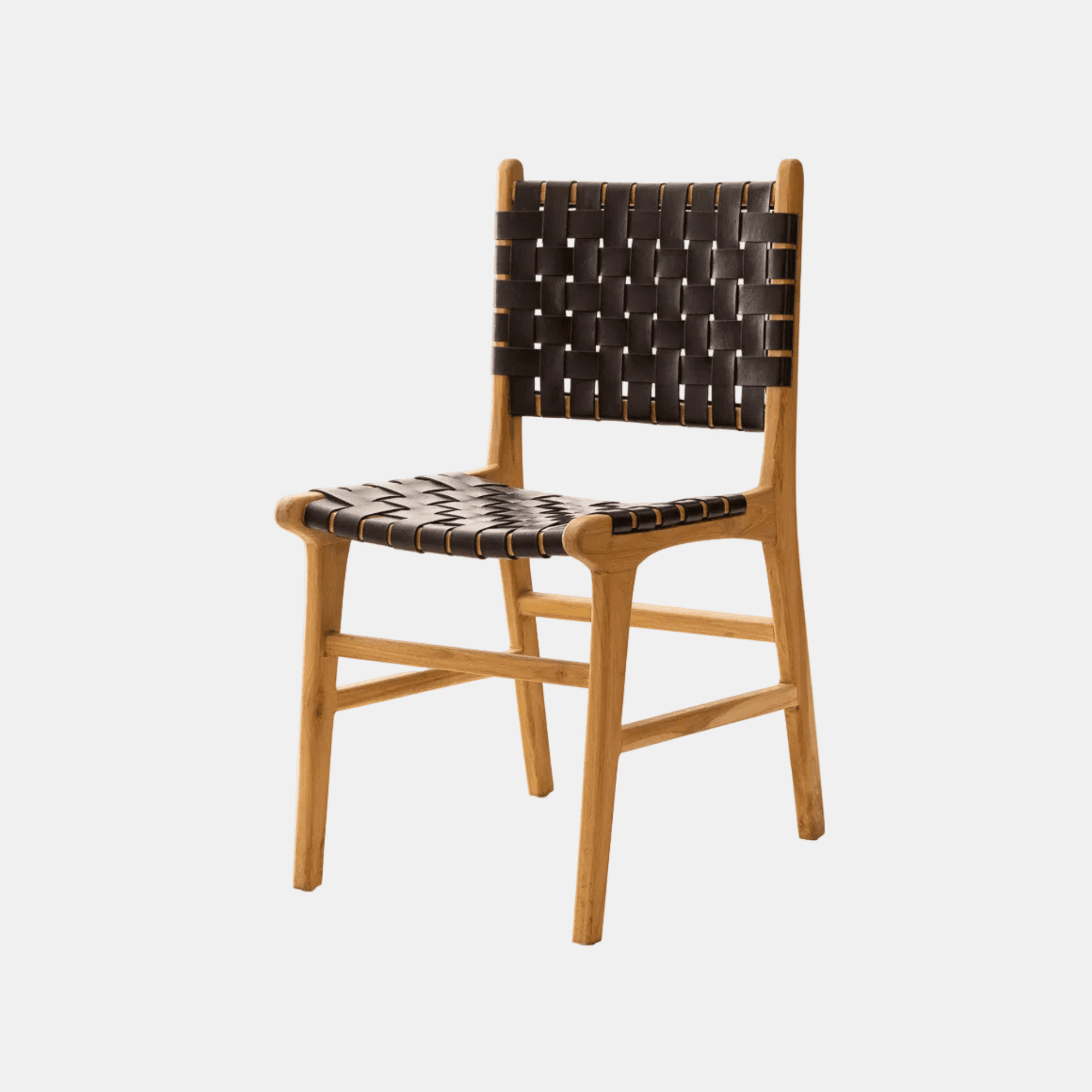 La chaise Karna se distingue par son assise et son dossier en cuir noir tressé, tendus sur une structure en teck massif blanchi. Fabriquée artisanalement en Indonésie, cette chaise trouve naturellement sa place autour d'une table de salle à manger ou dans un intérieur contemporain.