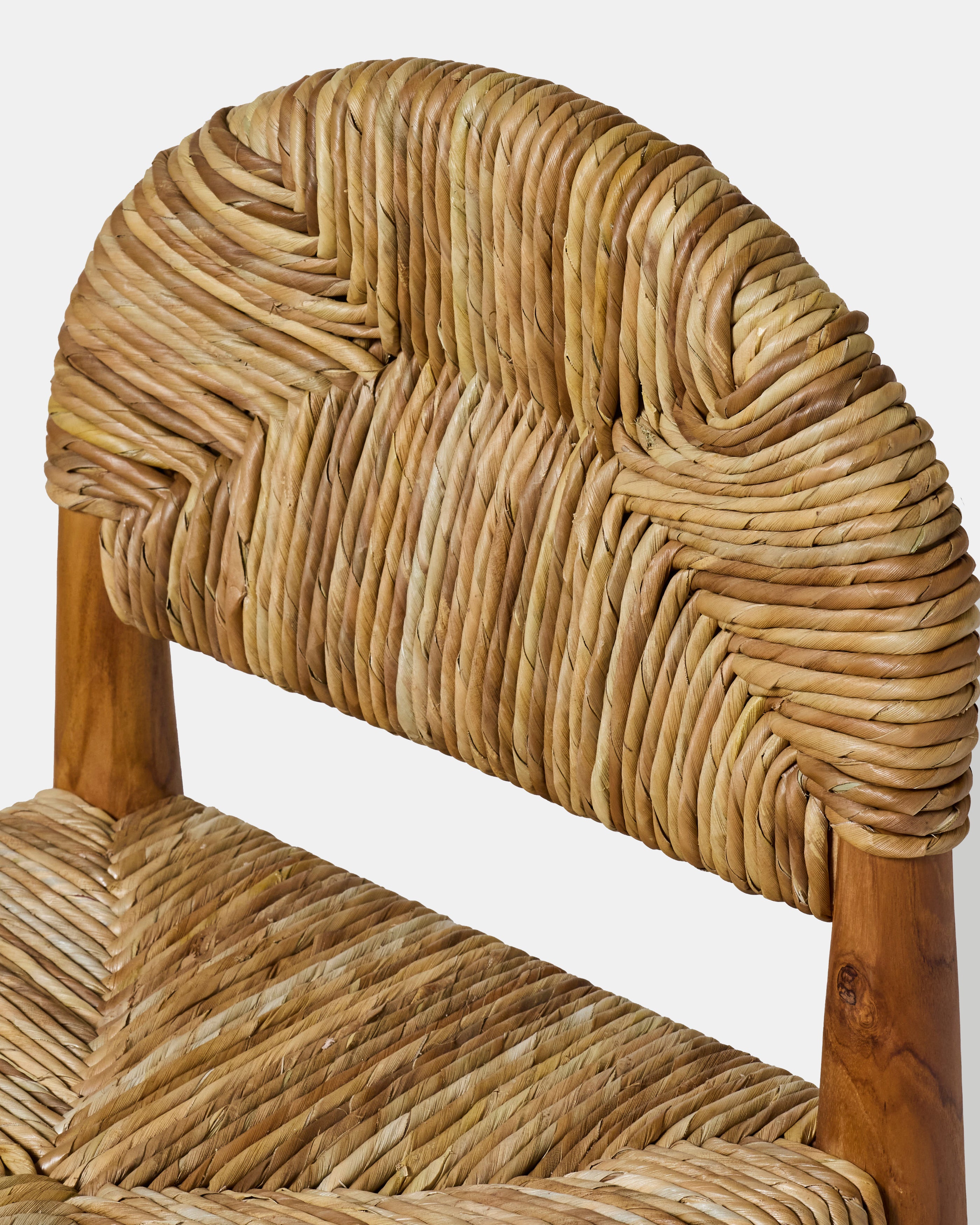 La chaise Éléphant impose une présence sereine par l'alliance du teck massif et de la fibre de banane tressée. Son assise végétale offre un contraste graphique avec la densité du bois doré, créant un équilibre entre force et légèreté. Une pièce artisanale conçue pour durer, idéale autour d'une table ou en assise de bureau.