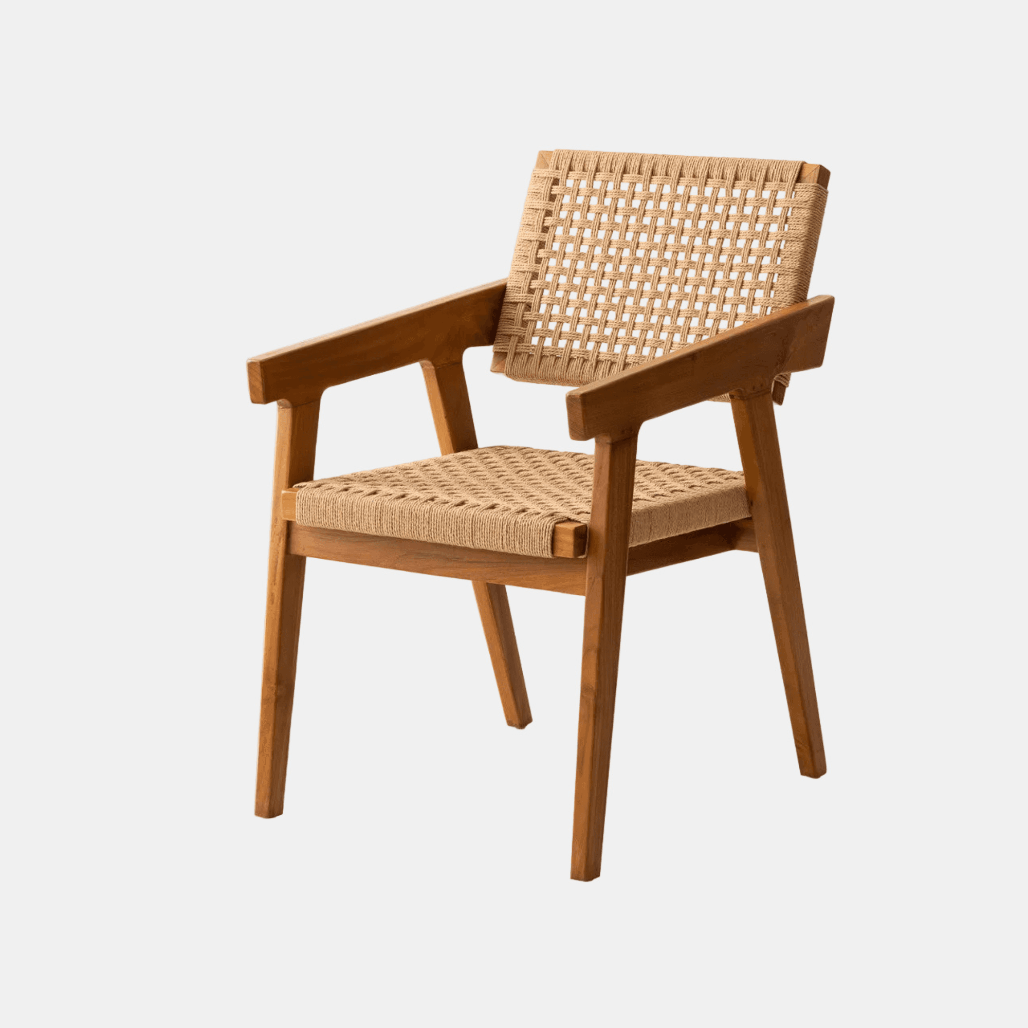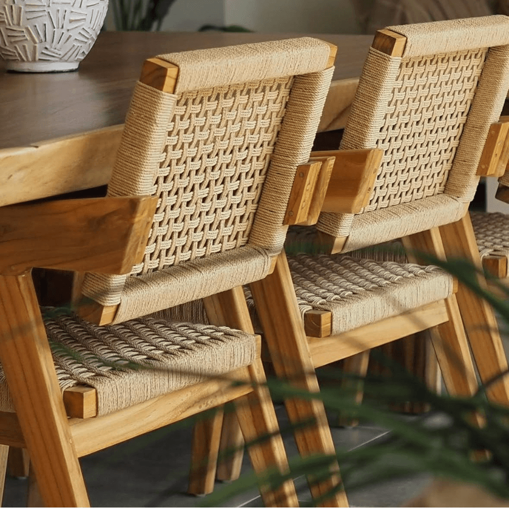 Dans une salle à manger soignée, un bureau épuré ou en siège d’appoint, la chaise Sasa trouve facilement sa place grâce à son dessin net et à l’équilibre de ses matières. La structure en teck massif de classe A affirme des lignes angulaires, portées par des pieds légèrement inclinés et des accoudoirs larges qui renforcent la stabilité de l’ensemble. En contraste, l’assise et le dossier en fibres de bananier tressées à la main apportent une variation de texture plus organique, avec ce qu’il faut de souplesse pour accompagner l’usage au quotidien. L’association du bois naturel et du tressage artisanal donne à cette chaise une allure à la fois sobre et travaillée, sans effet décoratif appuyé. Son dessin évoque un esprit scandinave vintage, tandis que la sincérité des matériaux l’inscrit aussi dans des intérieurs plus bohèmes, rustiques chic ou wabi sabi. Sasa compose ainsi une assise polyvalente, aussi juste autour d’une table que placée seule dans une chambre ou un coin lecture, où la précision de la ligne rencontre la richesse d’une fabrication artisanale.