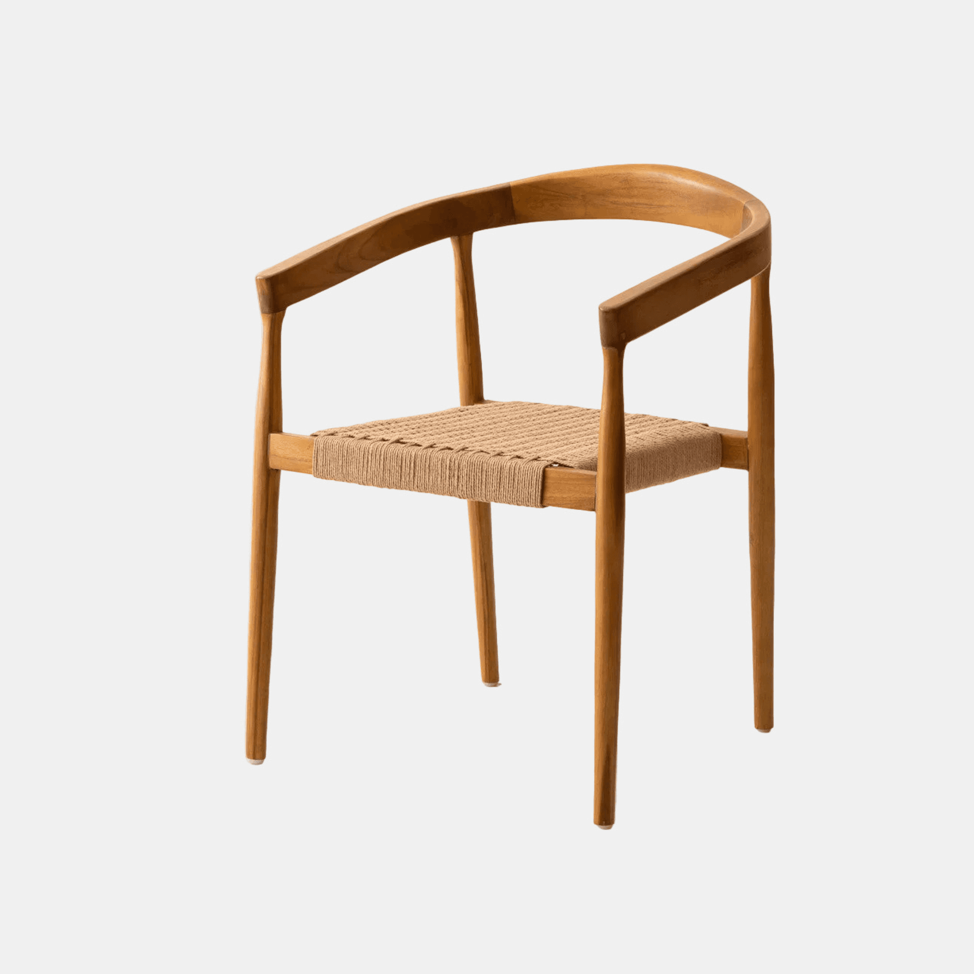 En teck massif naturel et cordage tressé, la chaise Selly apporte une écriture artisanale soignée à la salle à manger. Son dessin équilibré, son dossier fin et son assise en corde composent un ensemble confortable, adapté aux intérieurs épurés, bohèmes chic ou d'inspiration wabi sabi.
