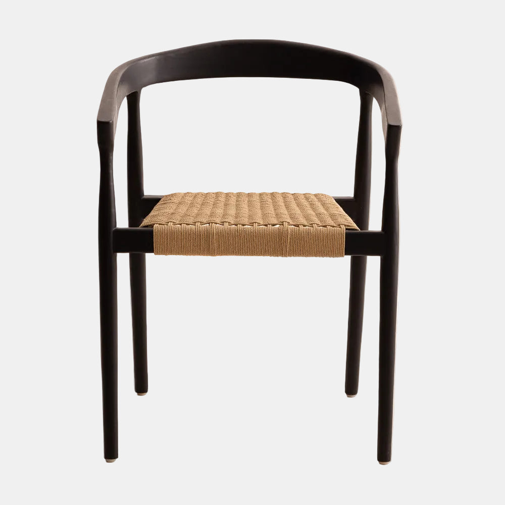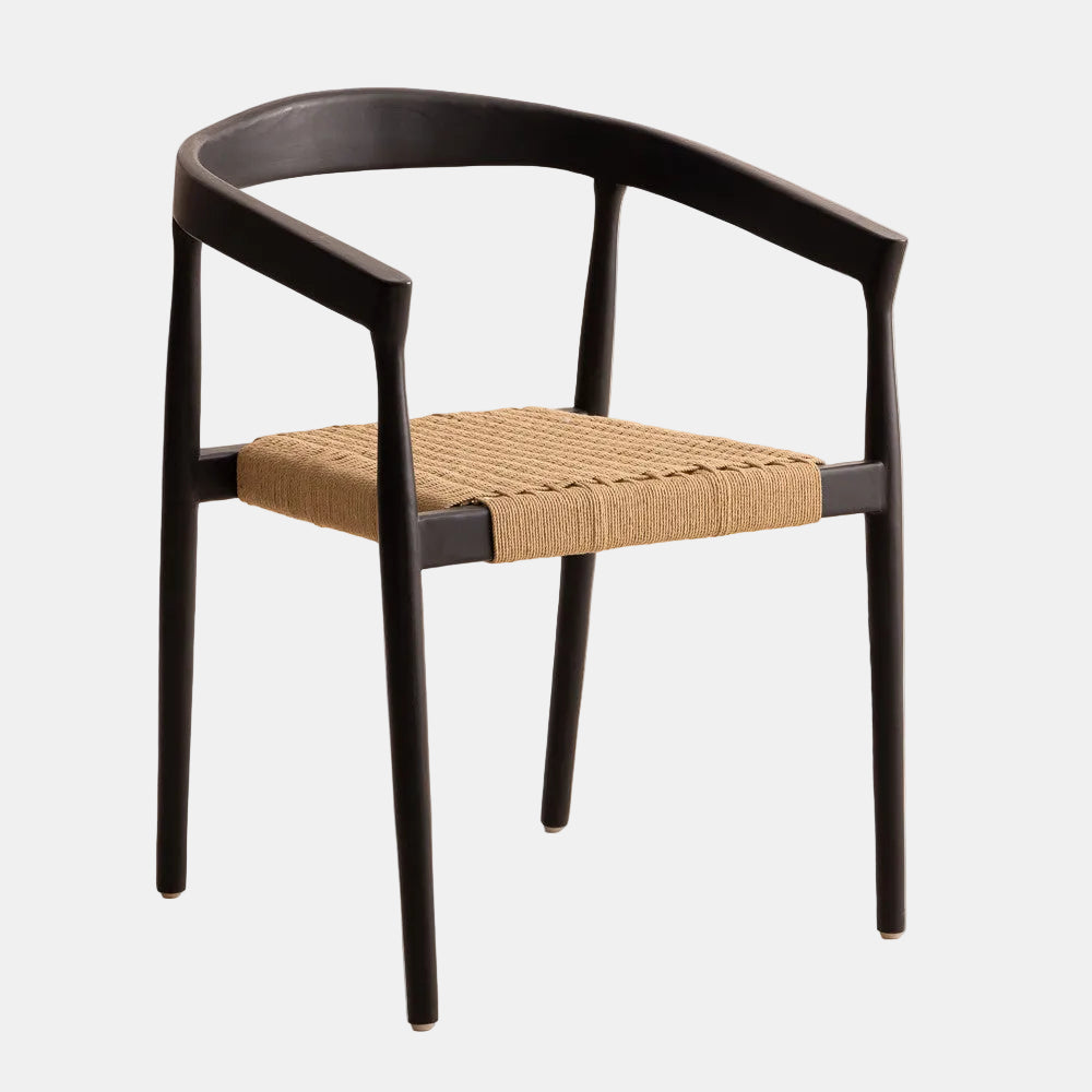 La chaise Selly Black en teck noir et corde naturelle au design intemporel, idéale pour une salle à manger élégante et chaleureuse.