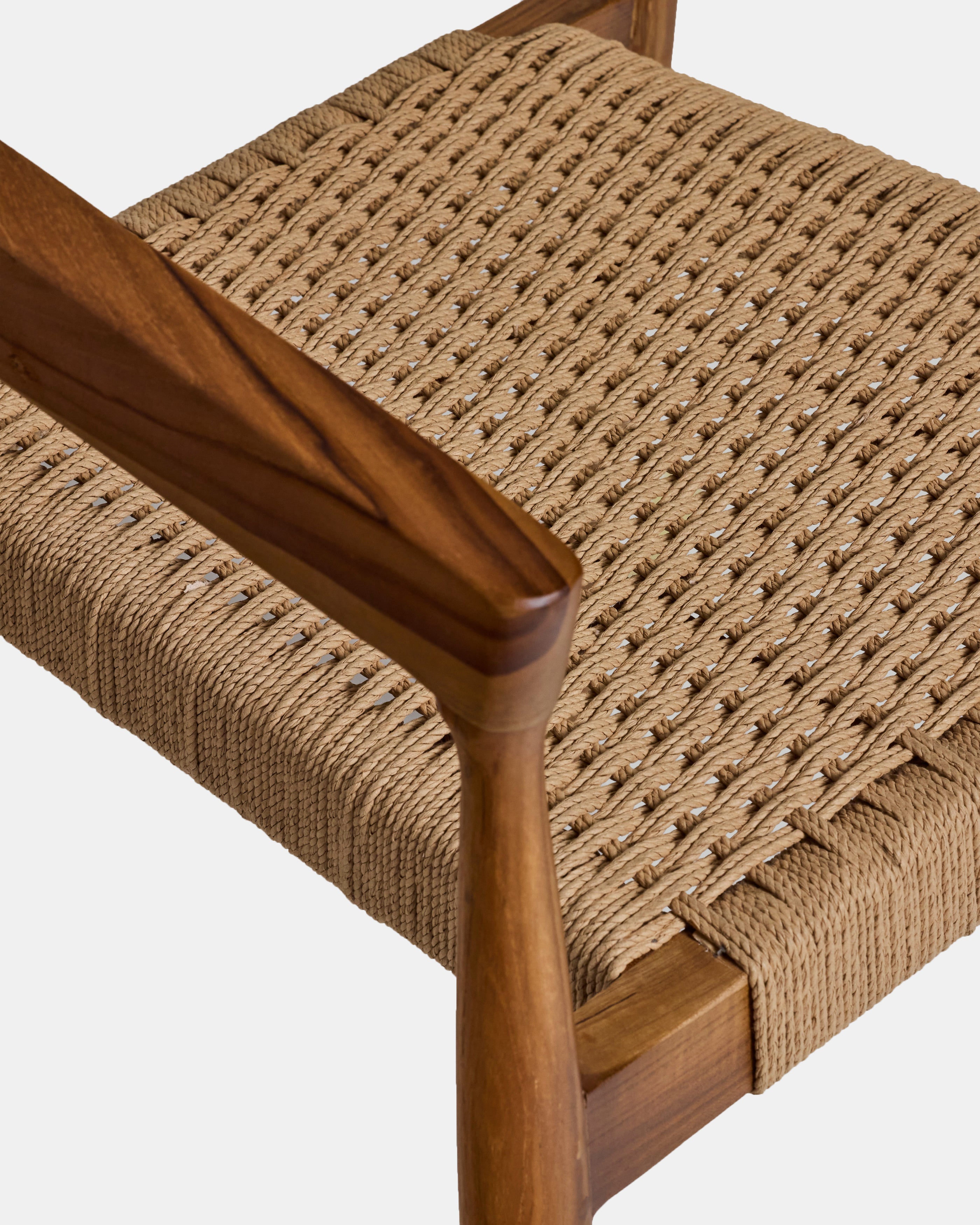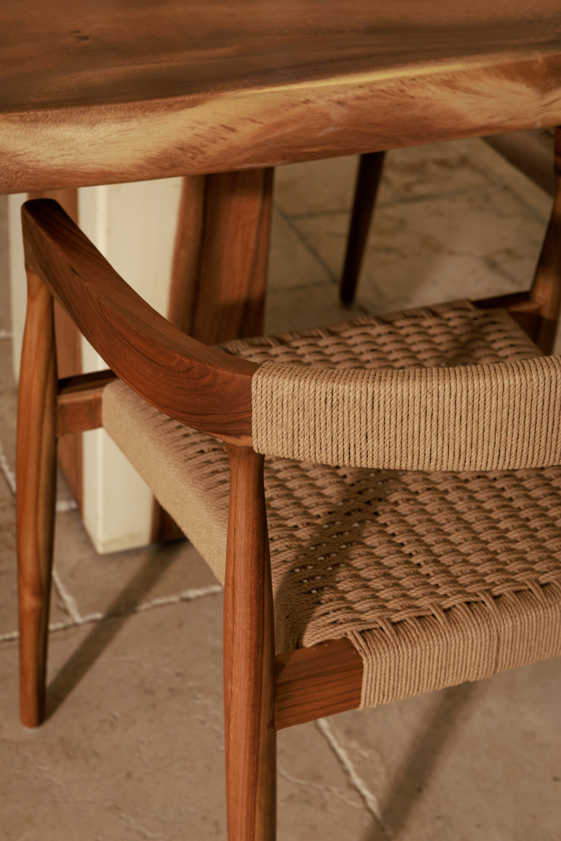 La chaise Selly Loom se distingue par son tressage en corde naturelle réalisé à la main, associé à une structure en teck massif de classe A à la finition brute et naturelle. Son dossier courbe et son assise aérée trouvent naturellement leur place dans une salle à manger soignée.
